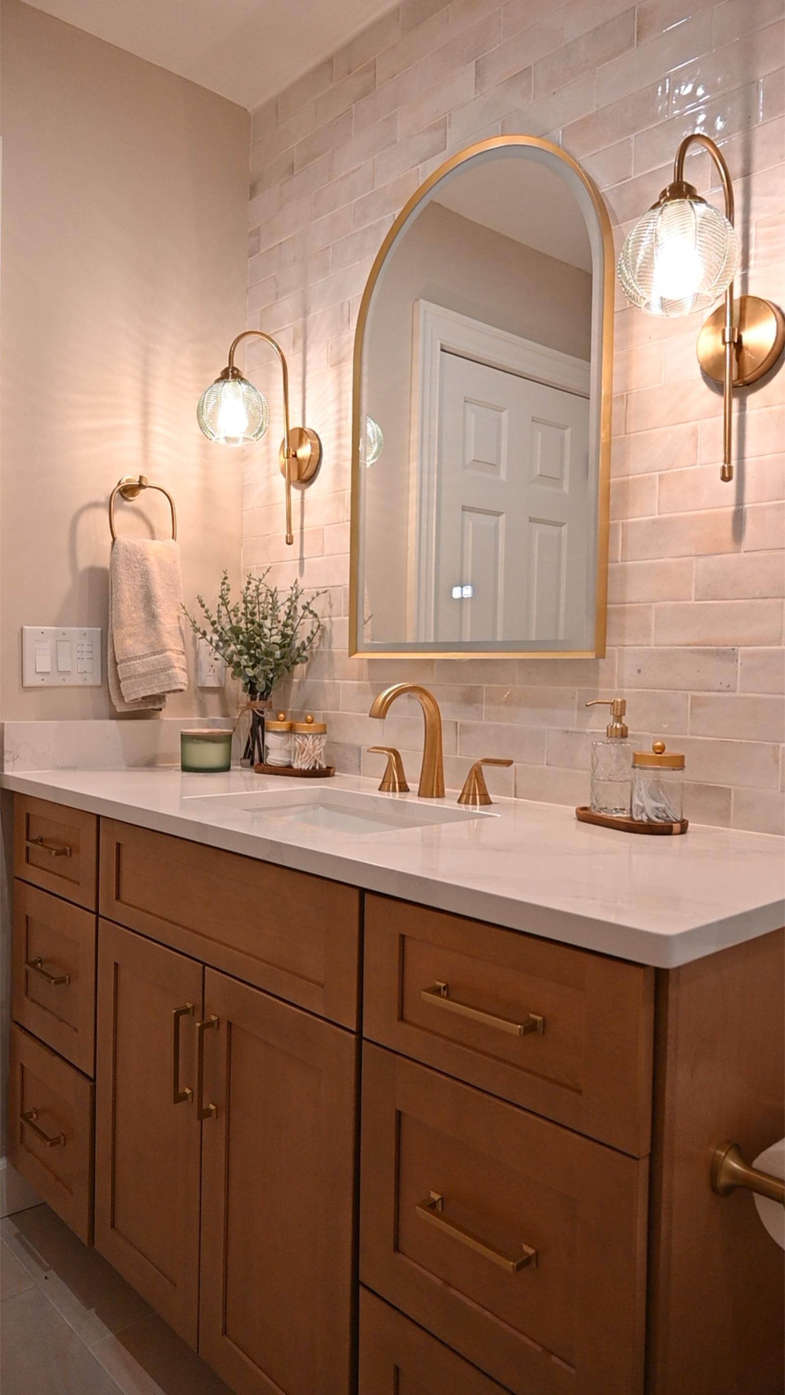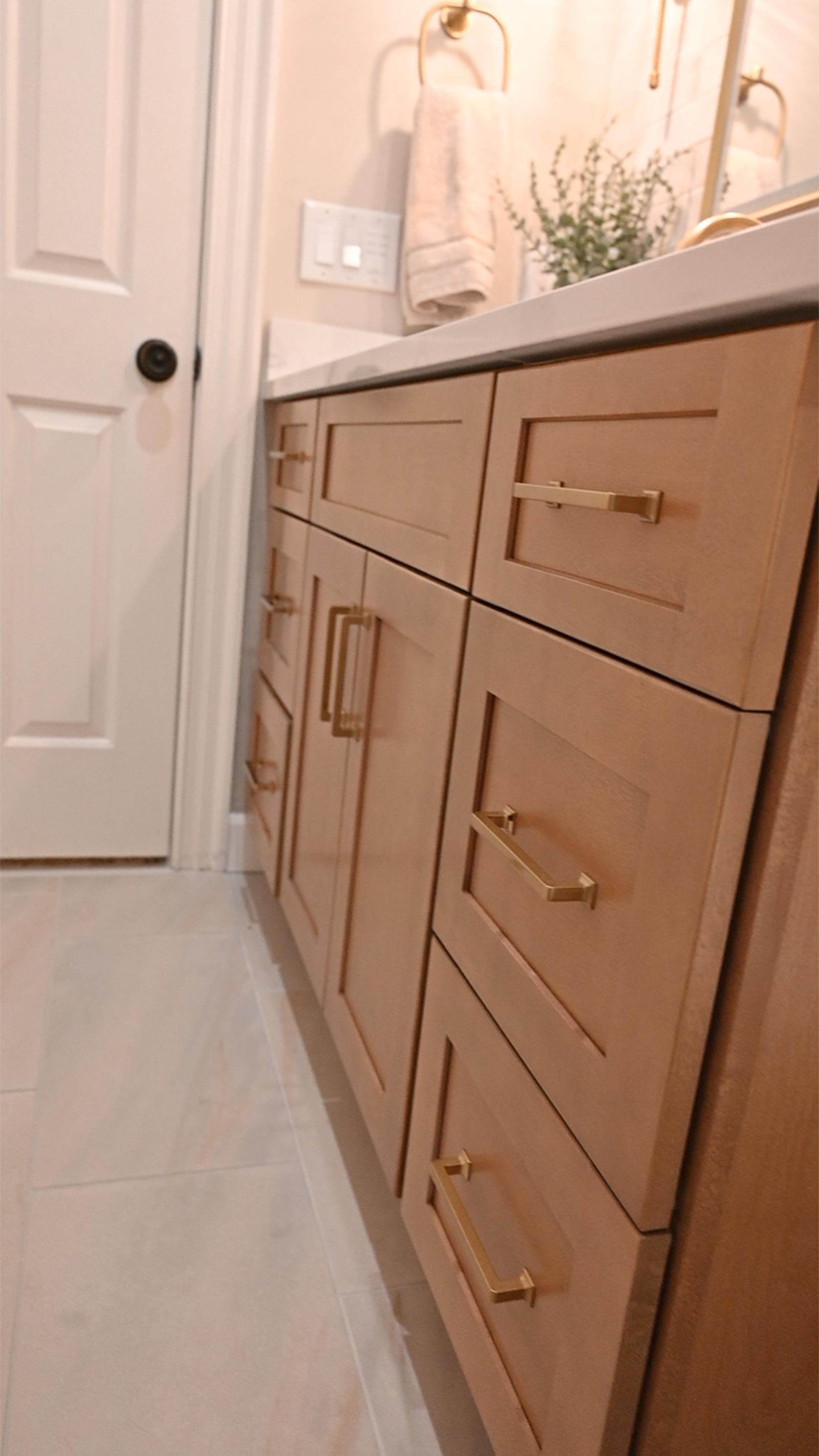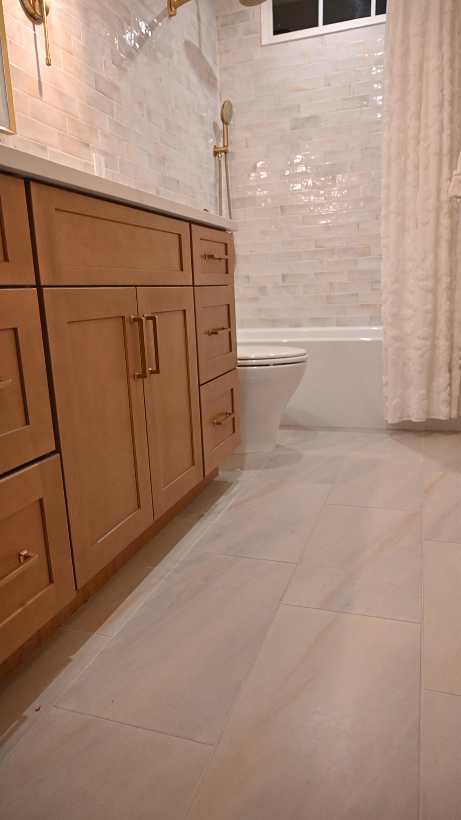 This bathroom was designed to feel like a private retreat. Custom wood cabinetry anchors the space, adding richness and contrast against the soft, neutral tilework.
