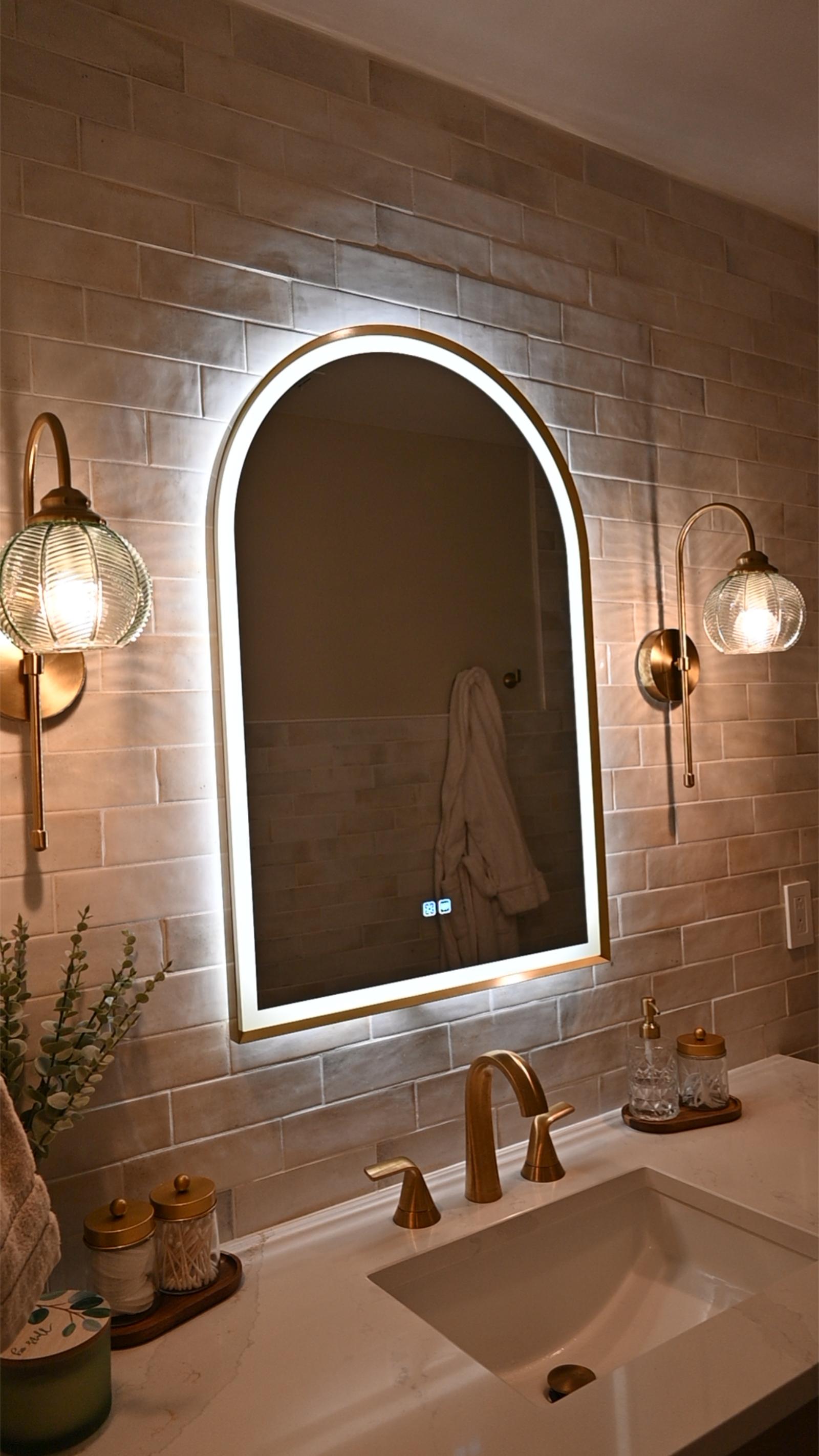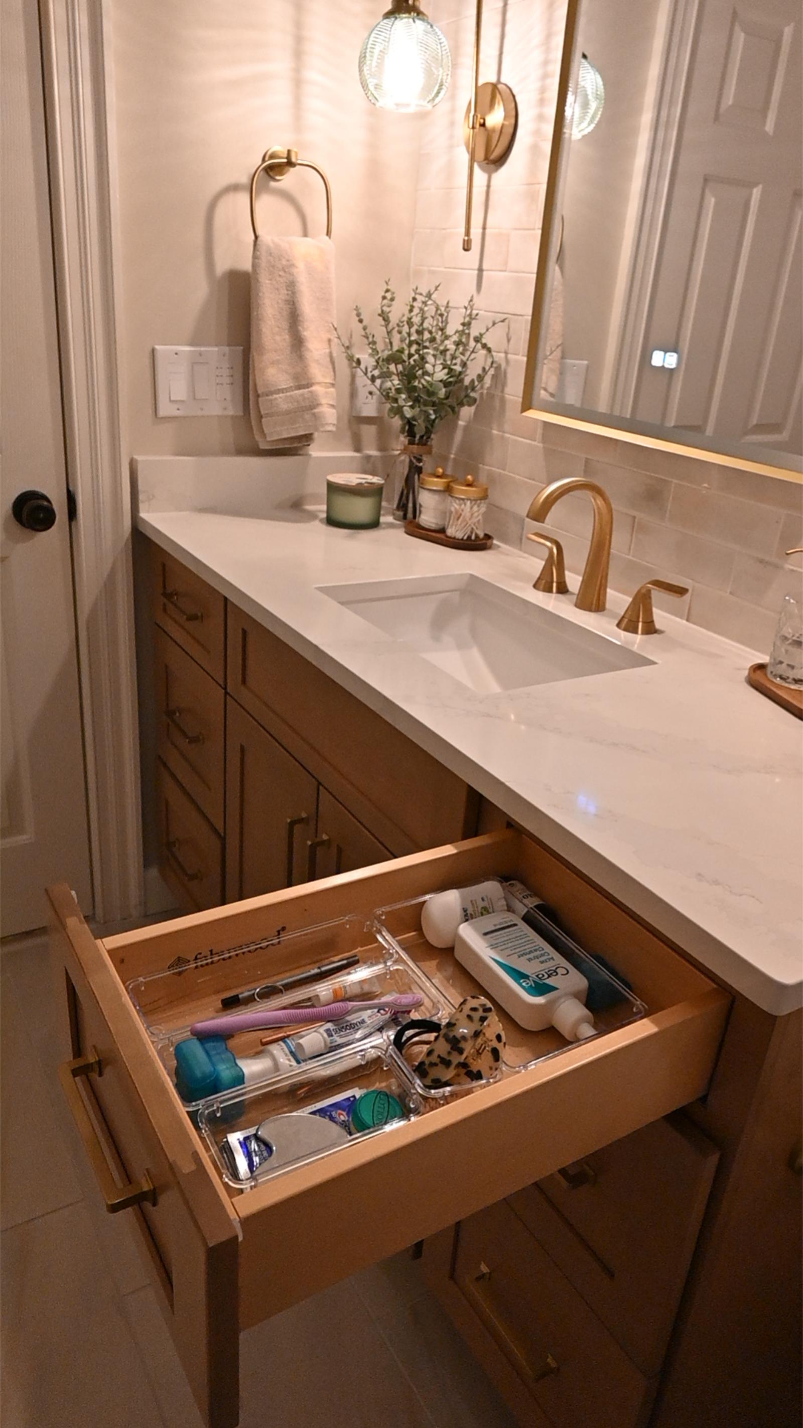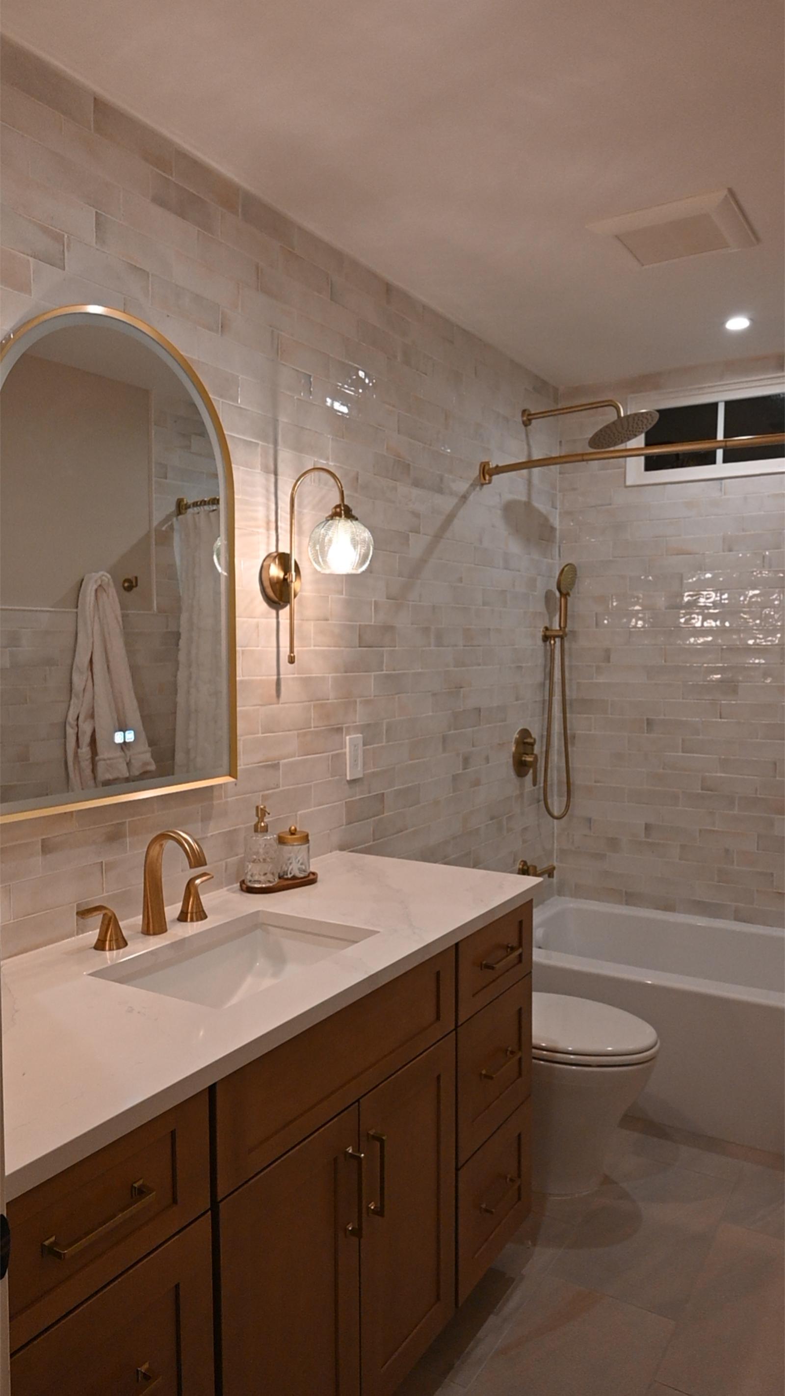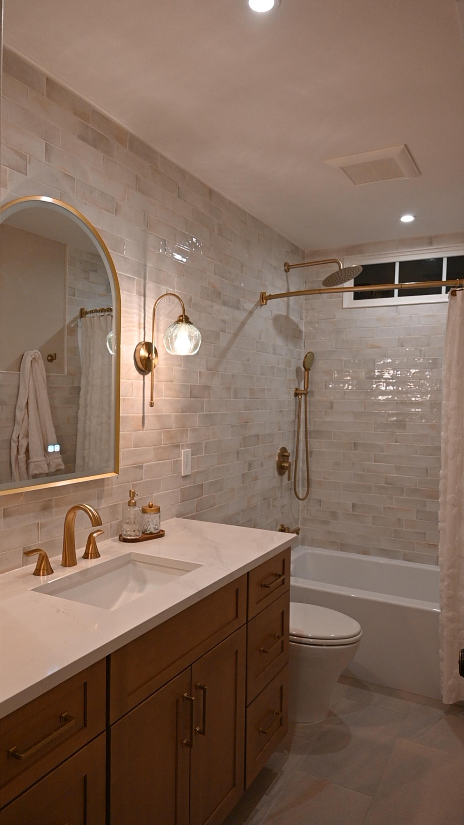 This bathroom was designed to feel like a private retreat. Custom wood cabinetry anchors the space, adding richness and contrast against the soft, neutral tilework.