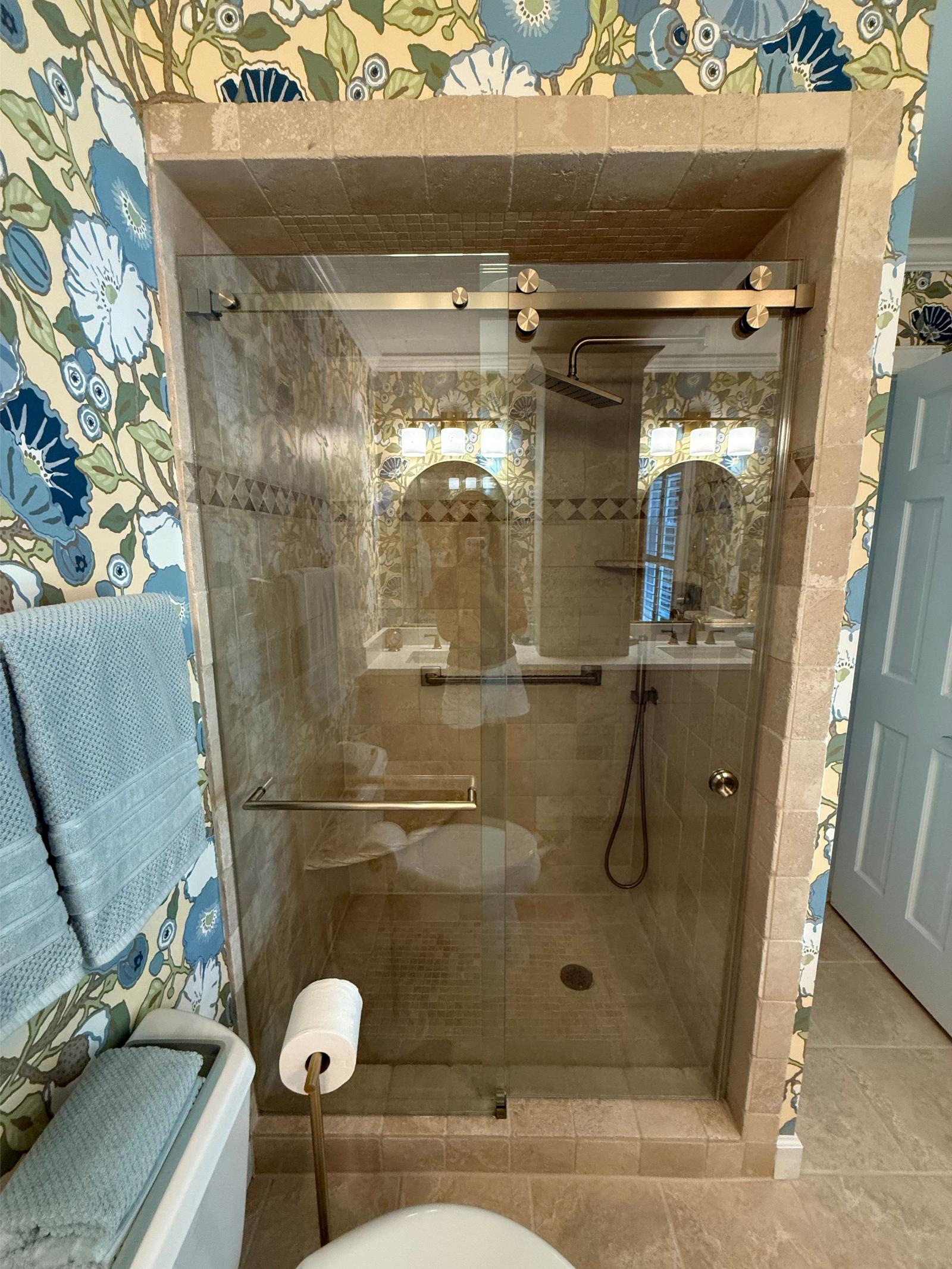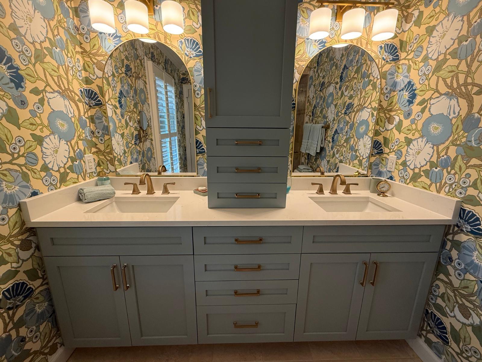 This master bathroom balances bold pattern with refined craftsmanship. Custom cabinetry in a muted blue anchors the space, paired with brass hardware and clean-lined countertops for a timeless feel.