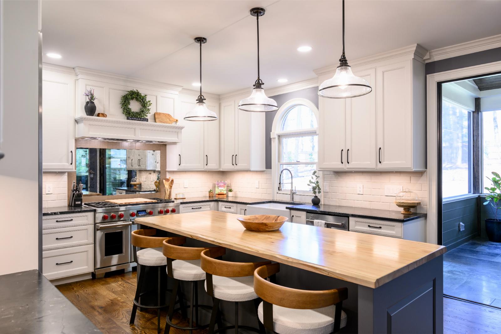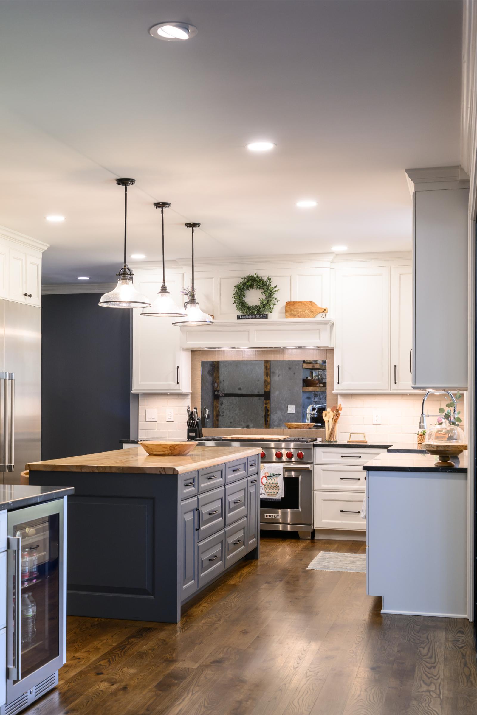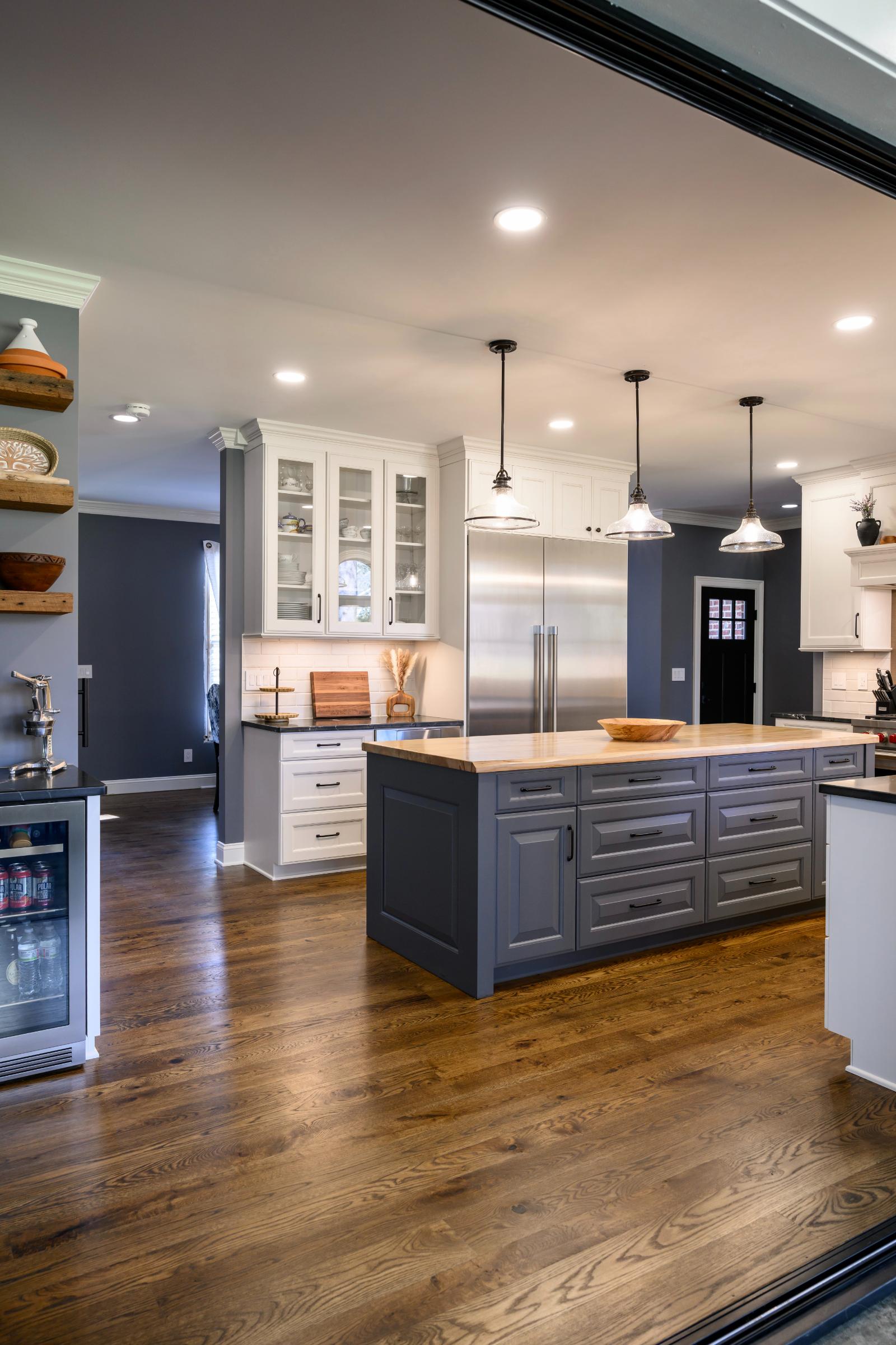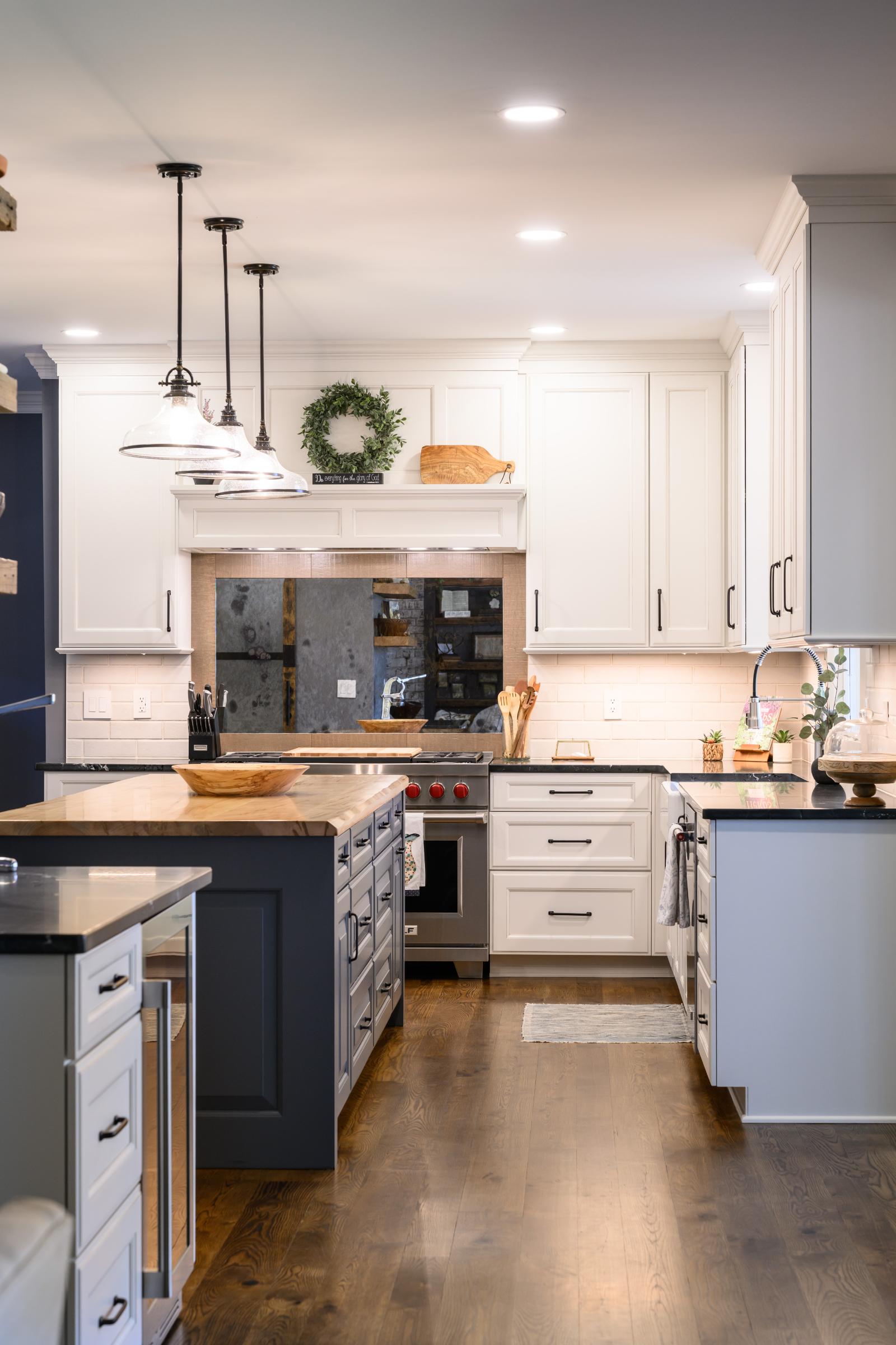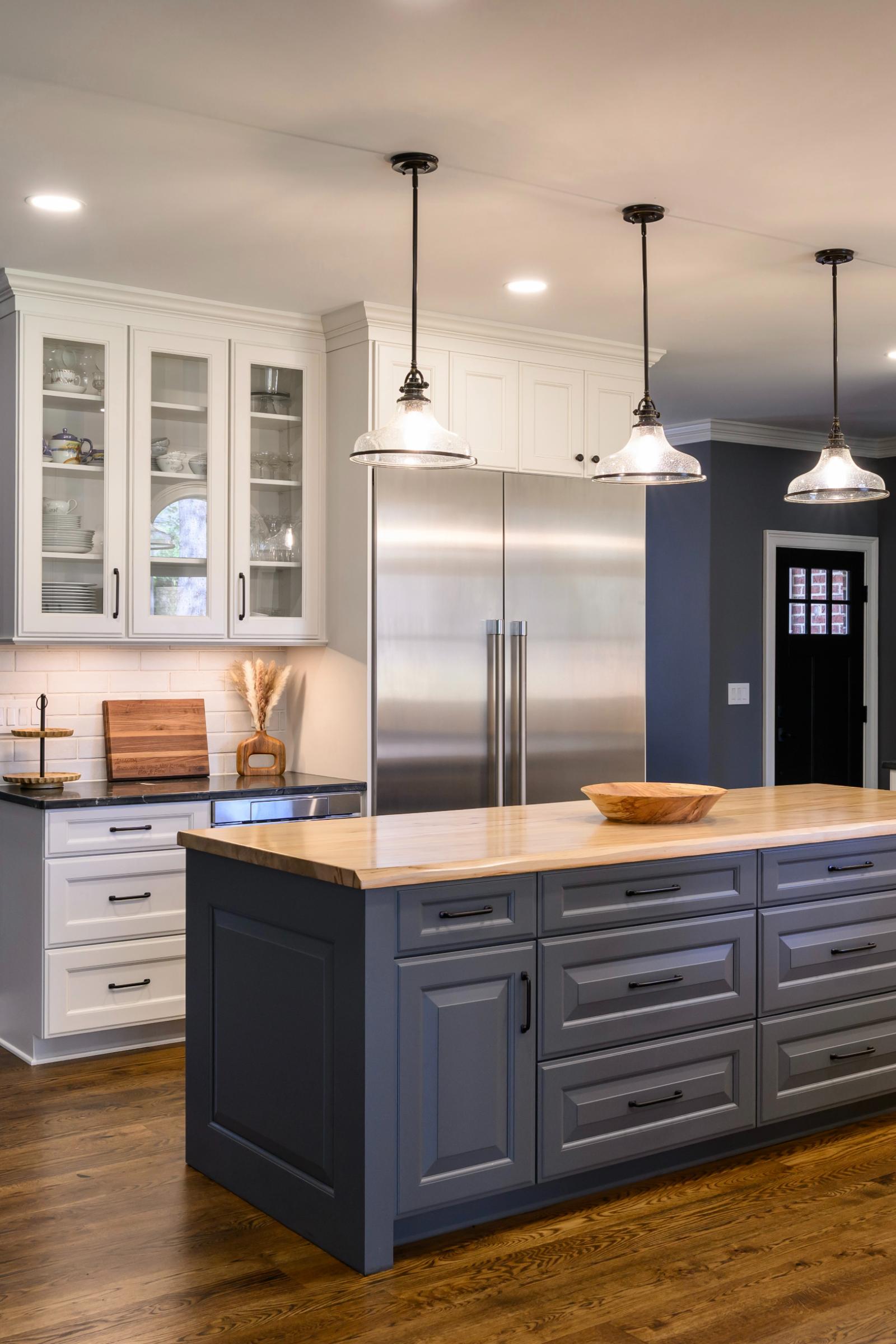 White perimeter cabinets meet a bold blue-gray island in this classic, character-filled kitchen. Warm wood tones, black hardware, and industrial-style pendant lights give the space a grounded, farmhouse feel that's both timeless and lived-in.