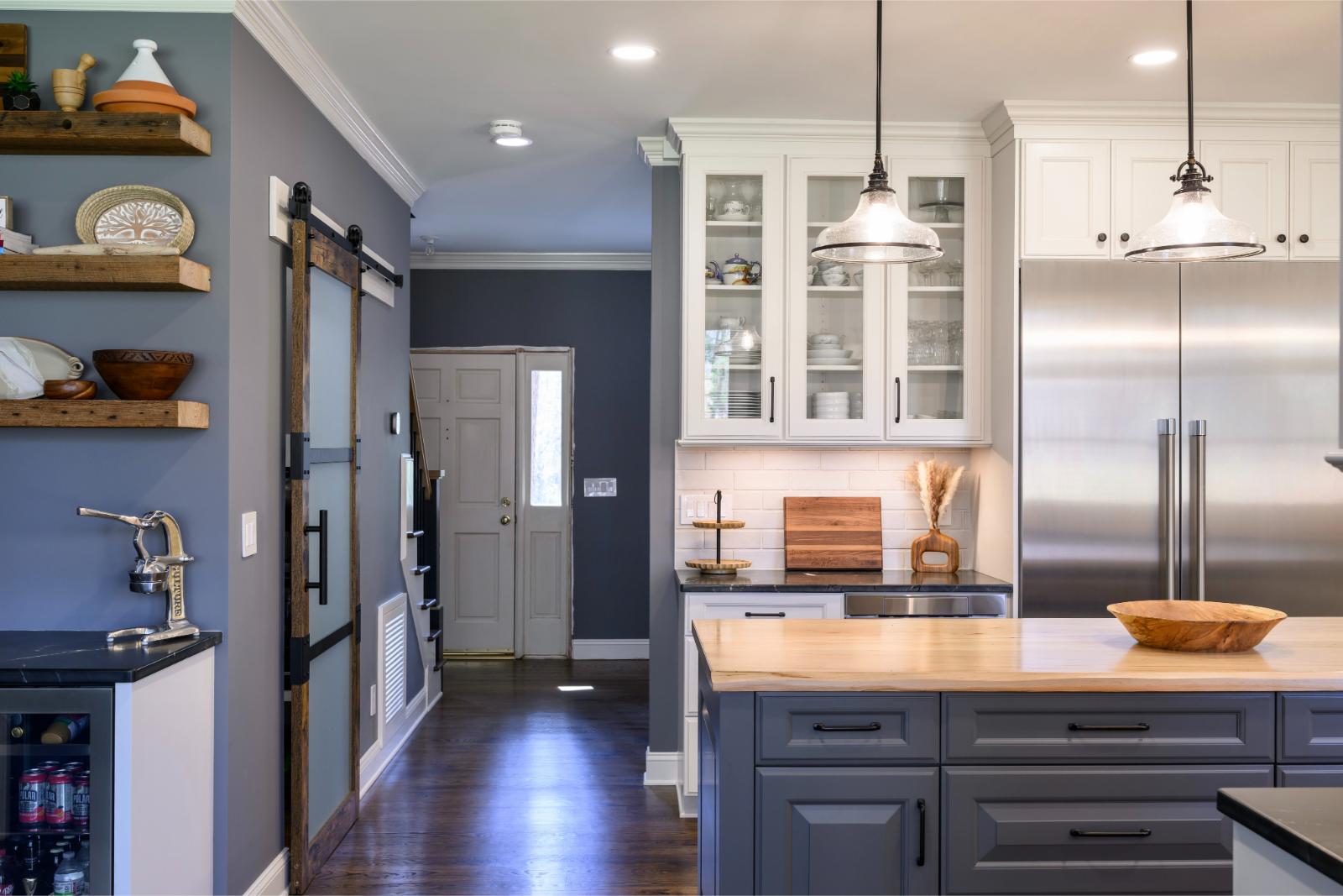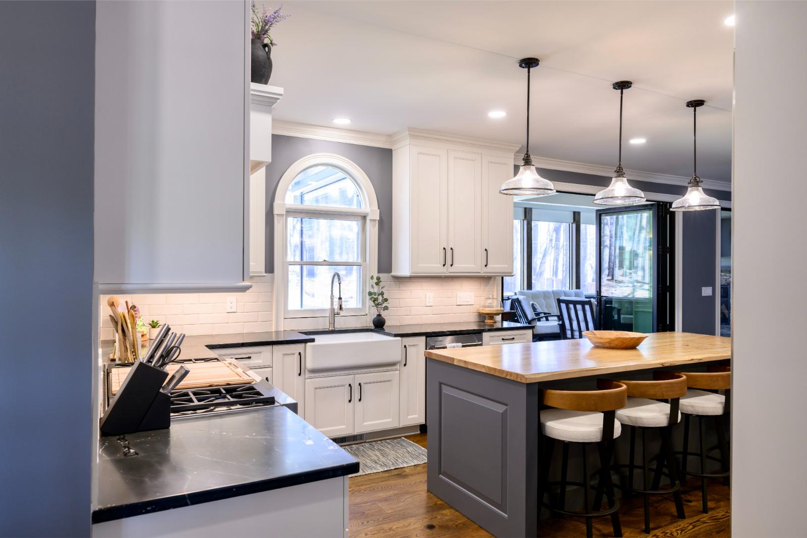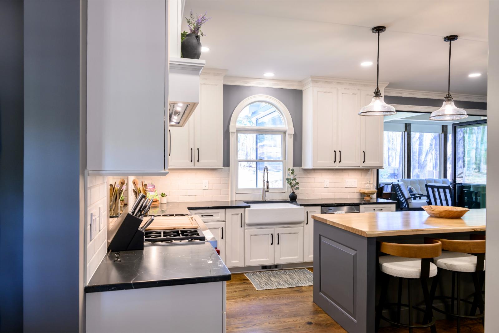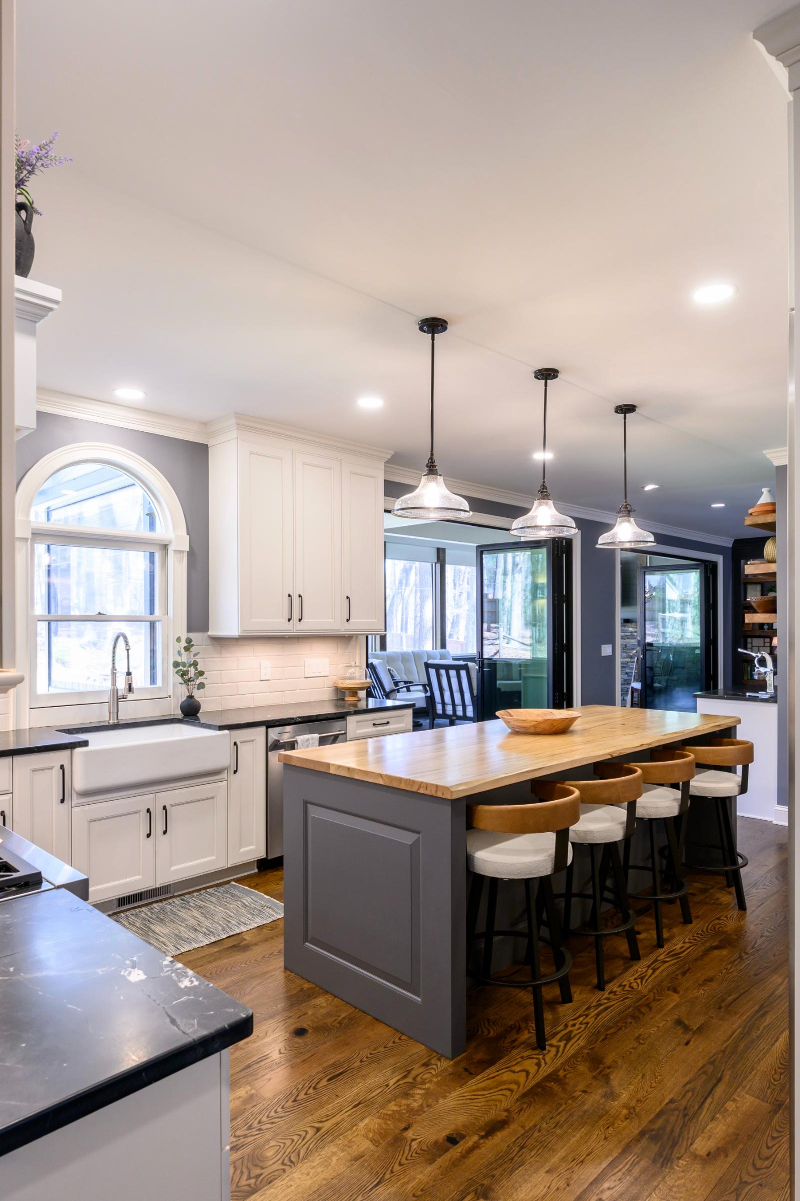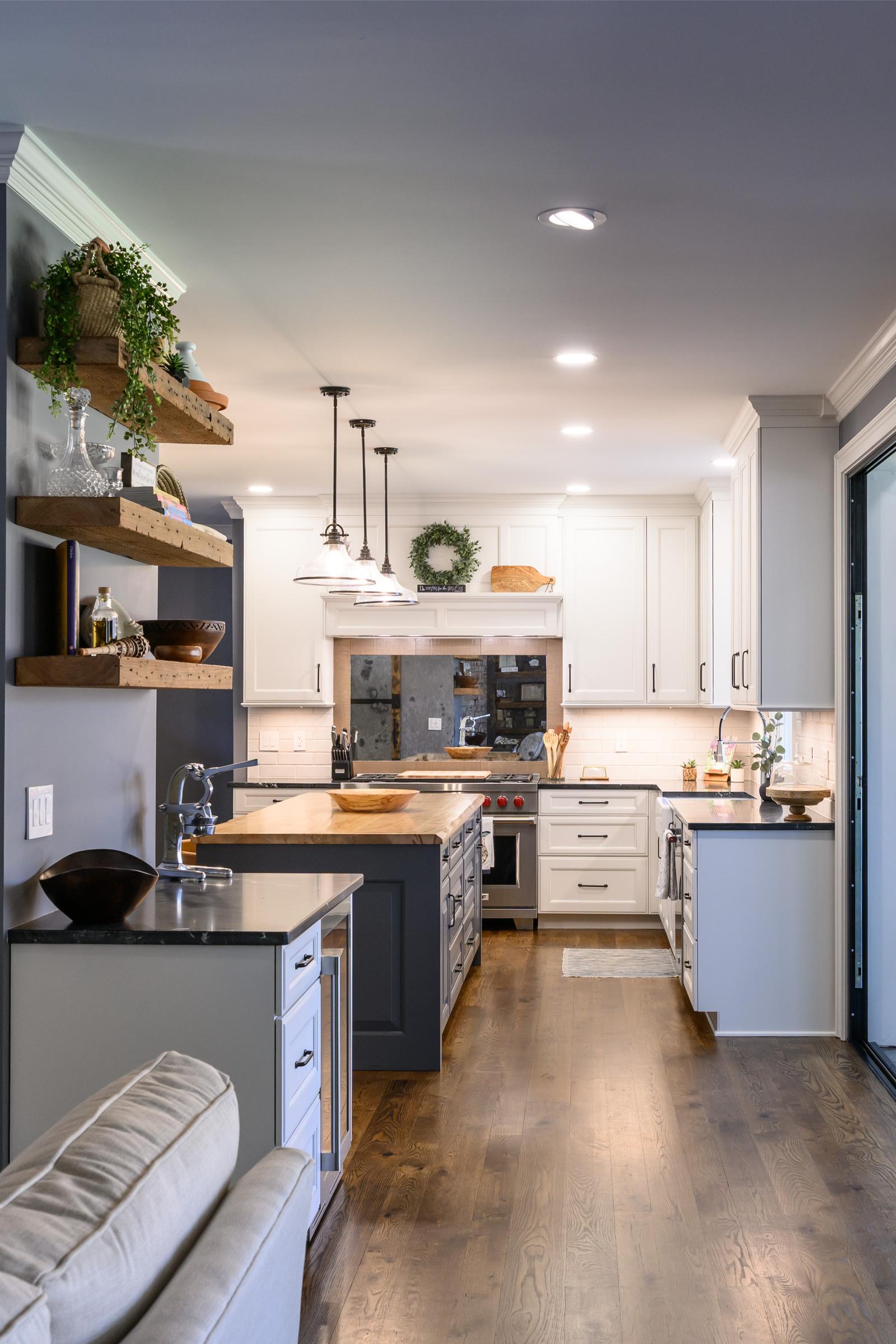 White perimeter cabinets meet a bold blue-gray island in this classic, character-filled kitchen. Warm wood tones, black hardware, and industrial-style pendant lights give the space a grounded, farmhouse feel that's both timeless and lived-in.