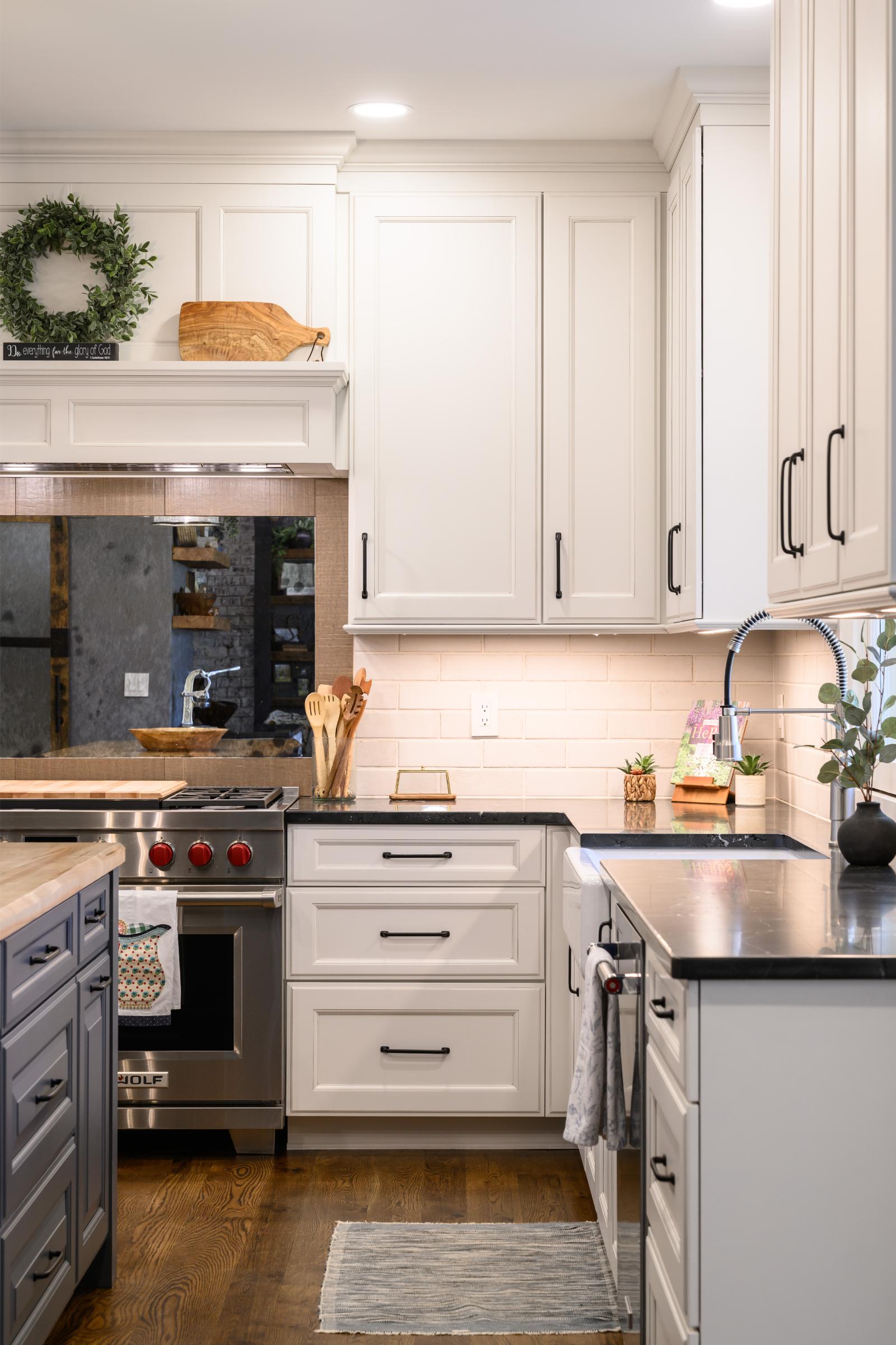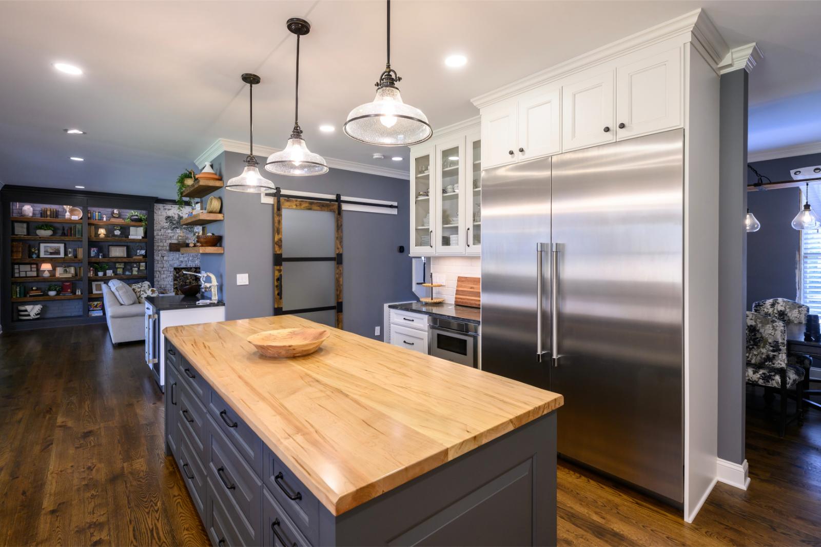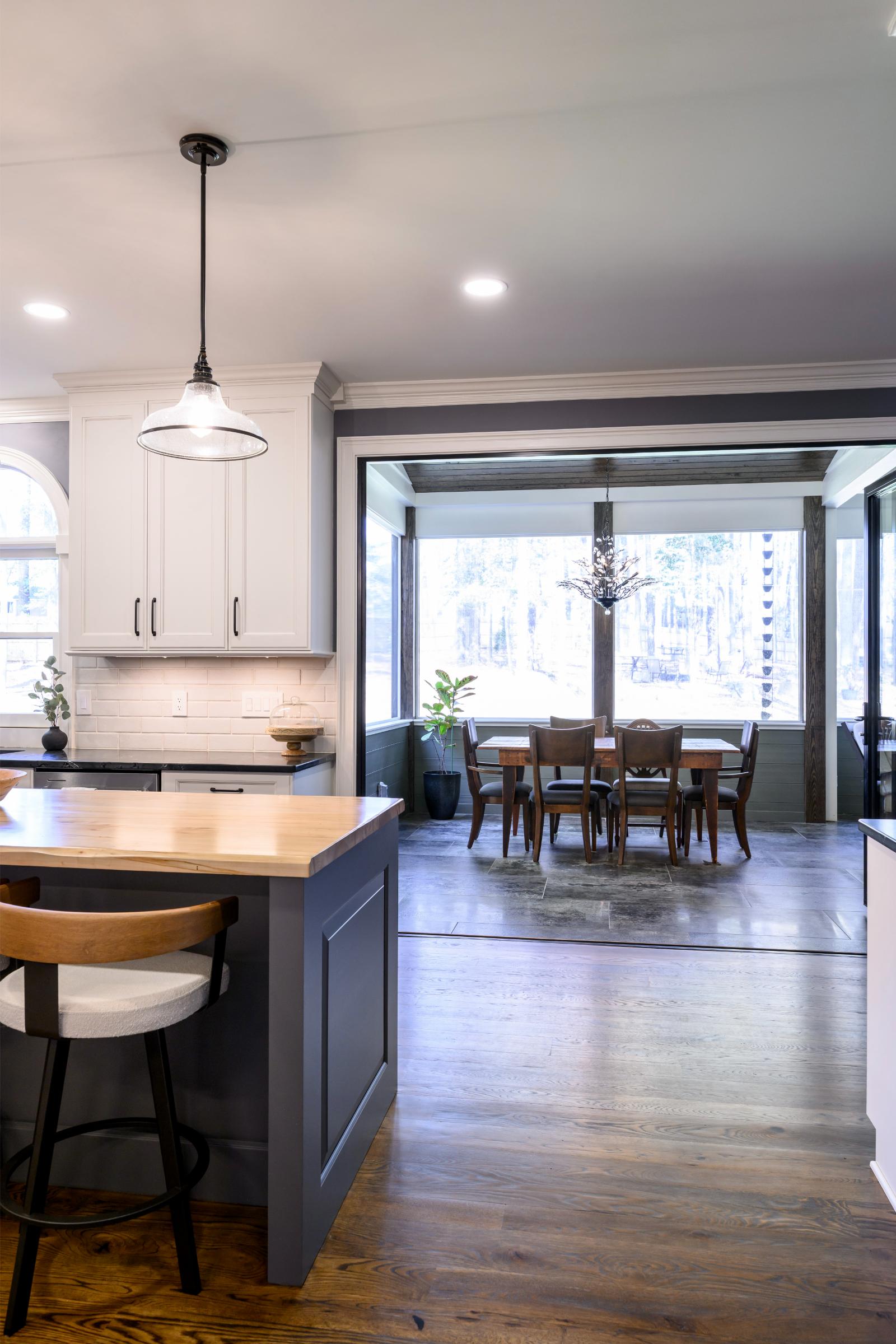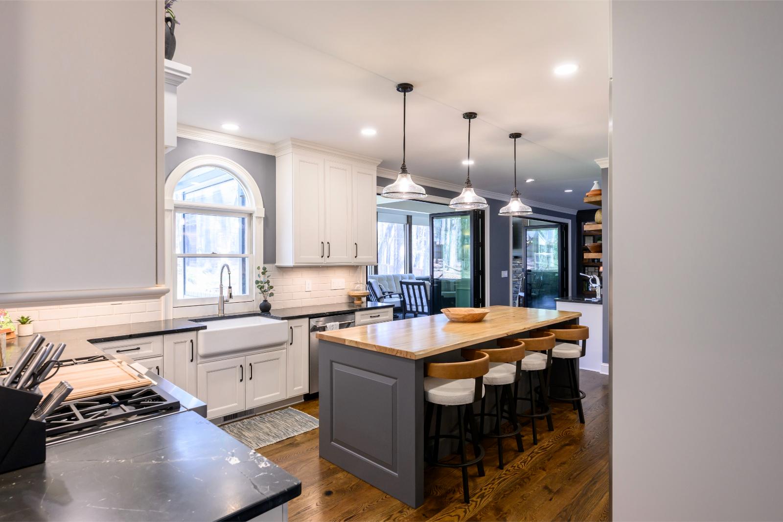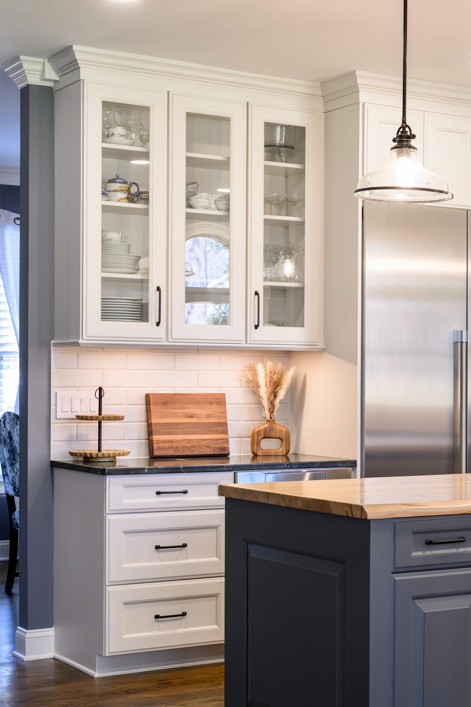 White perimeter cabinets meet a bold blue-gray island in this classic, character-filled kitchen. Warm wood tones, black hardware, and industrial-style pendant lights give the space a grounded, farmhouse feel that's both timeless and lived-in.