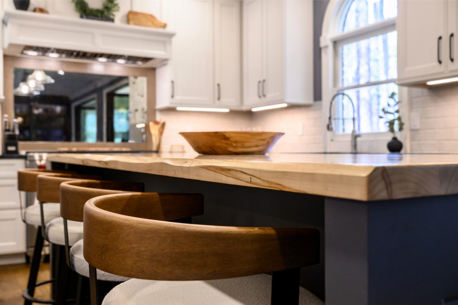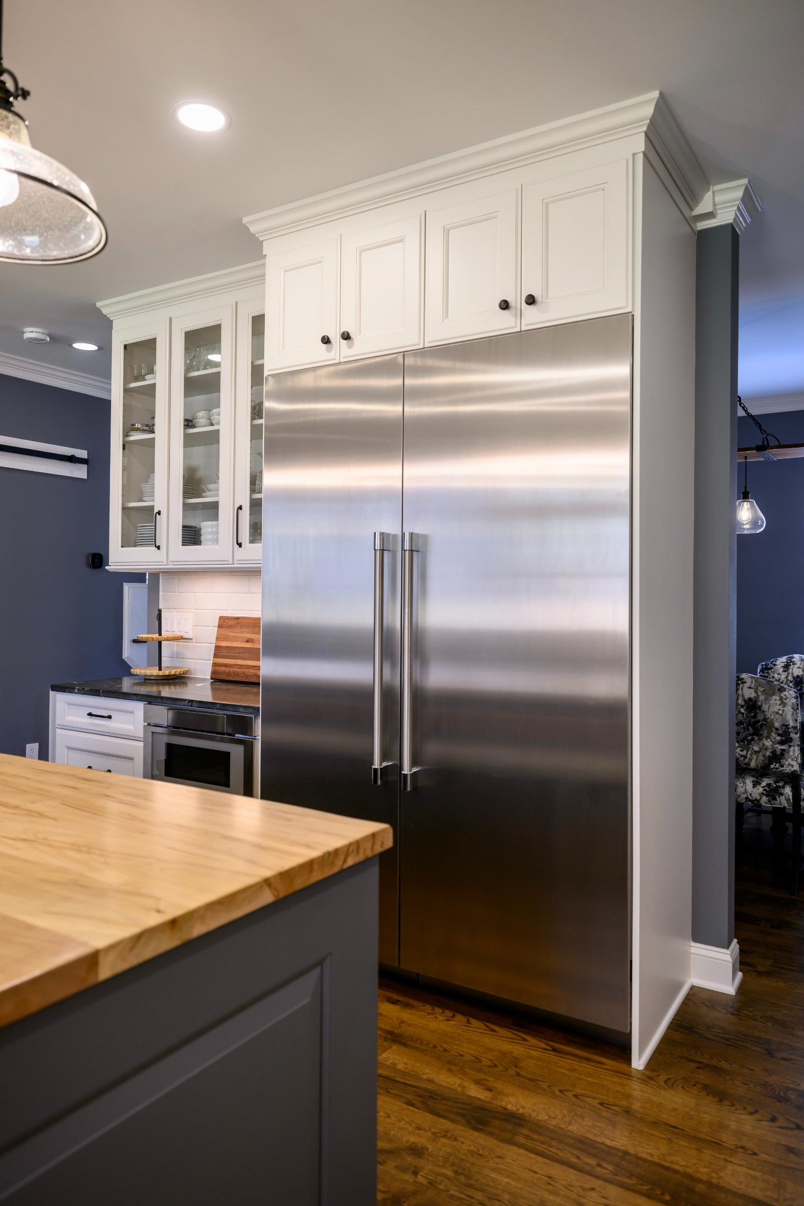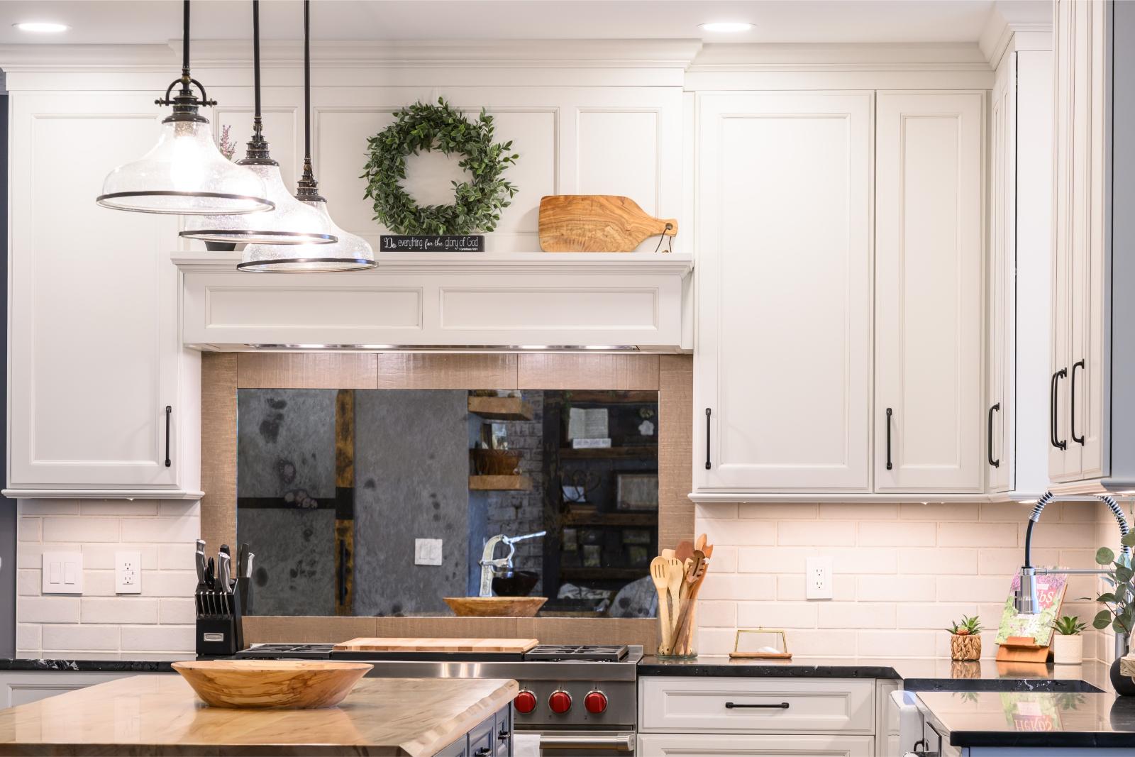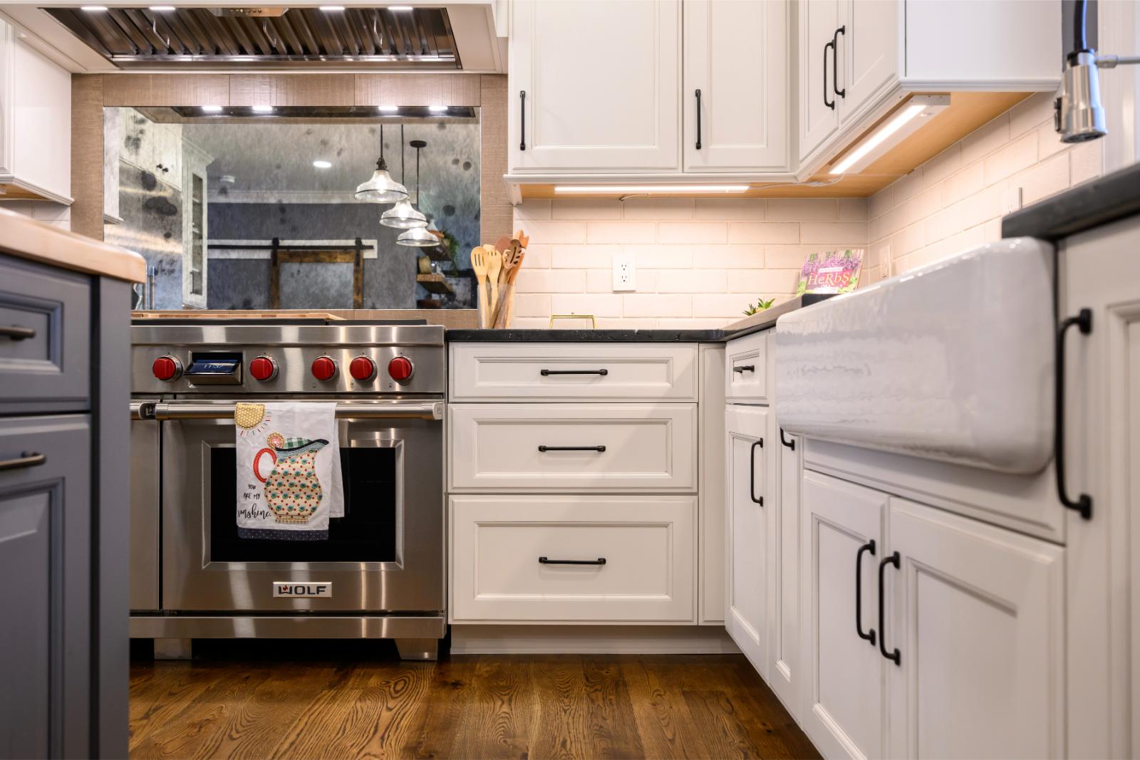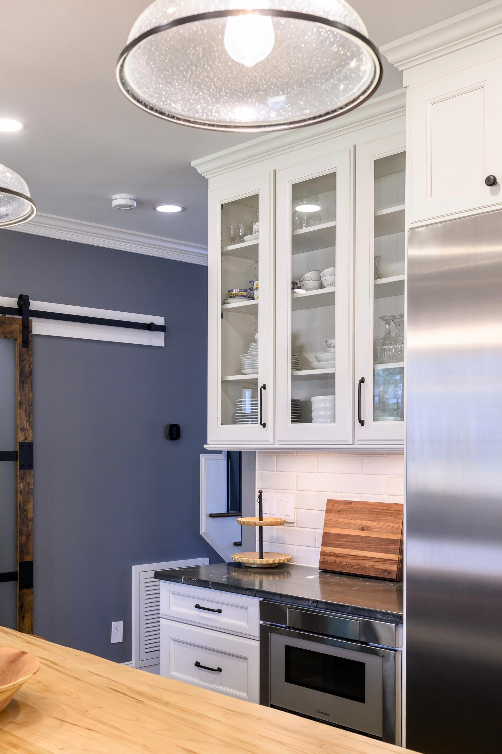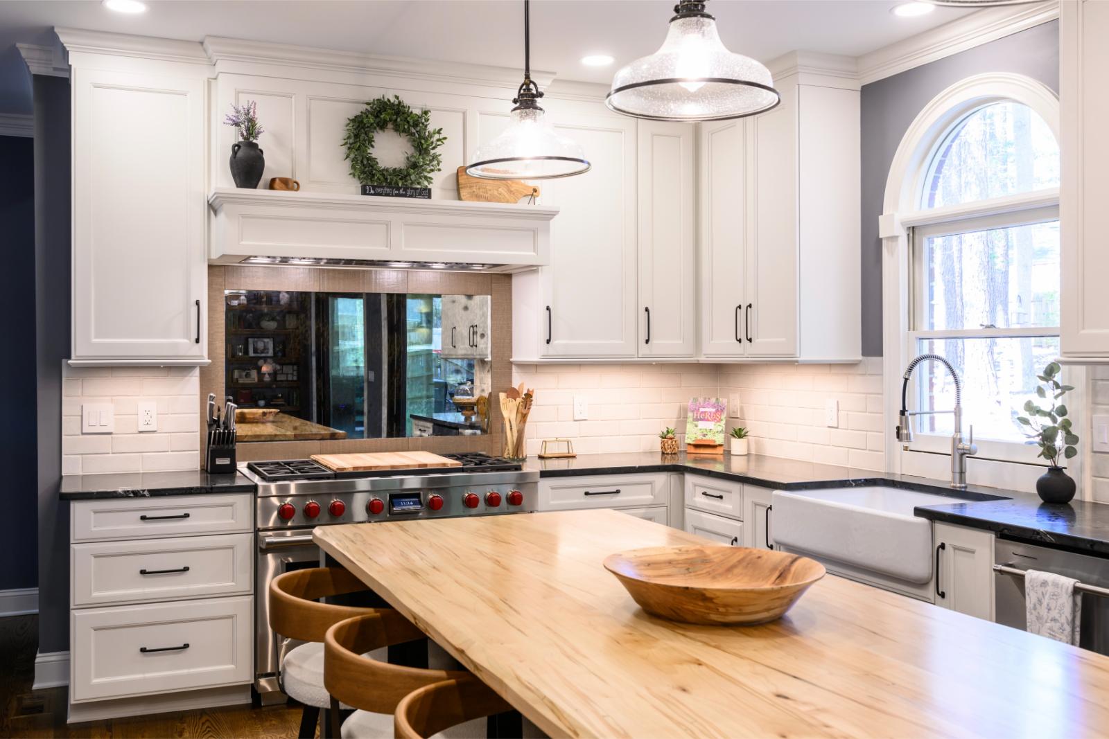 White perimeter cabinets meet a bold blue-gray island in this classic, character-filled kitchen. Warm wood tones, black hardware, and industrial-style pendant lights give the space a grounded, farmhouse feel that's both timeless and lived-in.