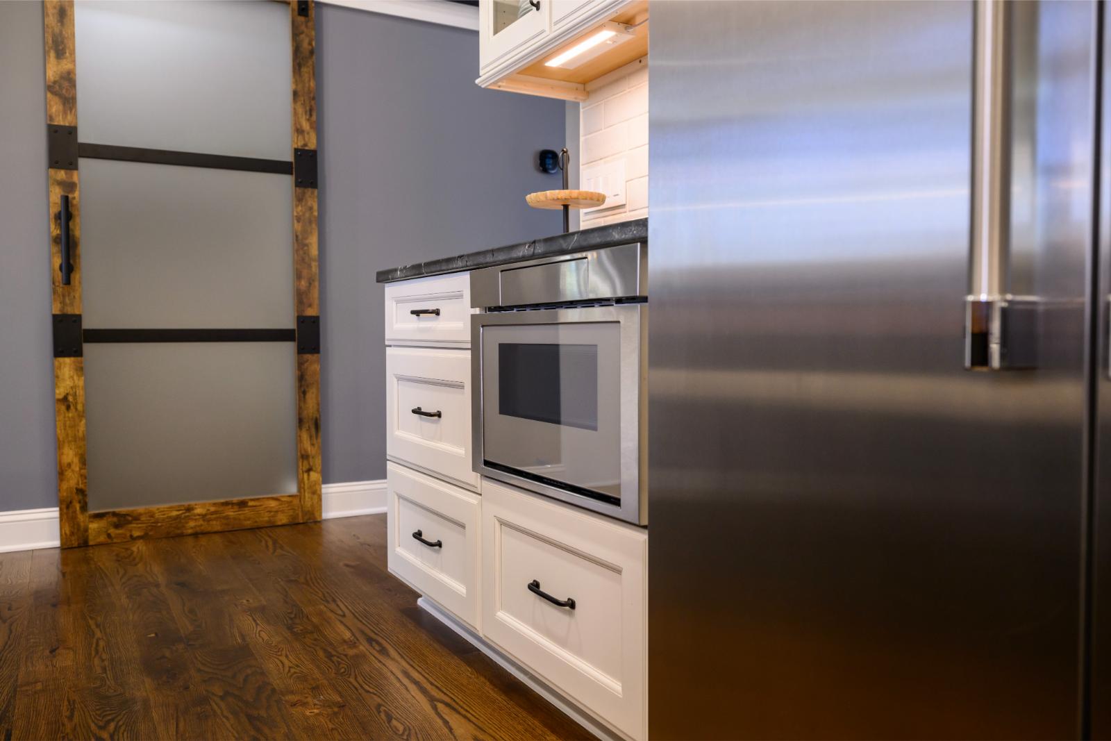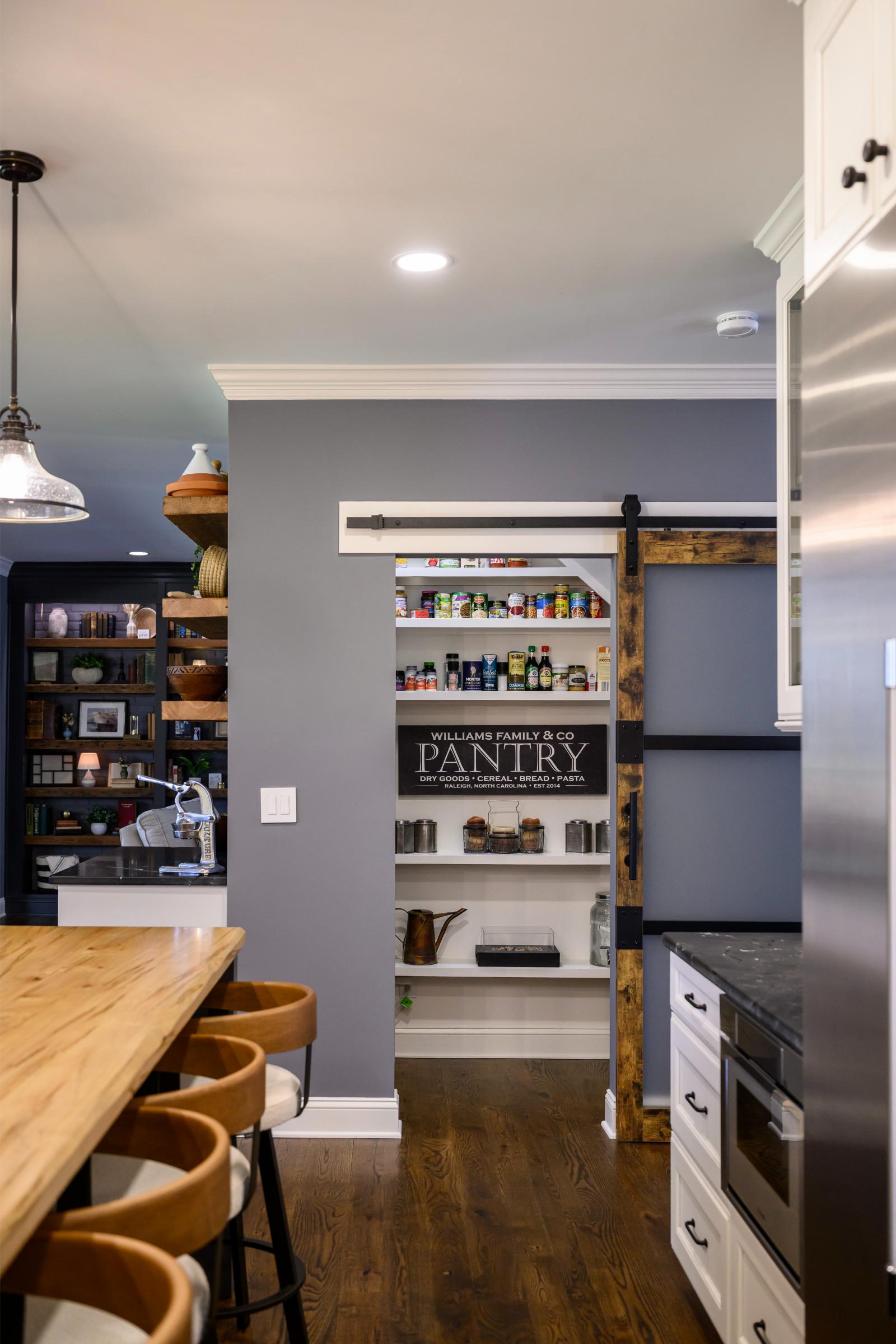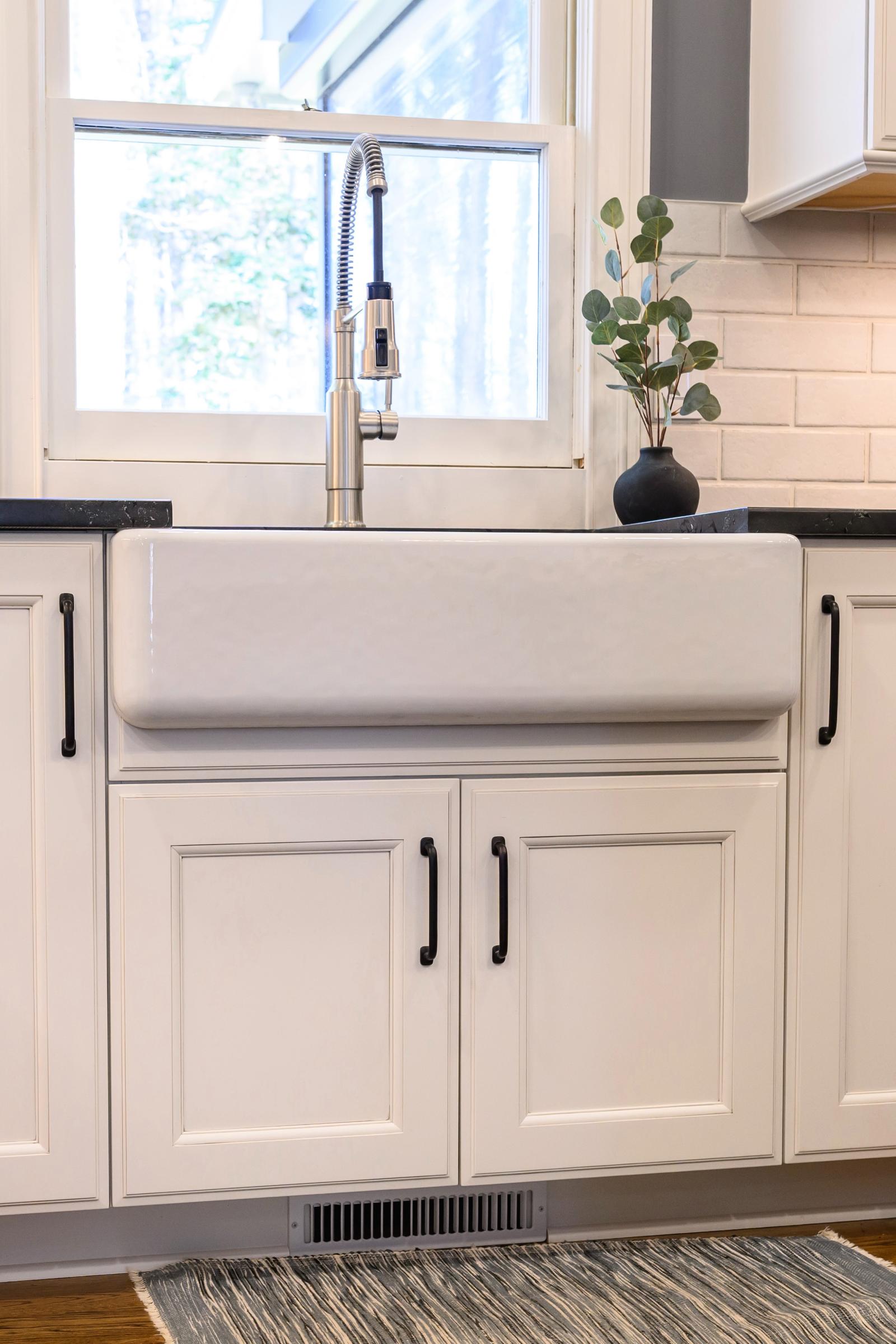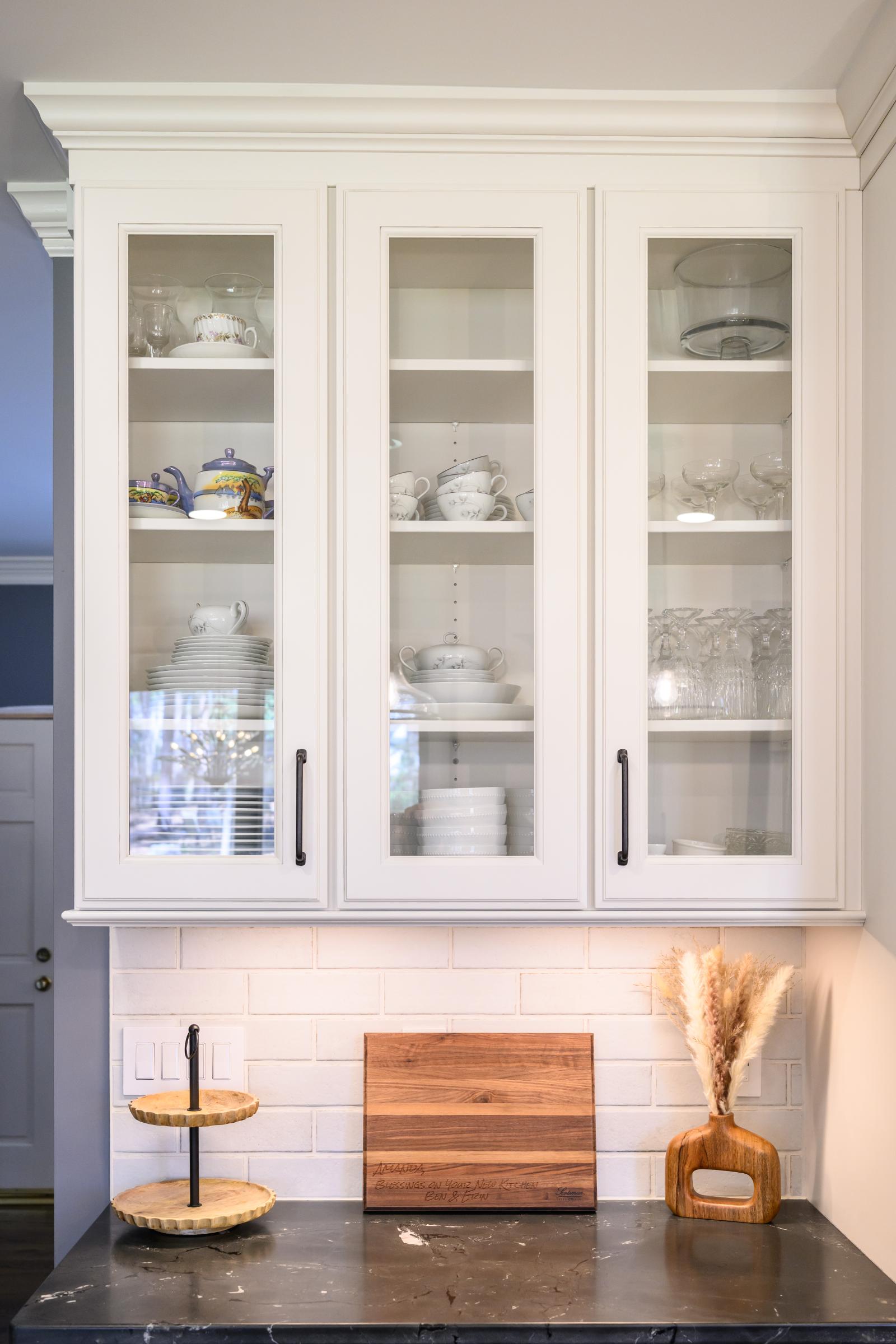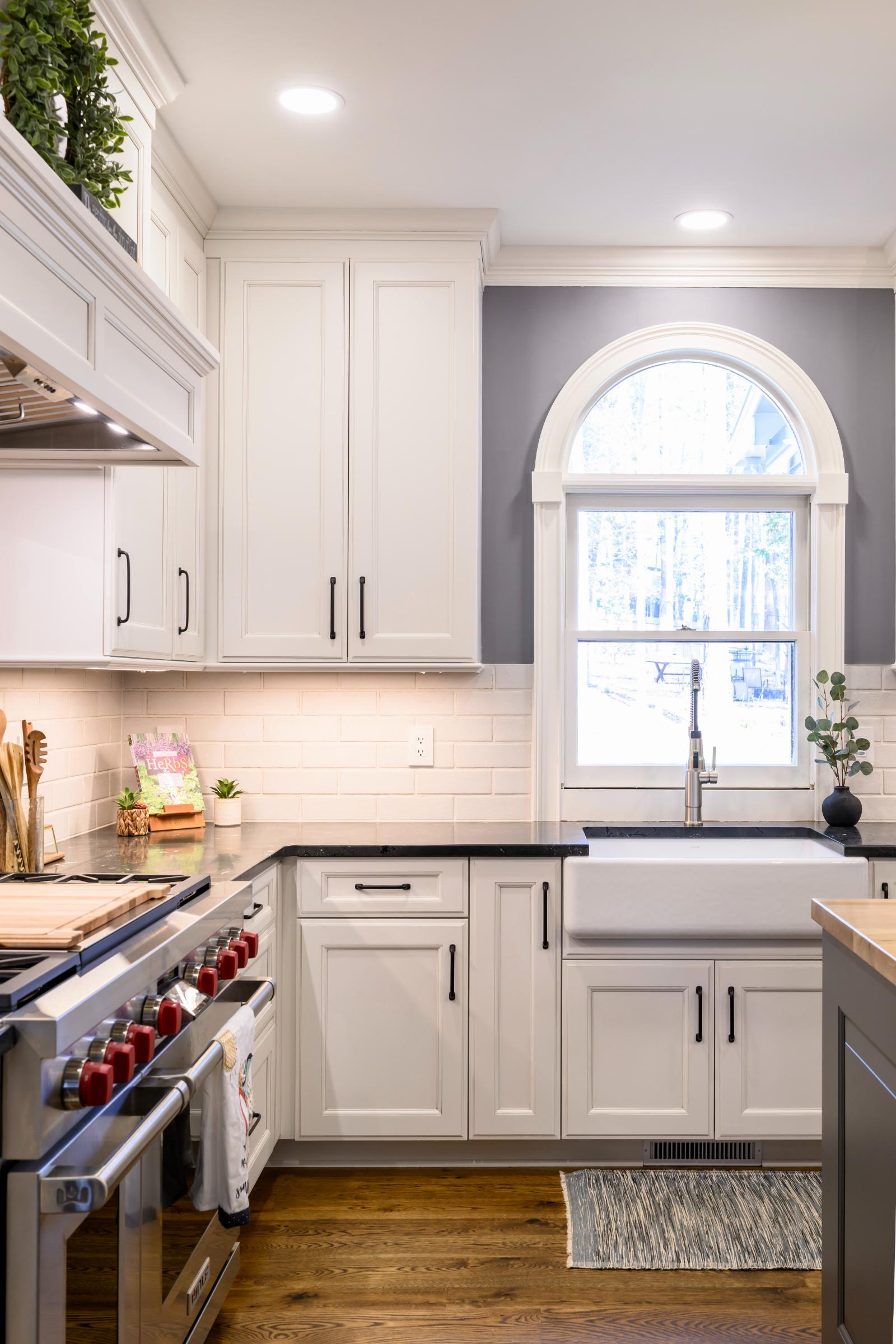 White perimeter cabinets meet a bold blue-gray island in this classic, character-filled kitchen. Warm wood tones, black hardware, and industrial-style pendant lights give the space a grounded, farmhouse feel that's both timeless and lived-in.