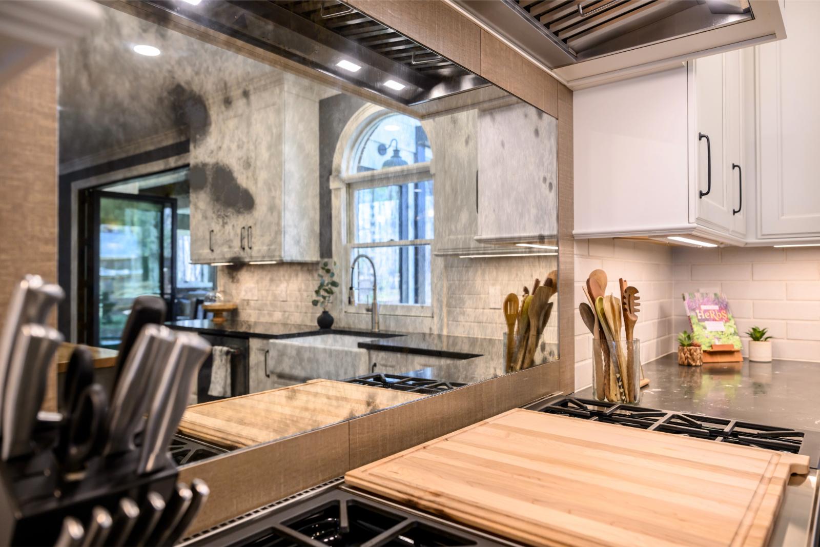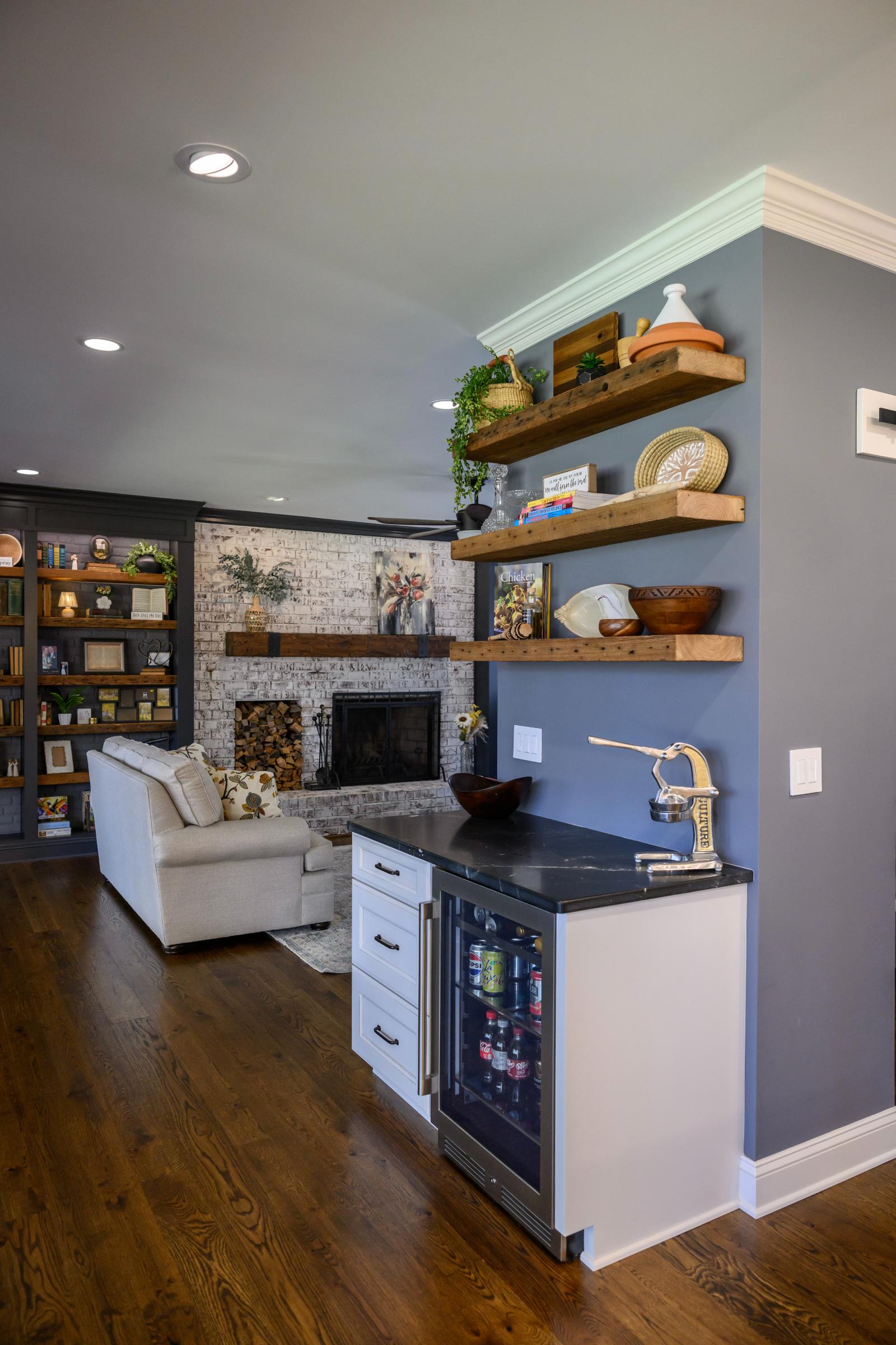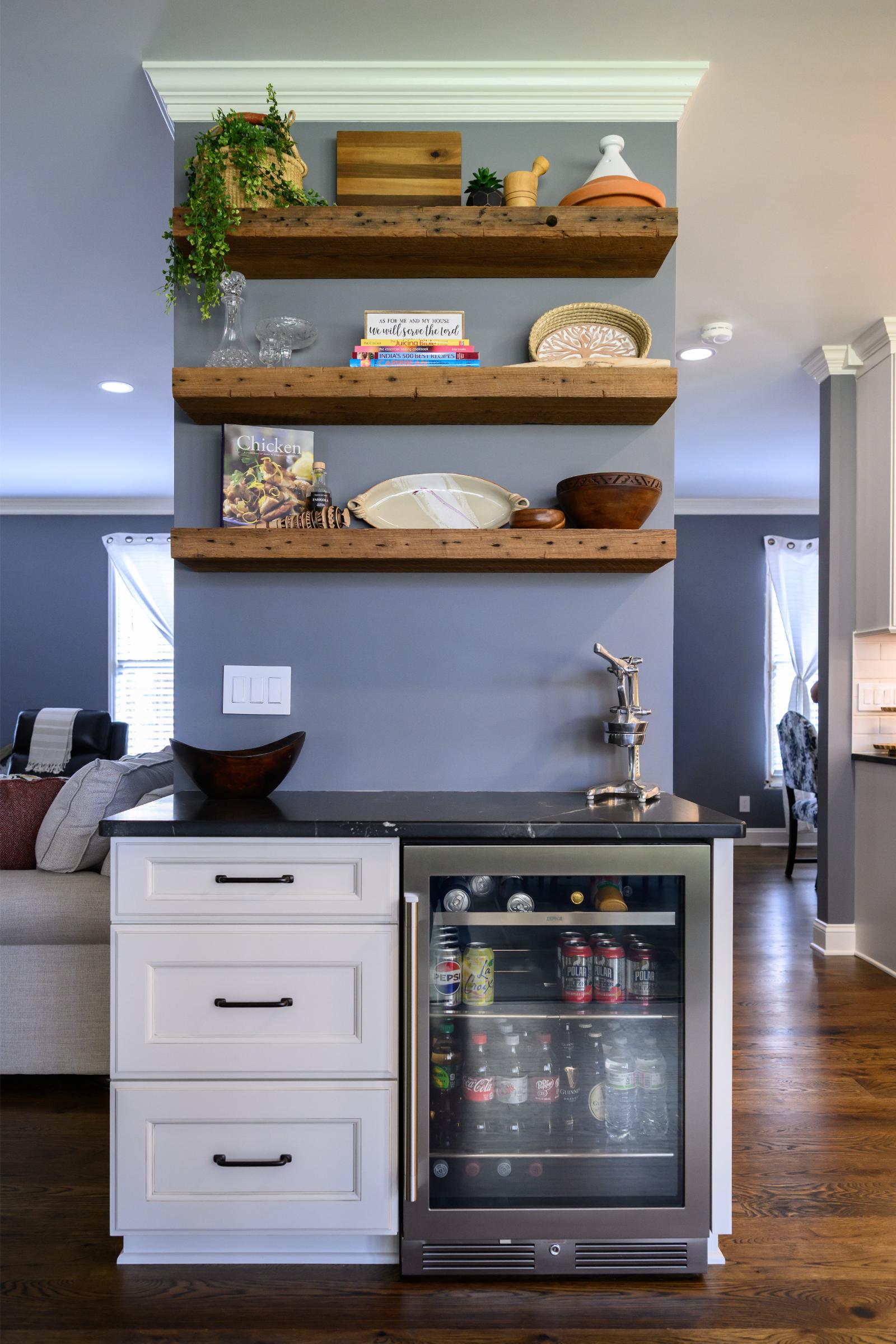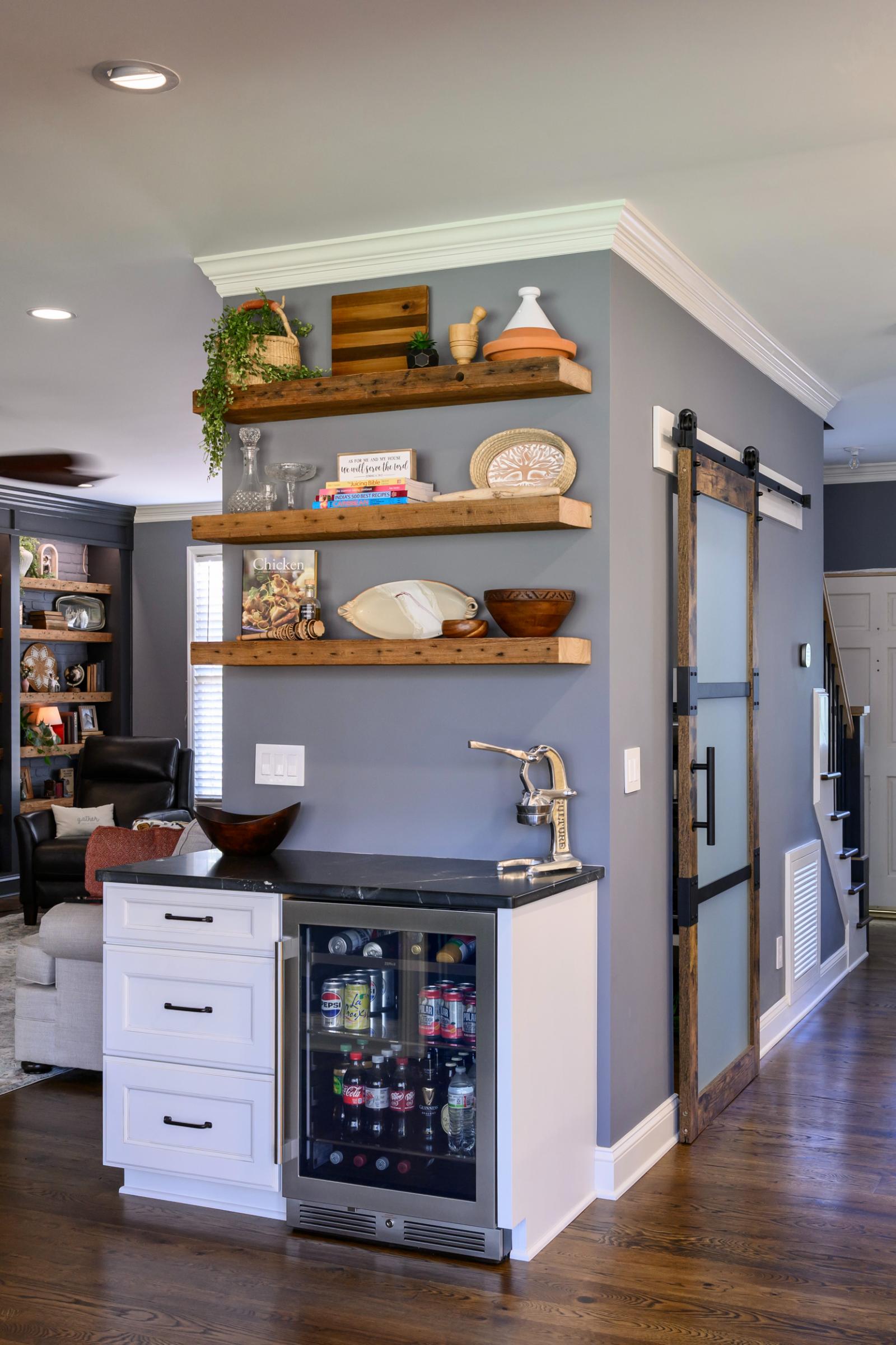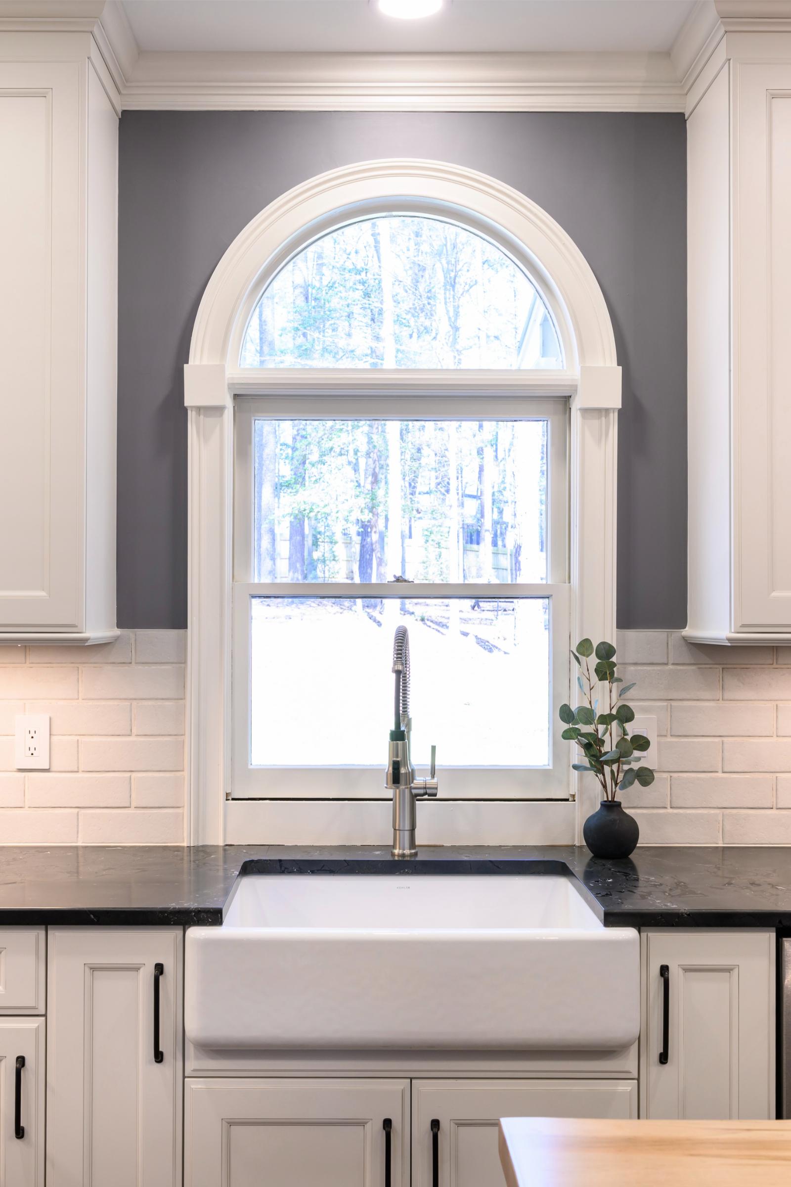 White perimeter cabinets meet a bold blue-gray island in this classic, character-filled kitchen. Warm wood tones, black hardware, and industrial-style pendant lights give the space a grounded, farmhouse feel that's both timeless and lived-in.
