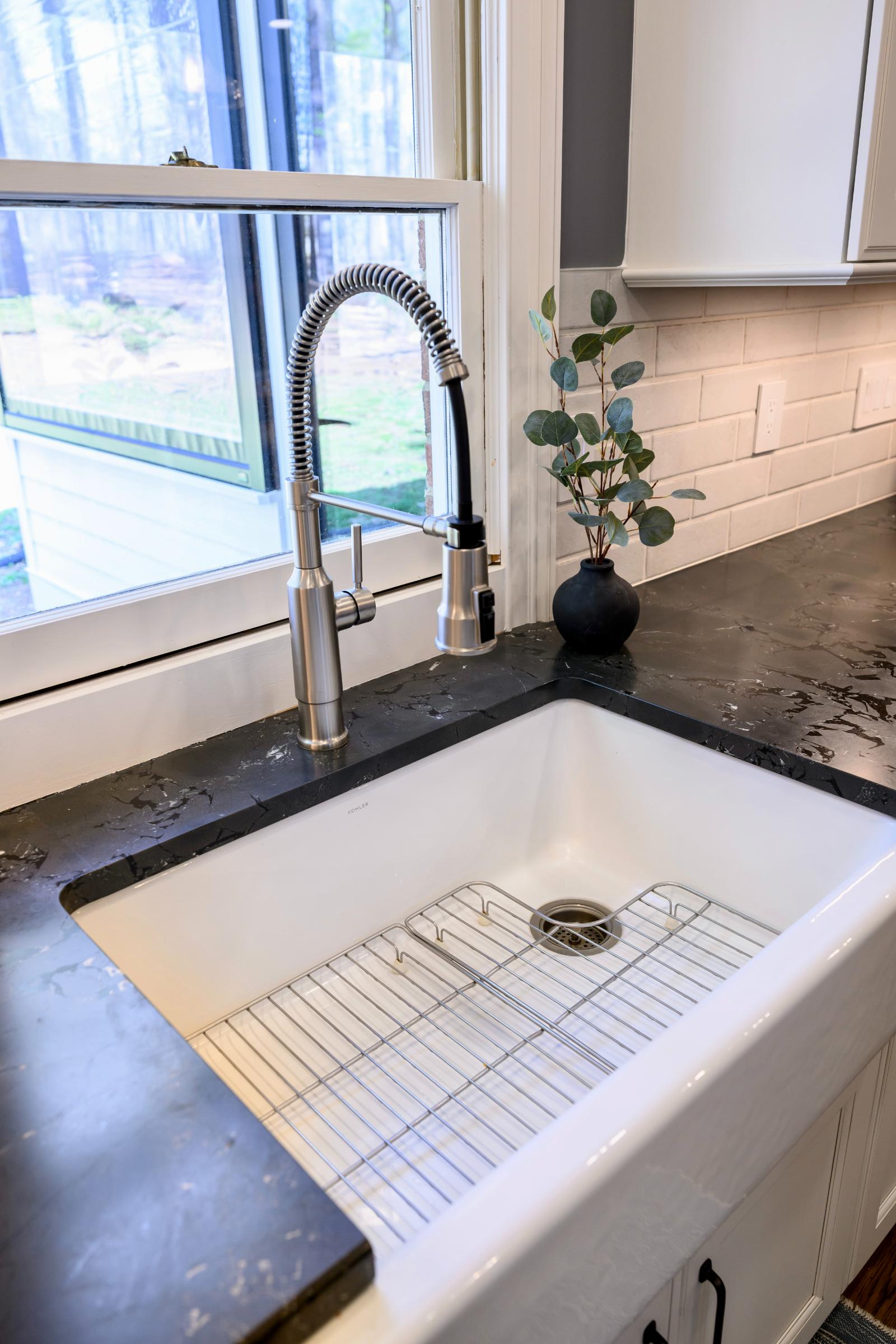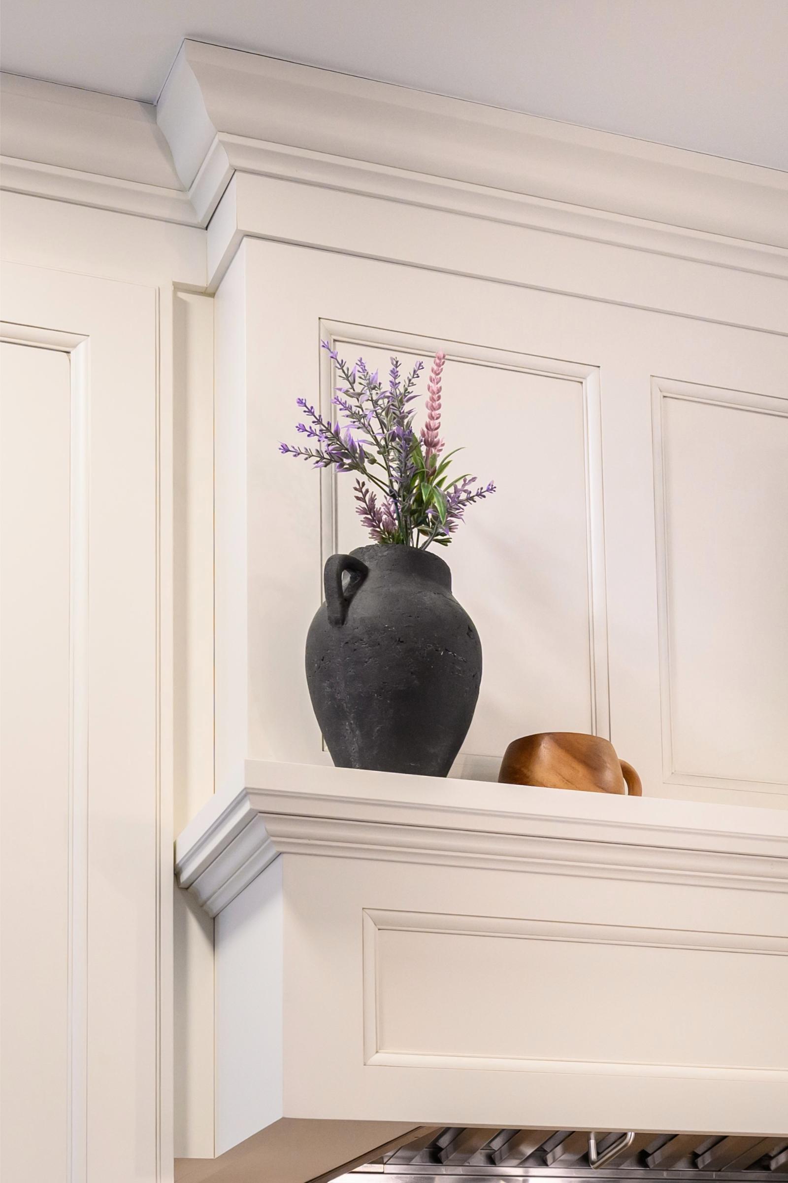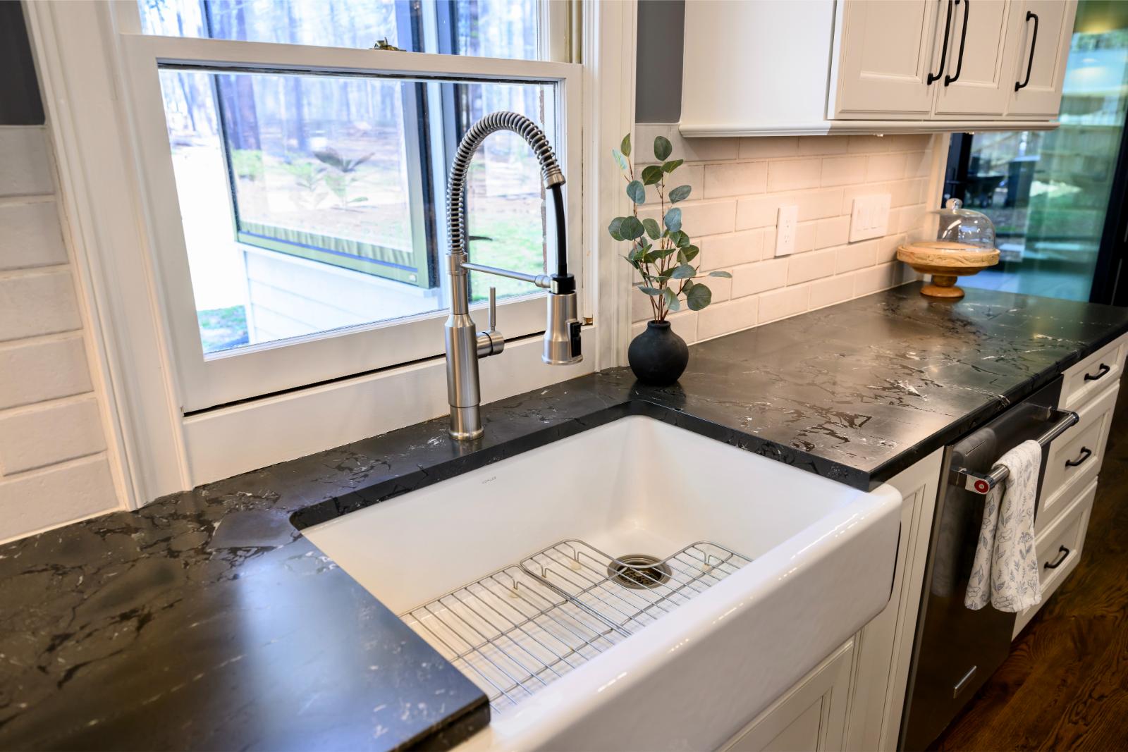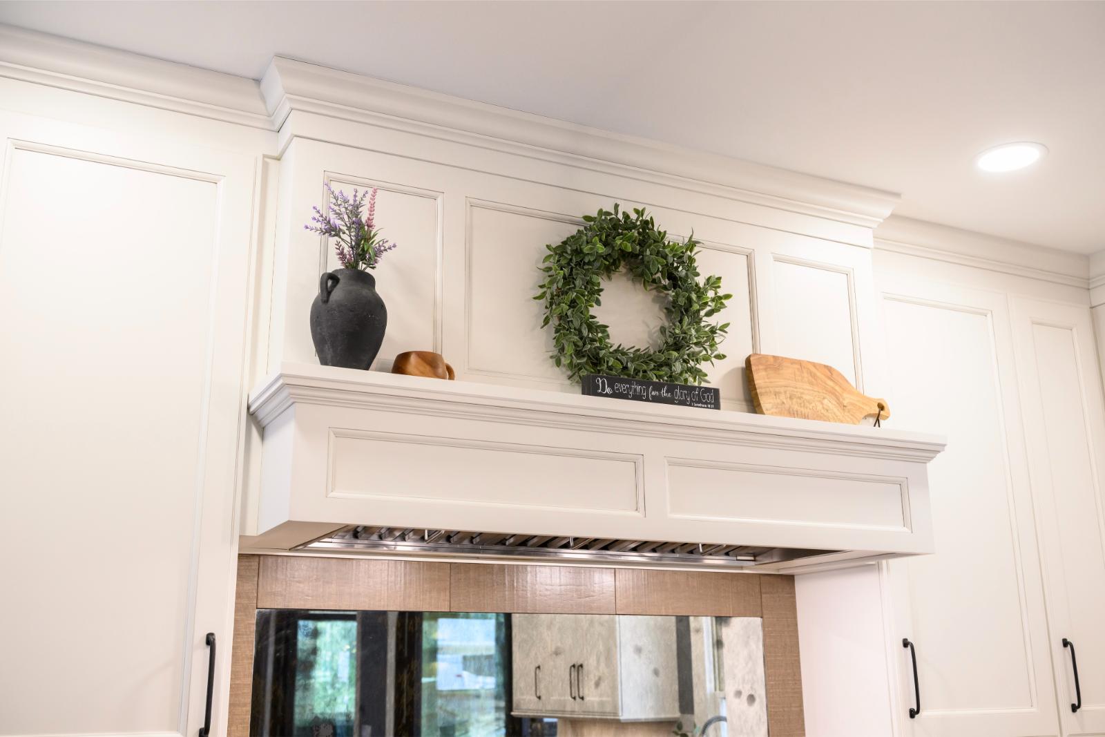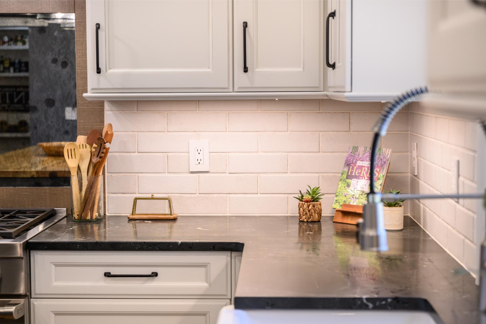 White perimeter cabinets meet a bold blue-gray island in this classic, character-filled kitchen. Warm wood tones, black hardware, and industrial-style pendant lights give the space a grounded, farmhouse feel that's both timeless and lived-in.