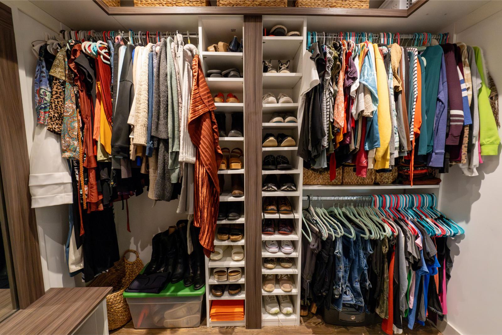 This custom walk-in closet was designed to keep daily routines simple and organized. Built-in shelving, hanging space, and dedicated shoe storage create room for everything, while warm wood tones keep the space feeling comfortable and inviting.