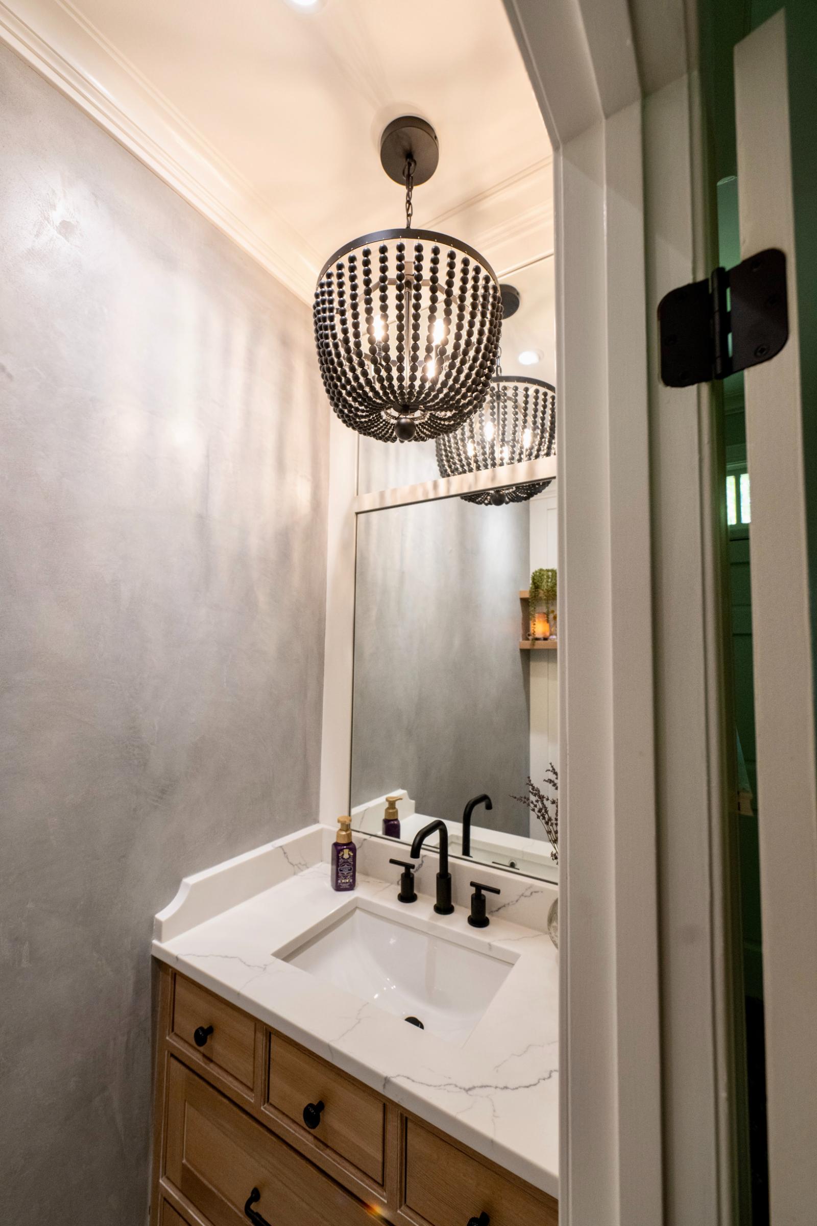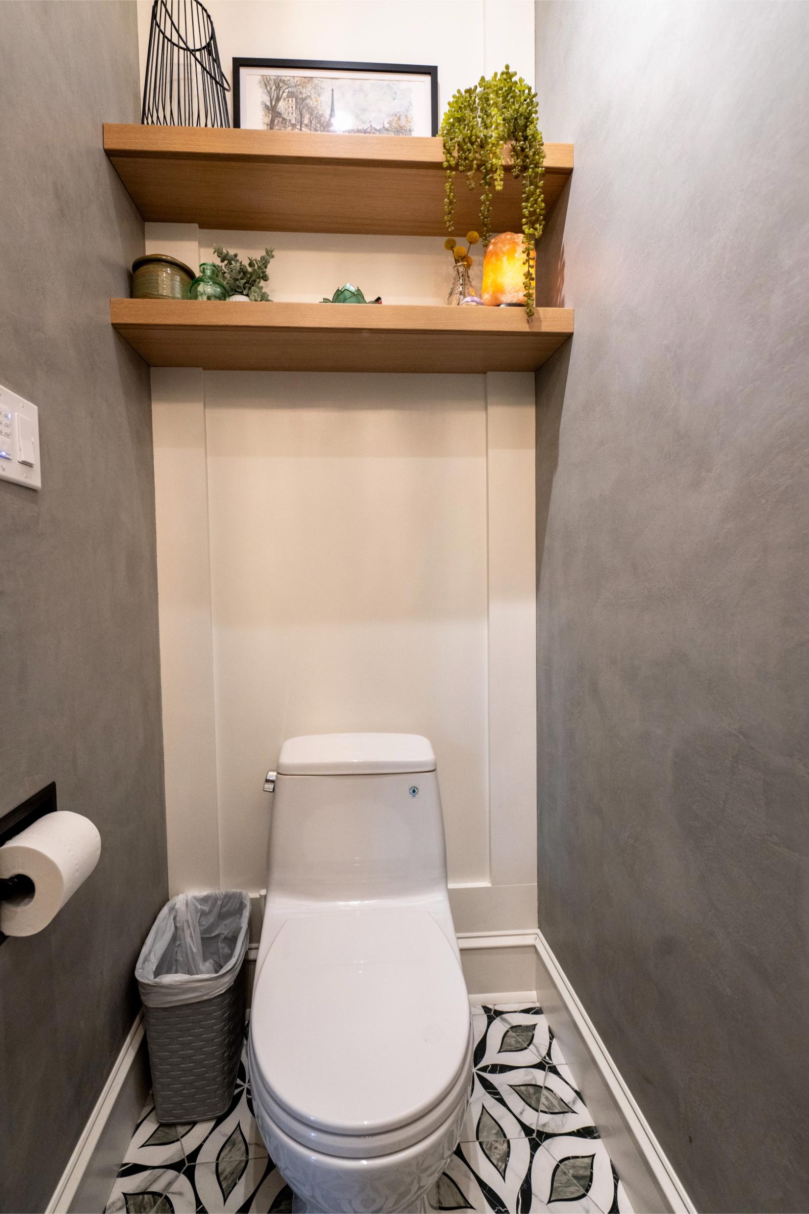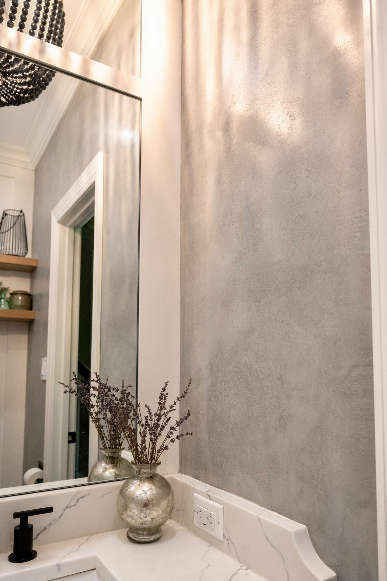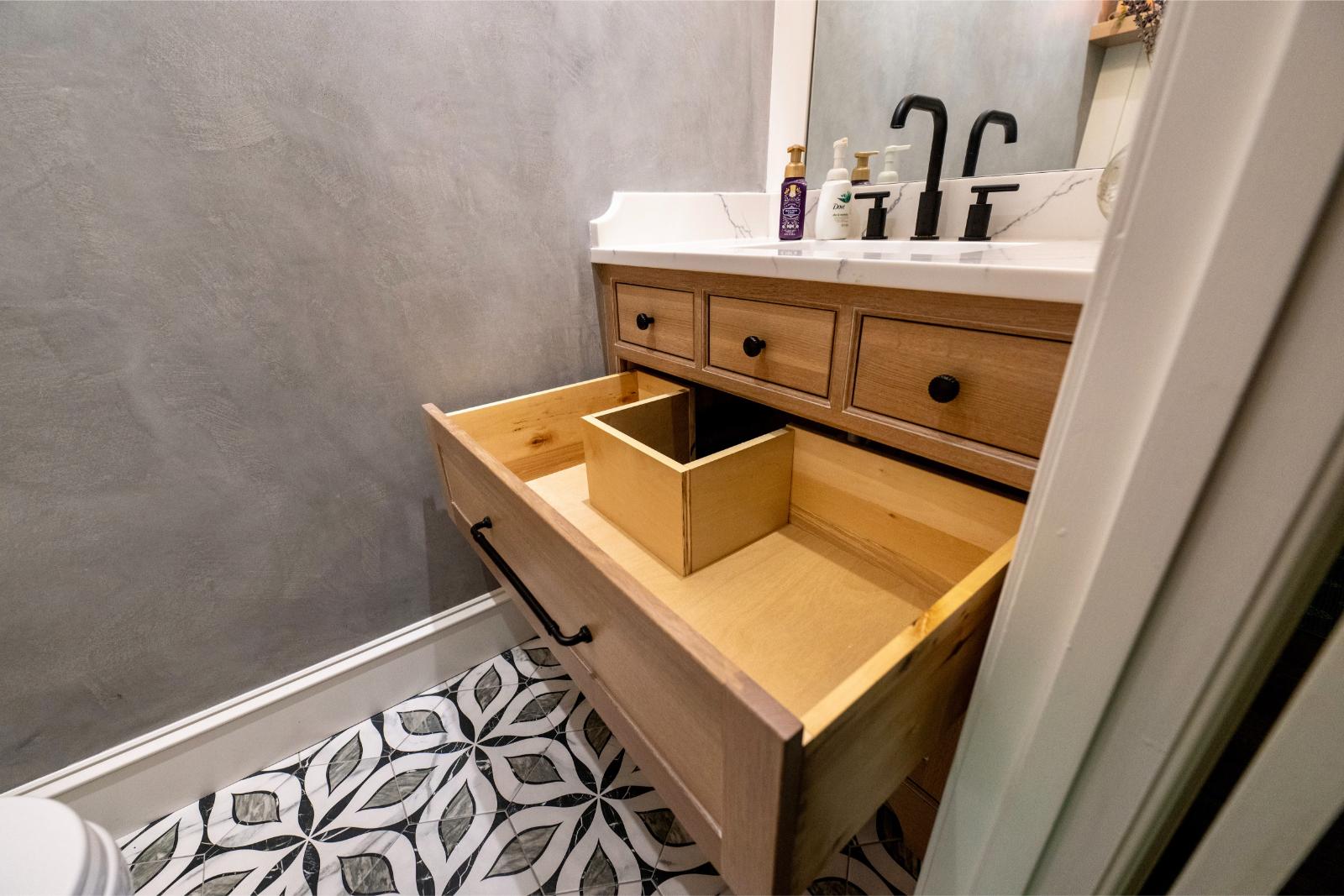 This powder bath is simple, clean, and full of detail. The warm wood vanity adds character, while the white countertop keeps the space bright. Soft gray textured walls and black fixtures give it a modern look without feeling cold.