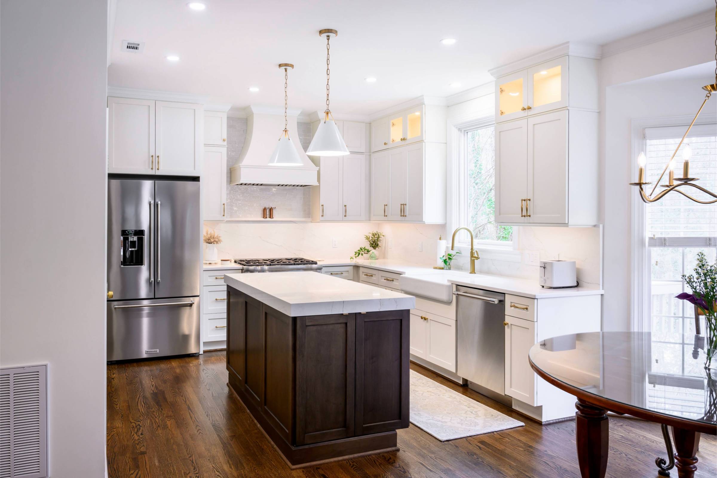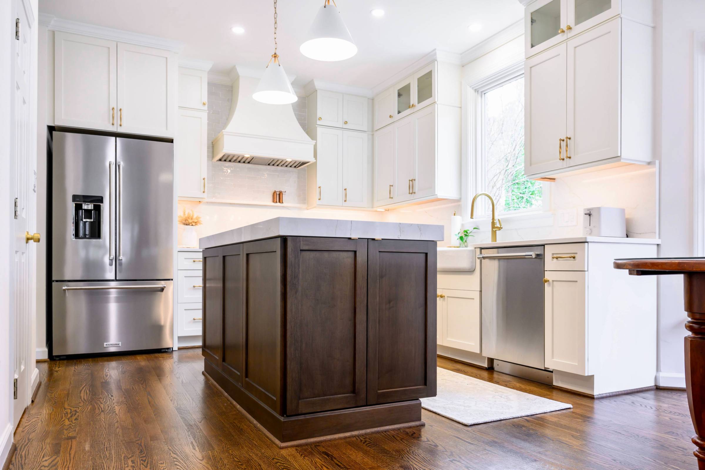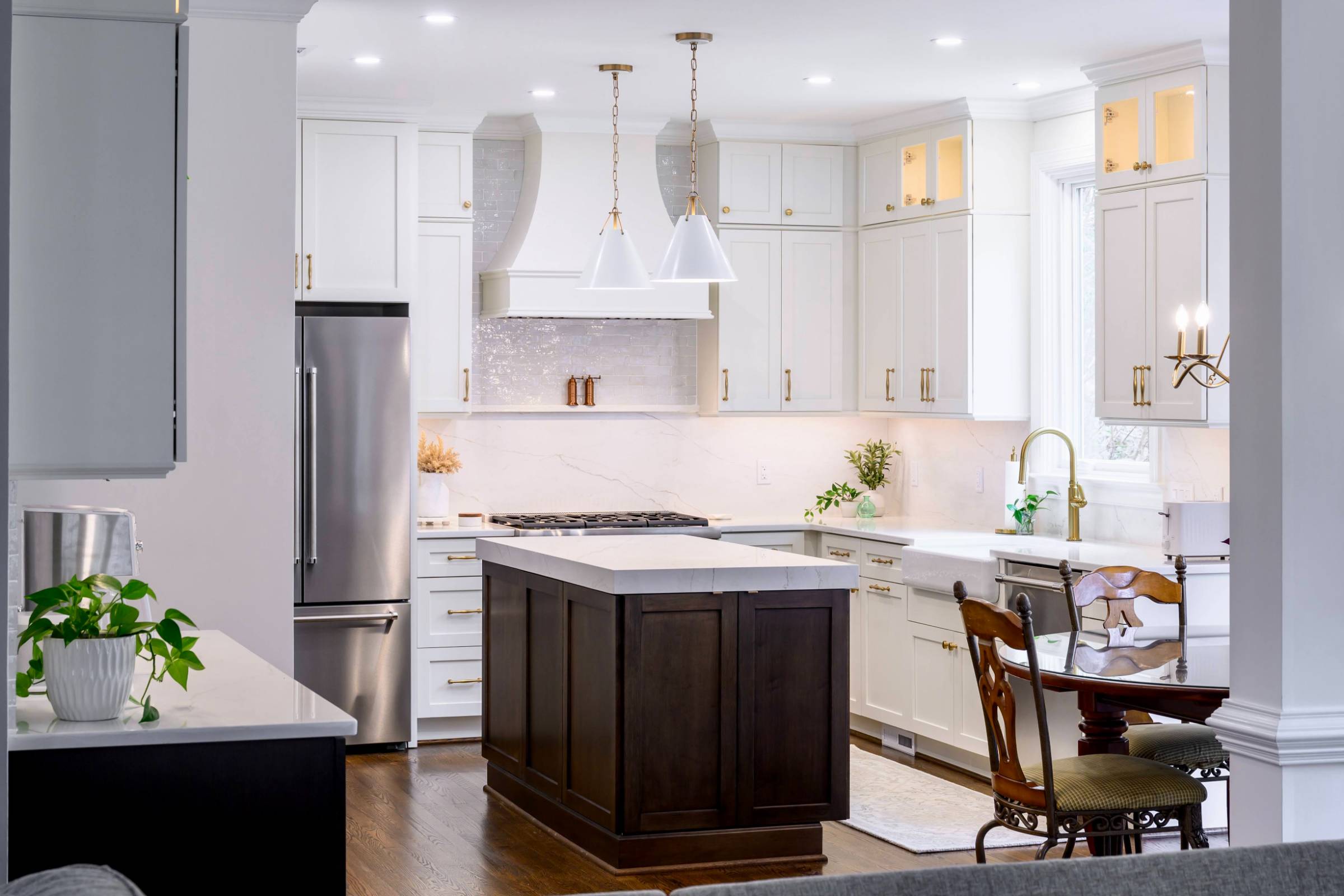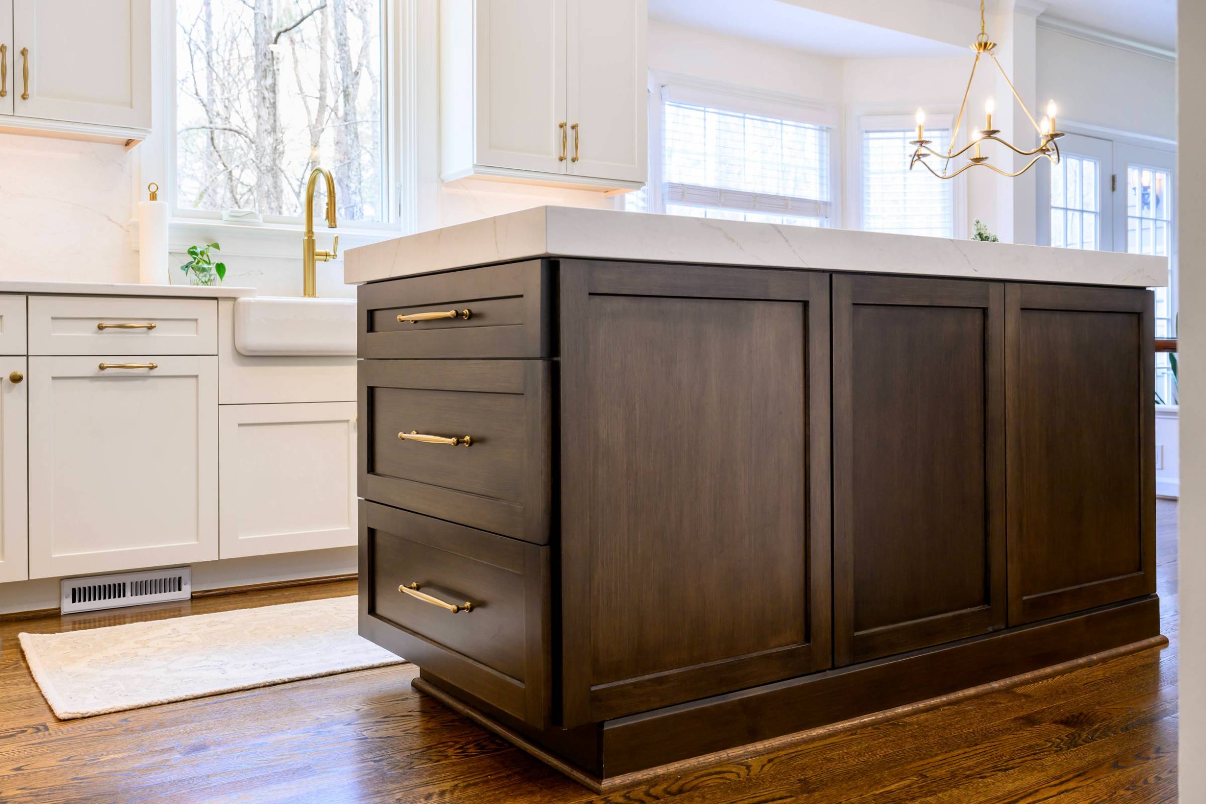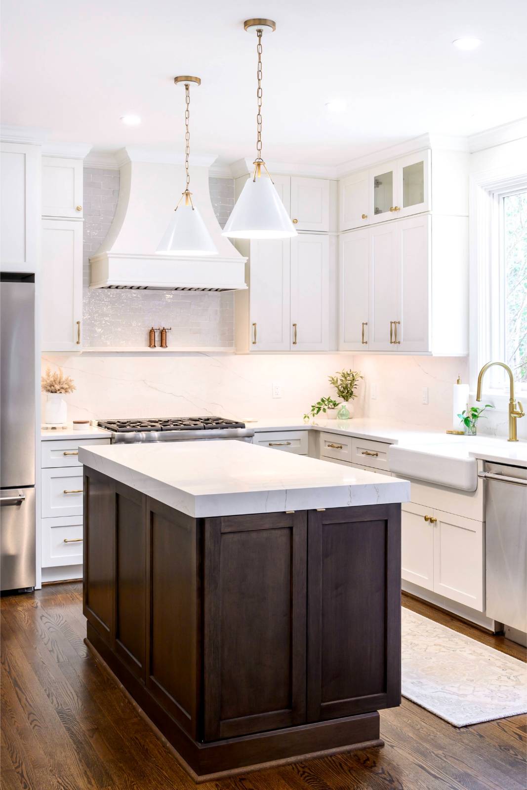 This kitchen transformation is all about warmth meeting brightness. Crisp white cabinets wrap the perimeter while a rich, dark-stained wood island takes center stage — giving the space a beautiful contrast that feels both classic and fresh.