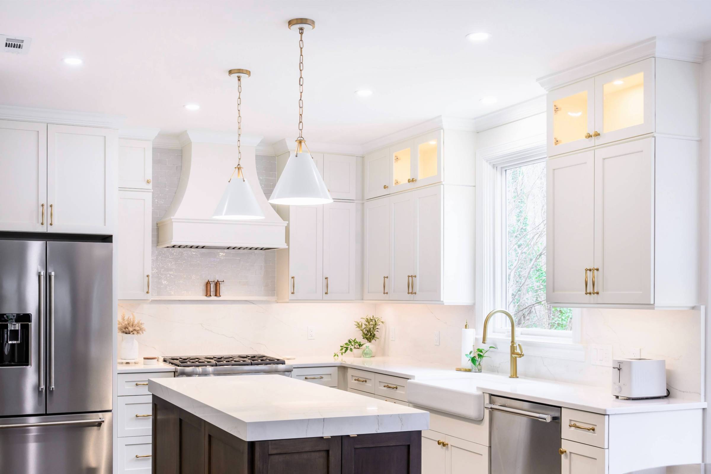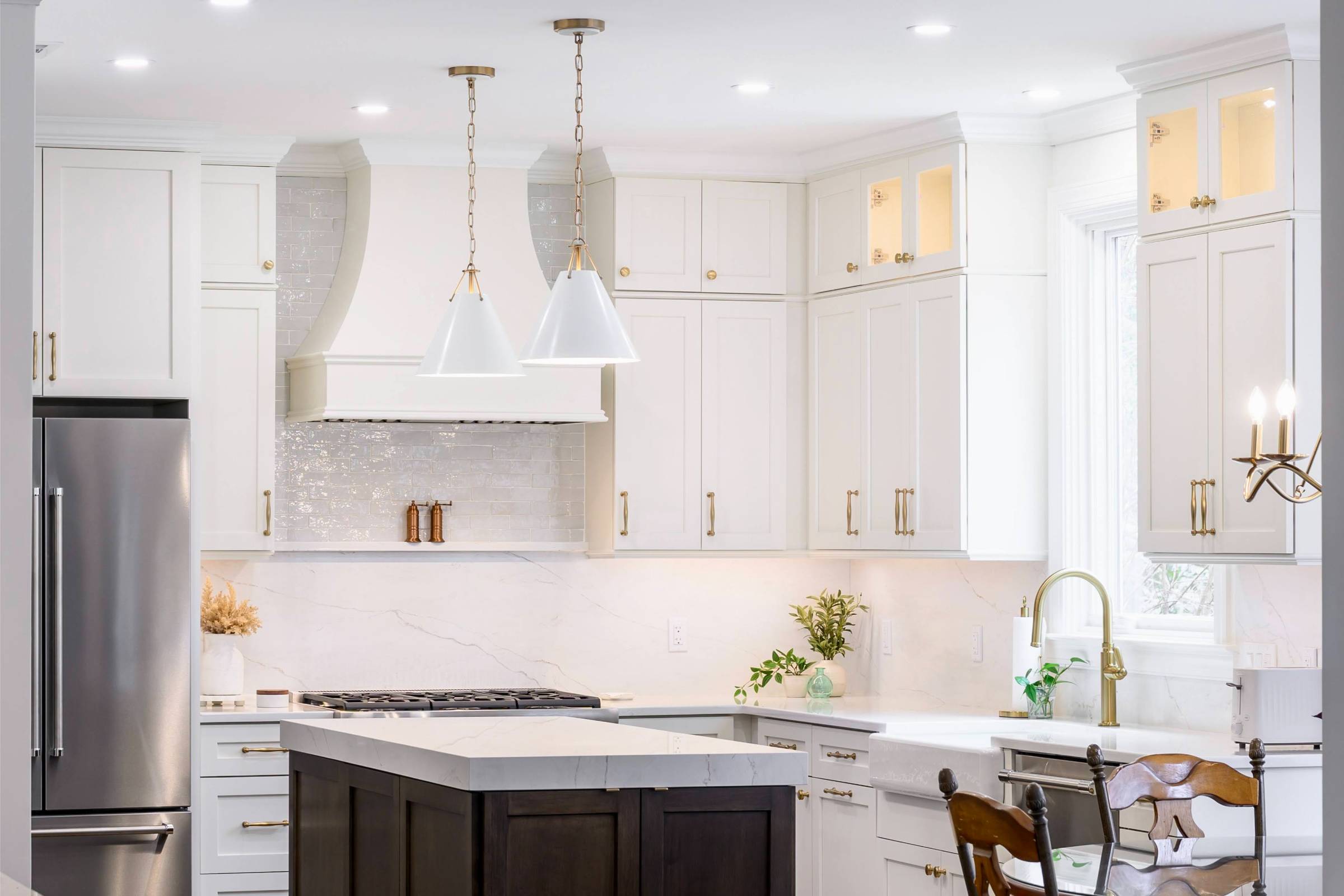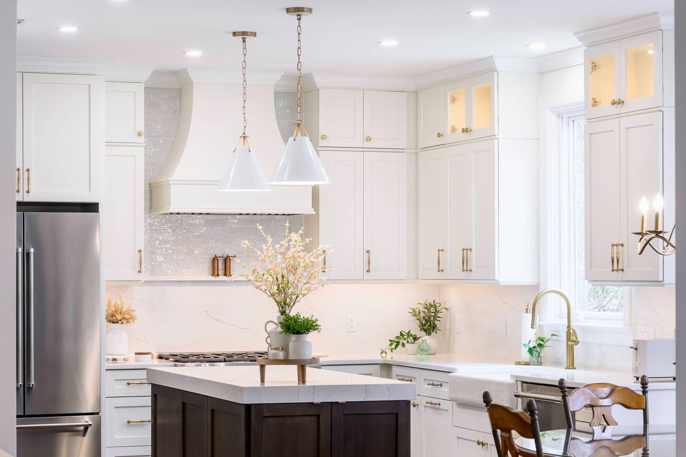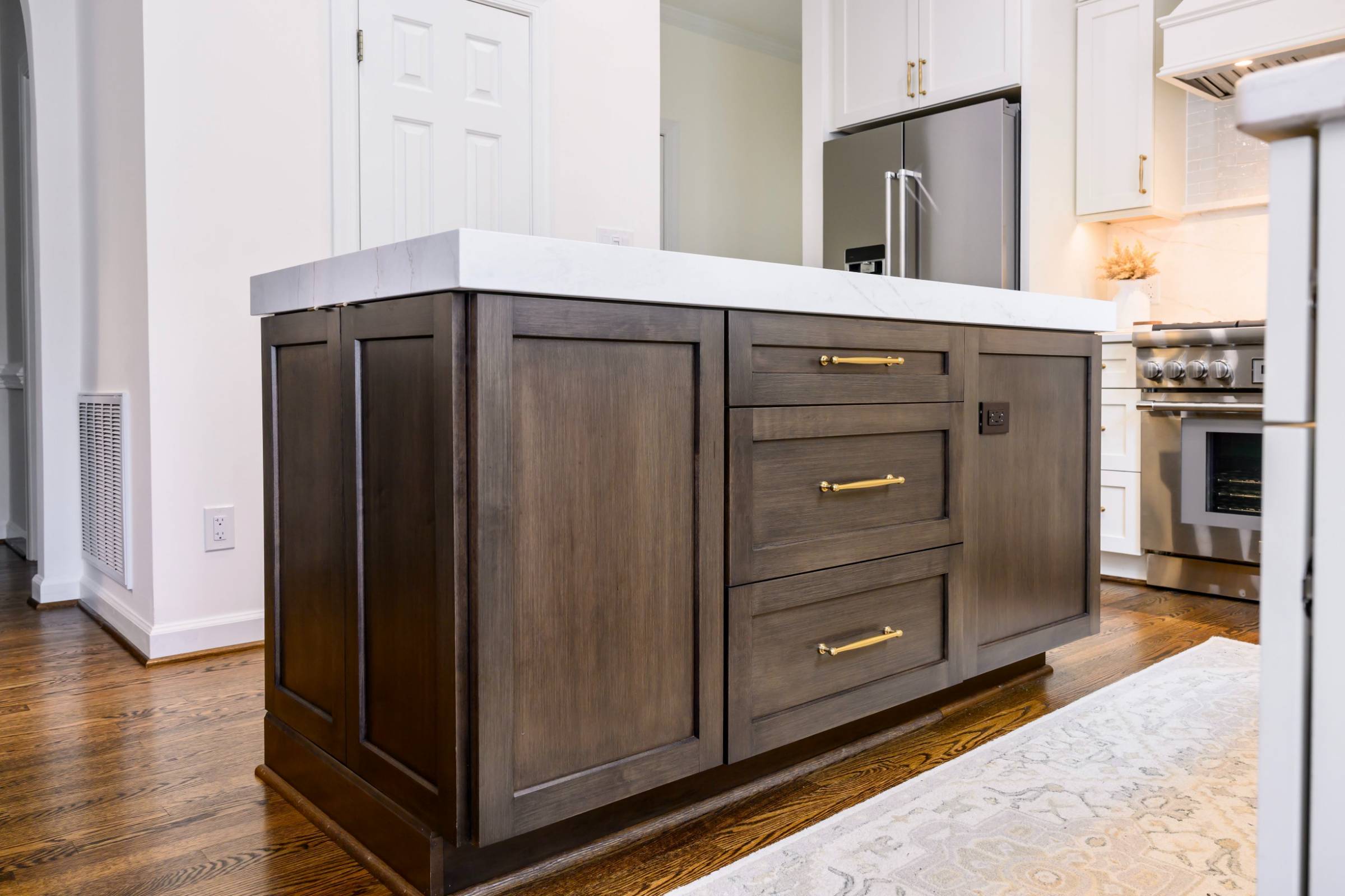 This kitchen transformation is all about warmth meeting brightness. Crisp white cabinets wrap the perimeter while a rich, dark-stained wood island takes center stage — giving the space a beautiful contrast that feels both classic and fresh.
