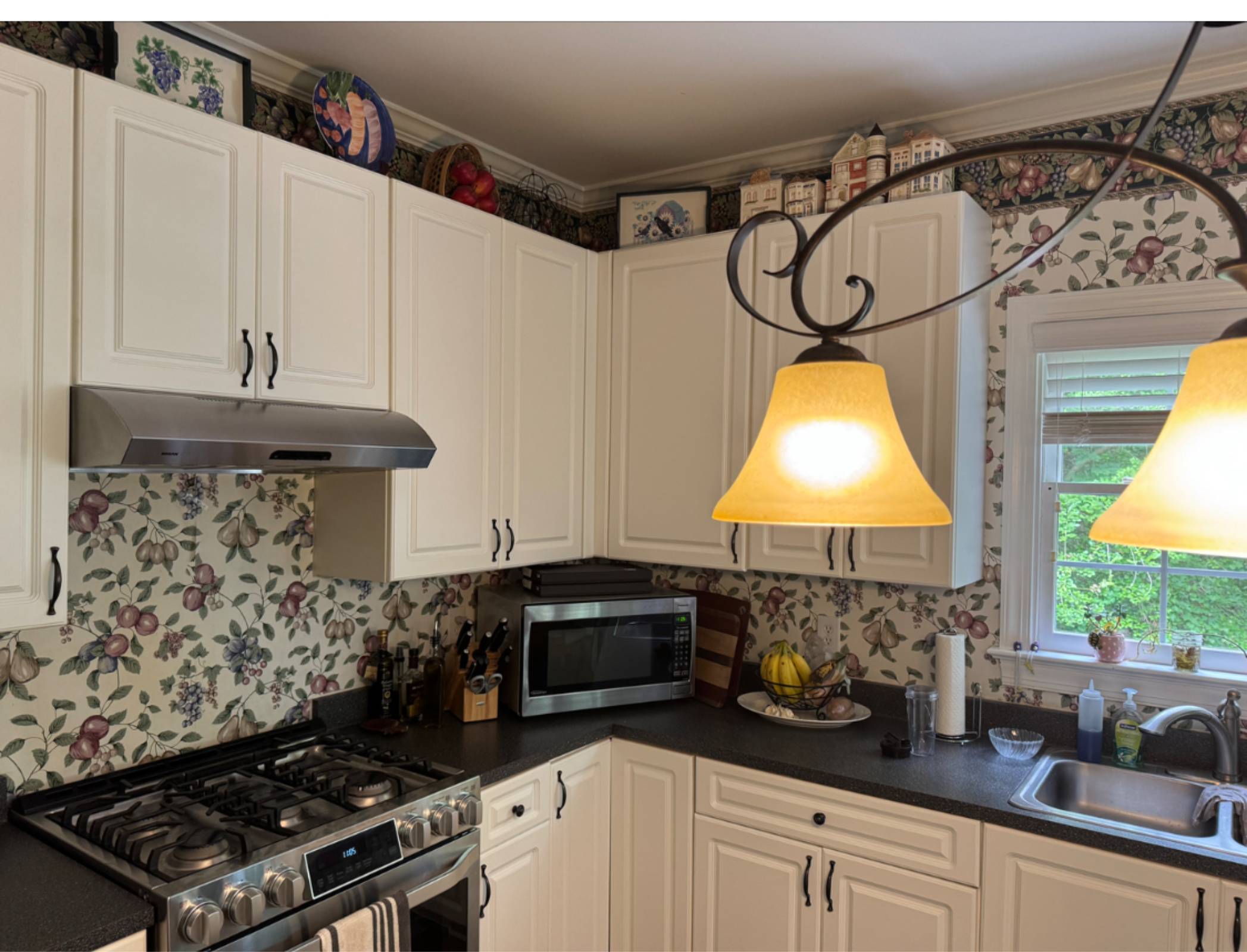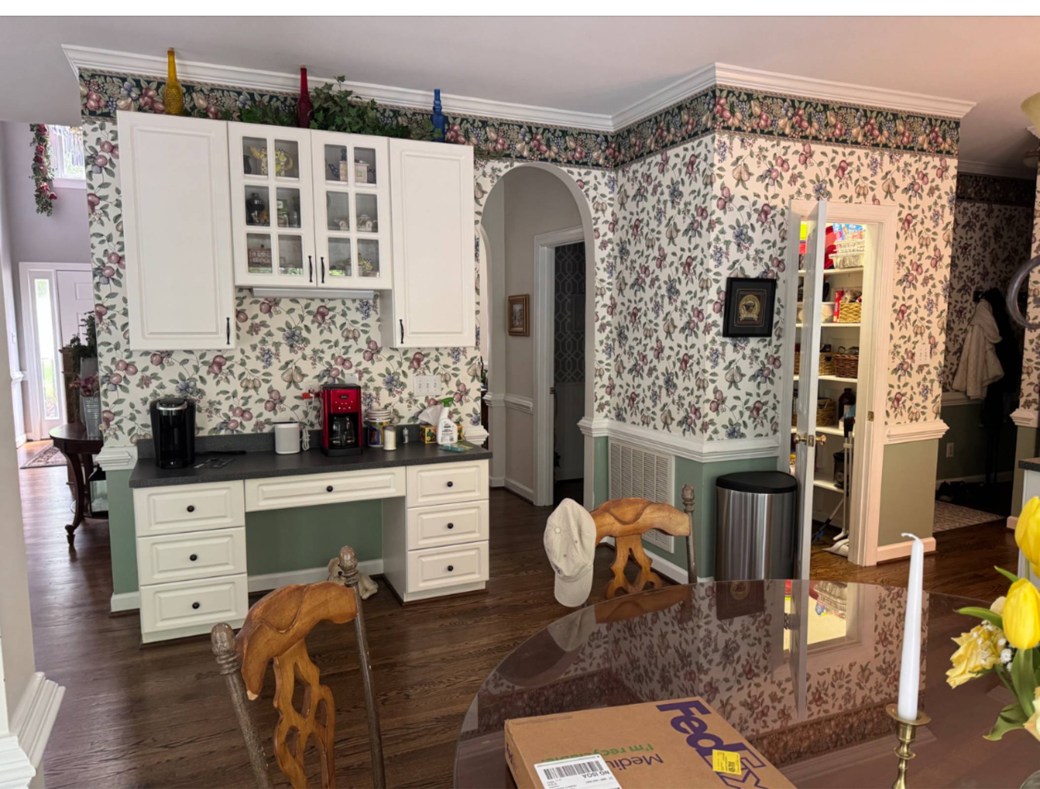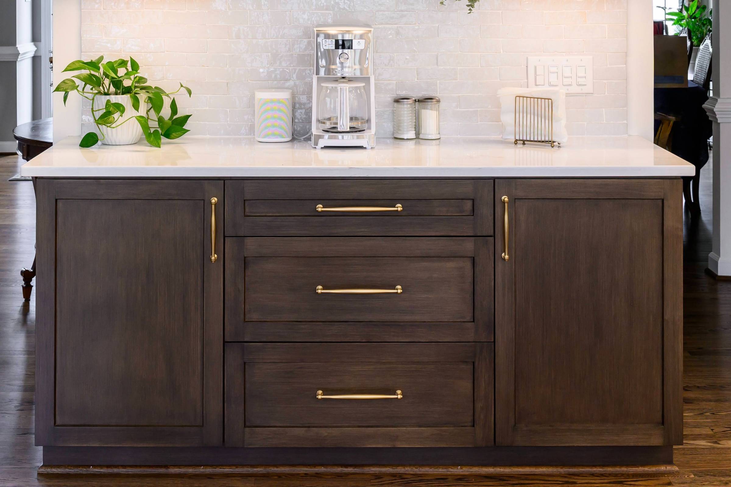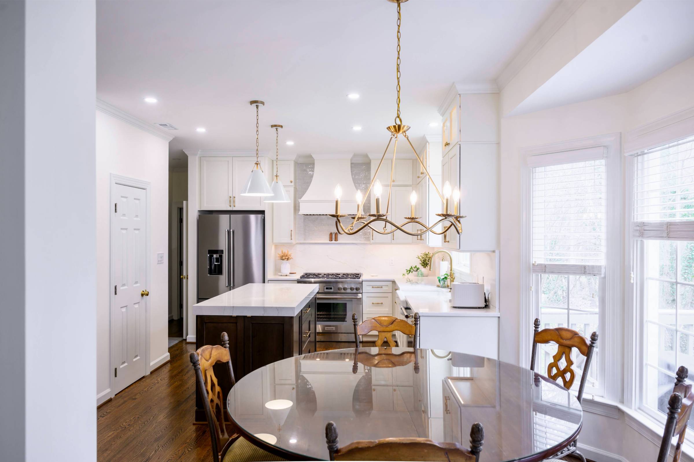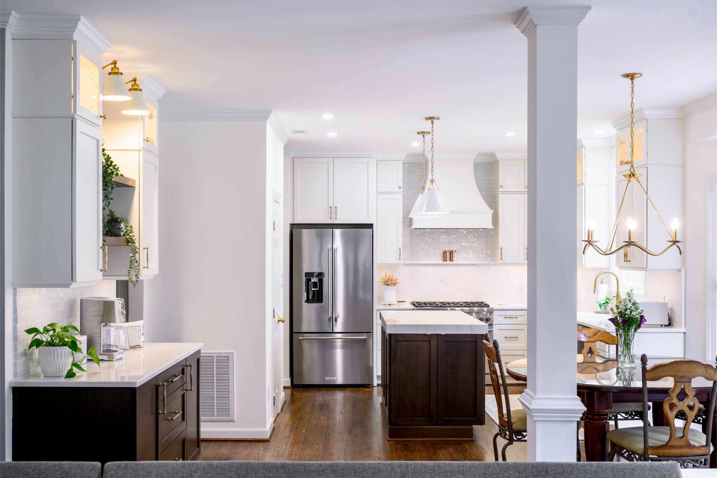 This kitchen transformation is all about warmth meeting brightness. Crisp white cabinets wrap the perimeter while a rich, dark-stained wood island takes center stage — giving the space a beautiful contrast that feels both classic and fresh.