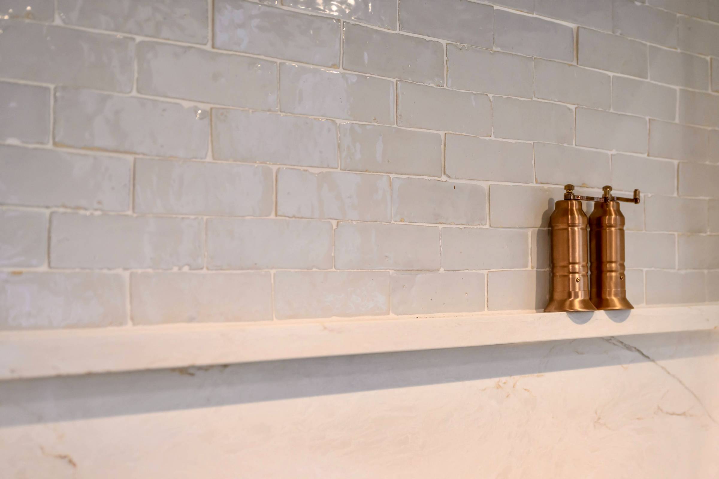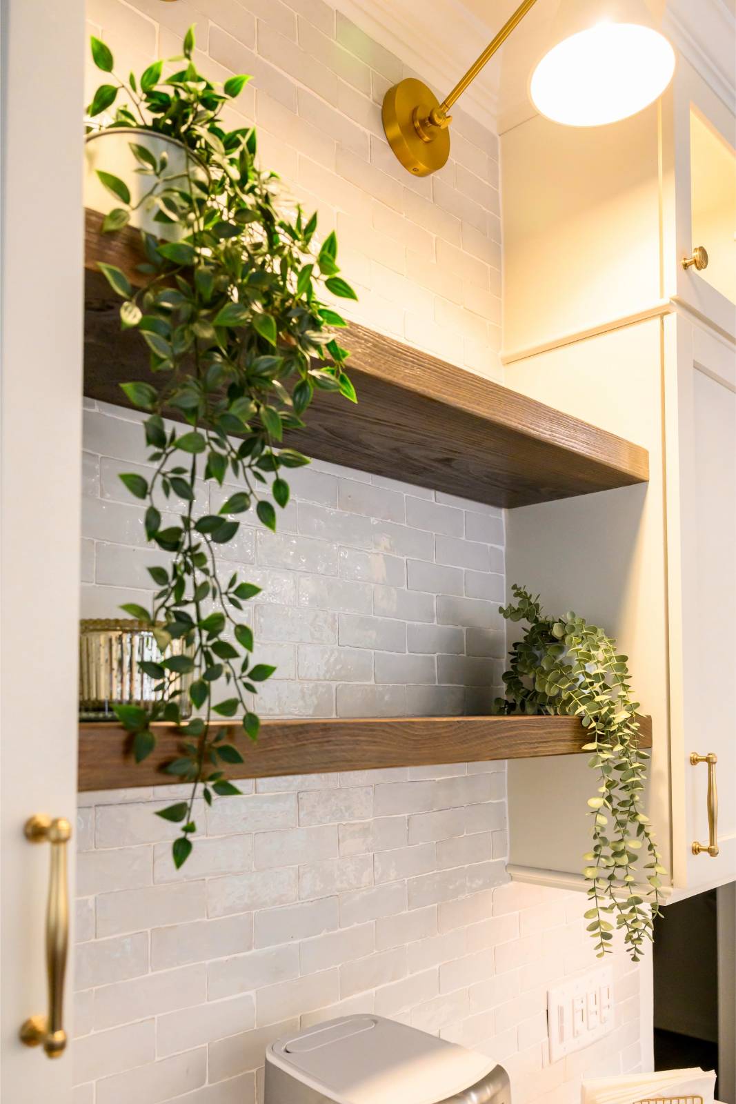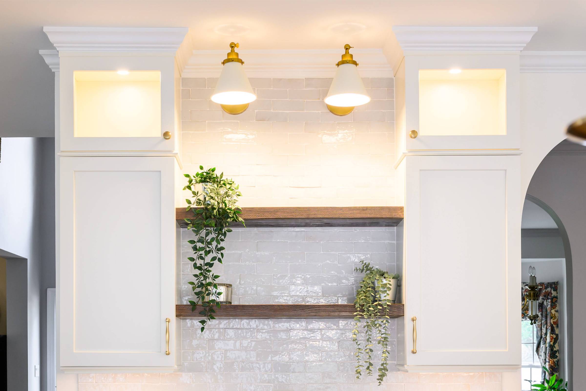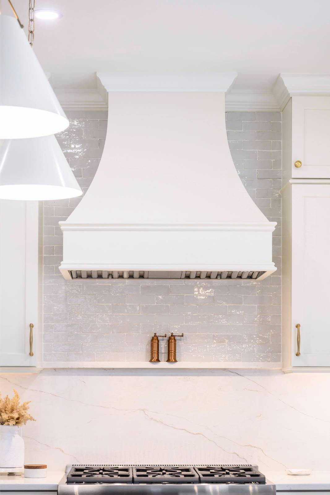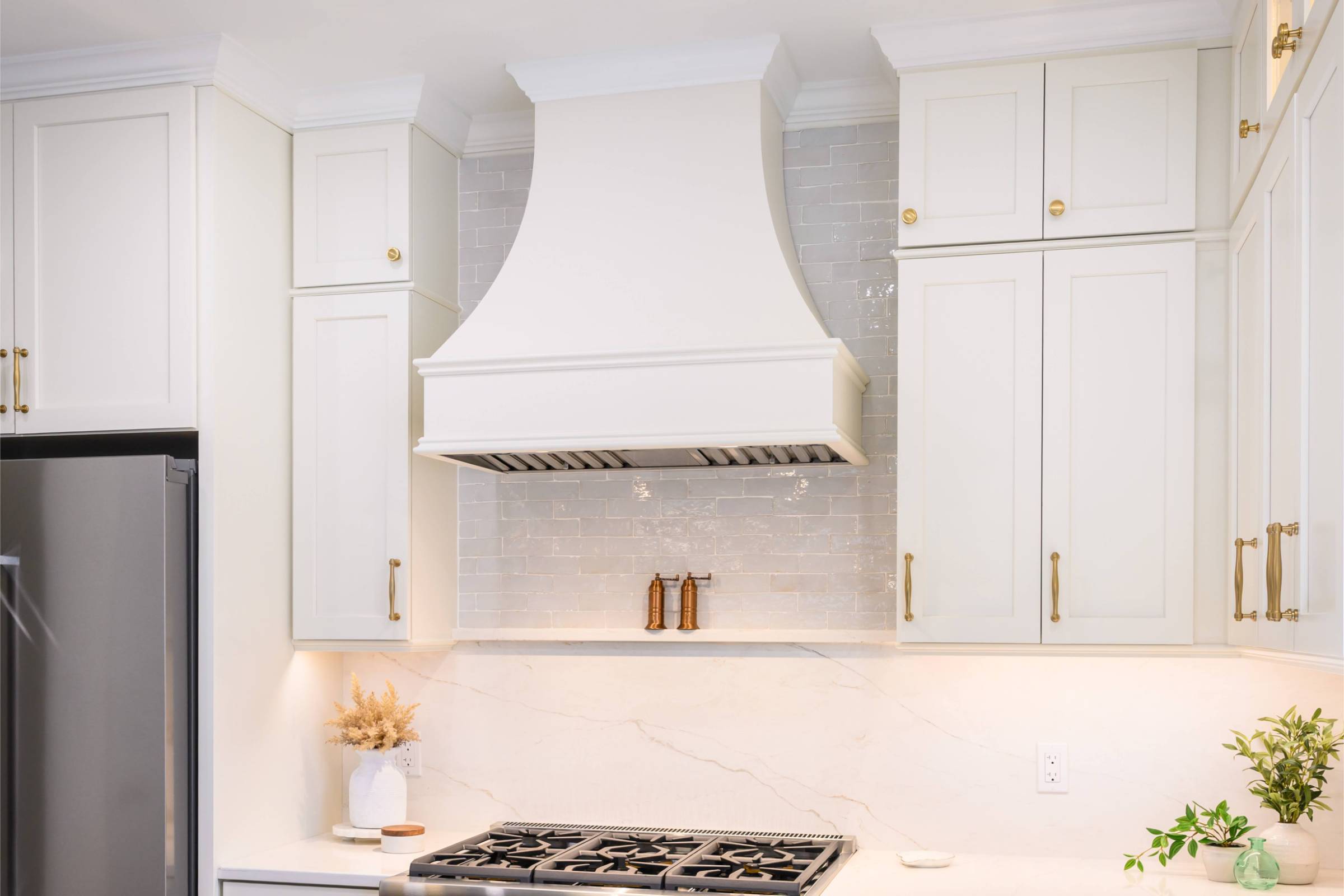 The countertops are a stunning white quartz with soft veining, and the island gets a special thick, mitered edge that makes it look like a piece of fine furniture. The custom wood range hood and matching floating shelves at the coffee bar add a cozy, natural touch that keeps the space from feeling too stark.