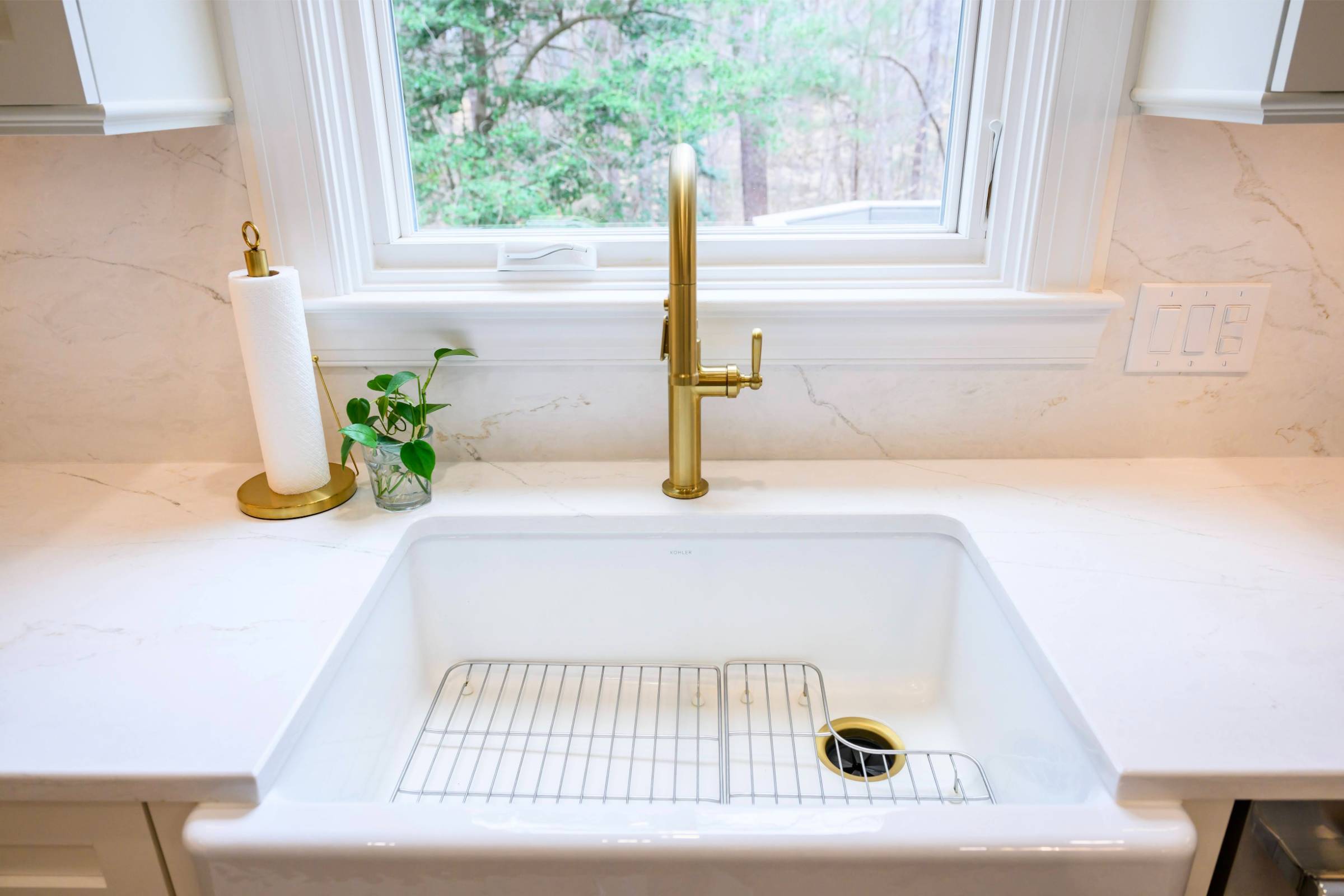 Gold hardware and fixtures are used throughout — from the cabinet pulls to the farmhouse sink faucet — tying everything together with a warm, luxurious feel.