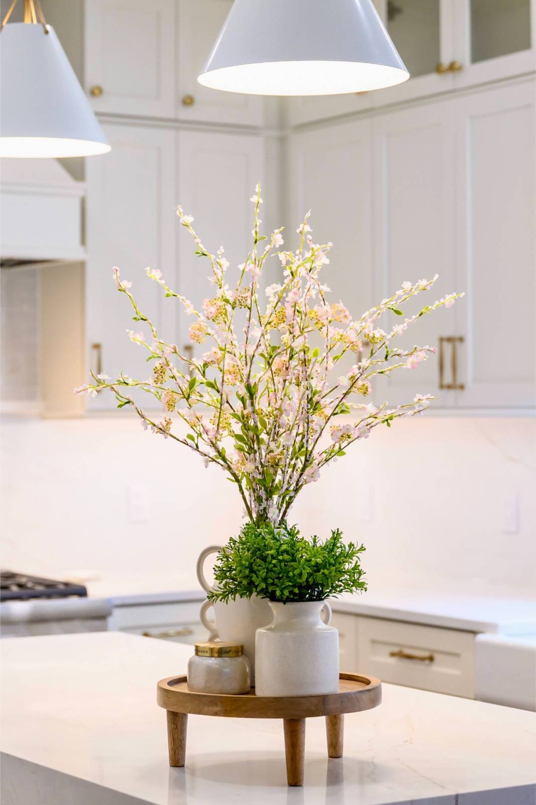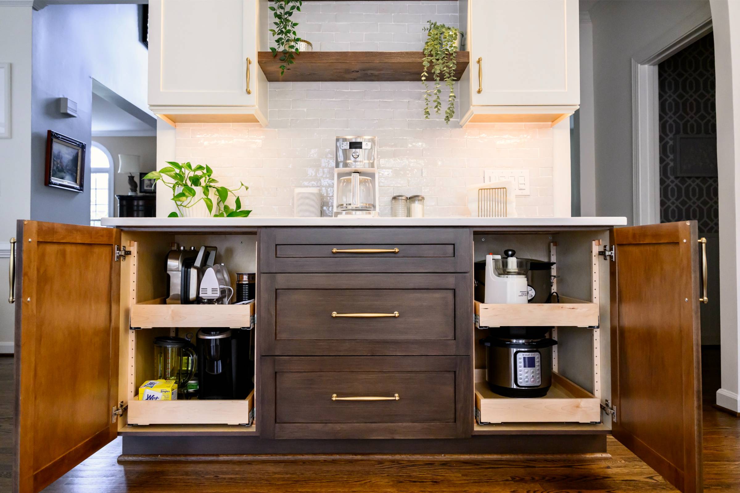 A built-in spice drawer next to the range, pull-out cabinet shelves, and a dedicated coffee bar station mean this kitchen is just as functional as it is beautiful. Everything has its place.