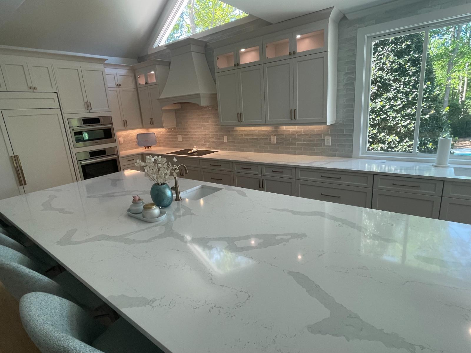 Designed to feel open, calm, and effortlessly refined, this kitchen centers around a generous island that anchors the entire space. Soft, custom cabinetry, layered lighting, and a sculpted hood detail create a timeless backdrop, while natural light pours in through oversized windows and a skylight above.