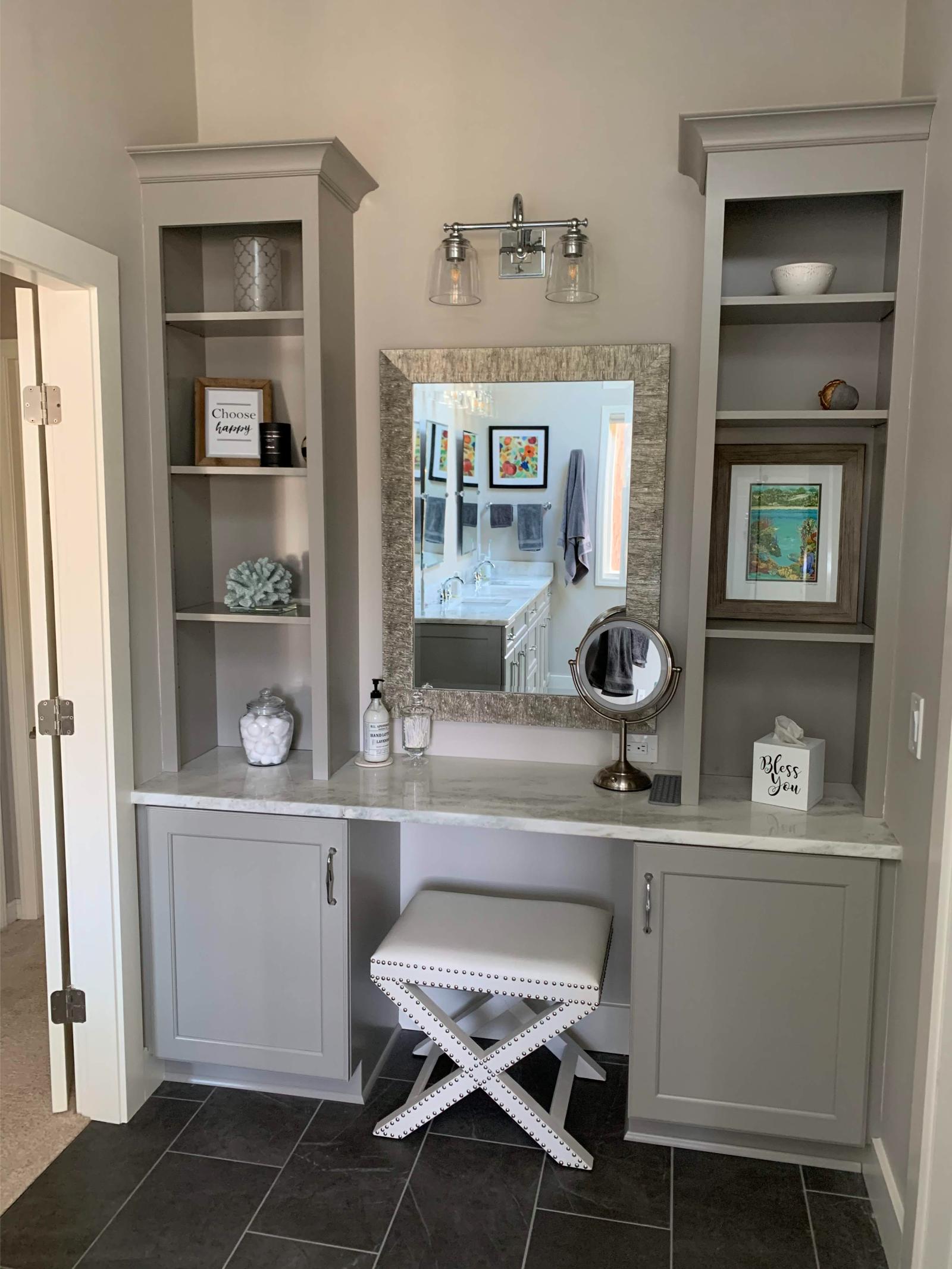 This bathroom was designed to feel calm, not trendy. Subtle pattern. Soft tones. Custom storage where it actually matters.