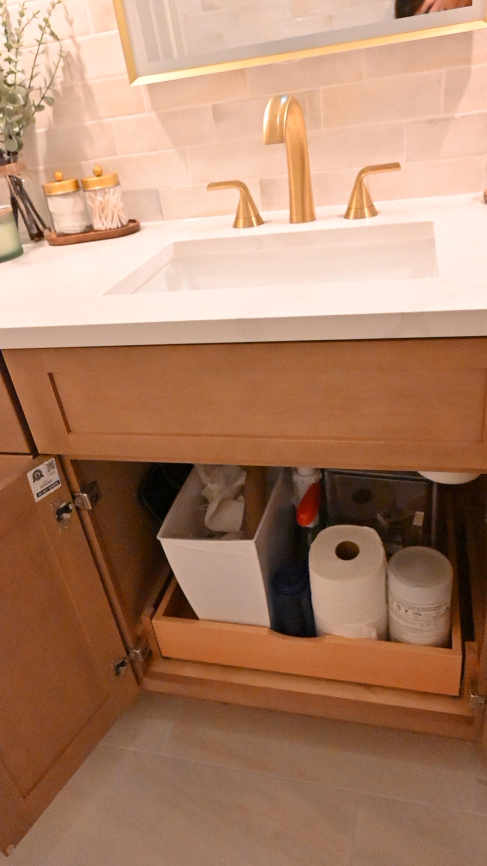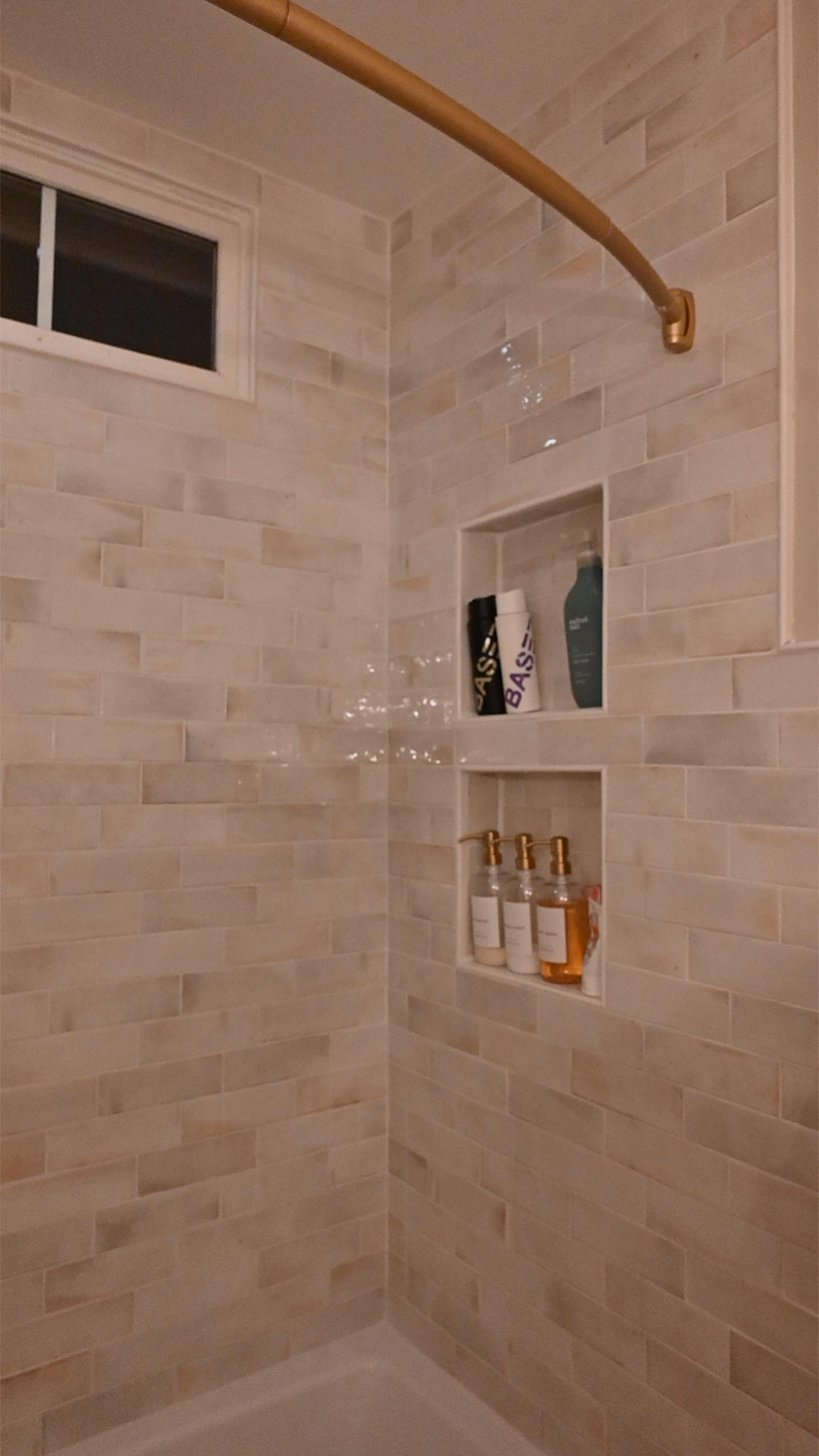 This bathroom was designed to feel like a private retreat. Custom wood cabinetry anchors the space, adding richness and contrast against the soft, neutral tilework.