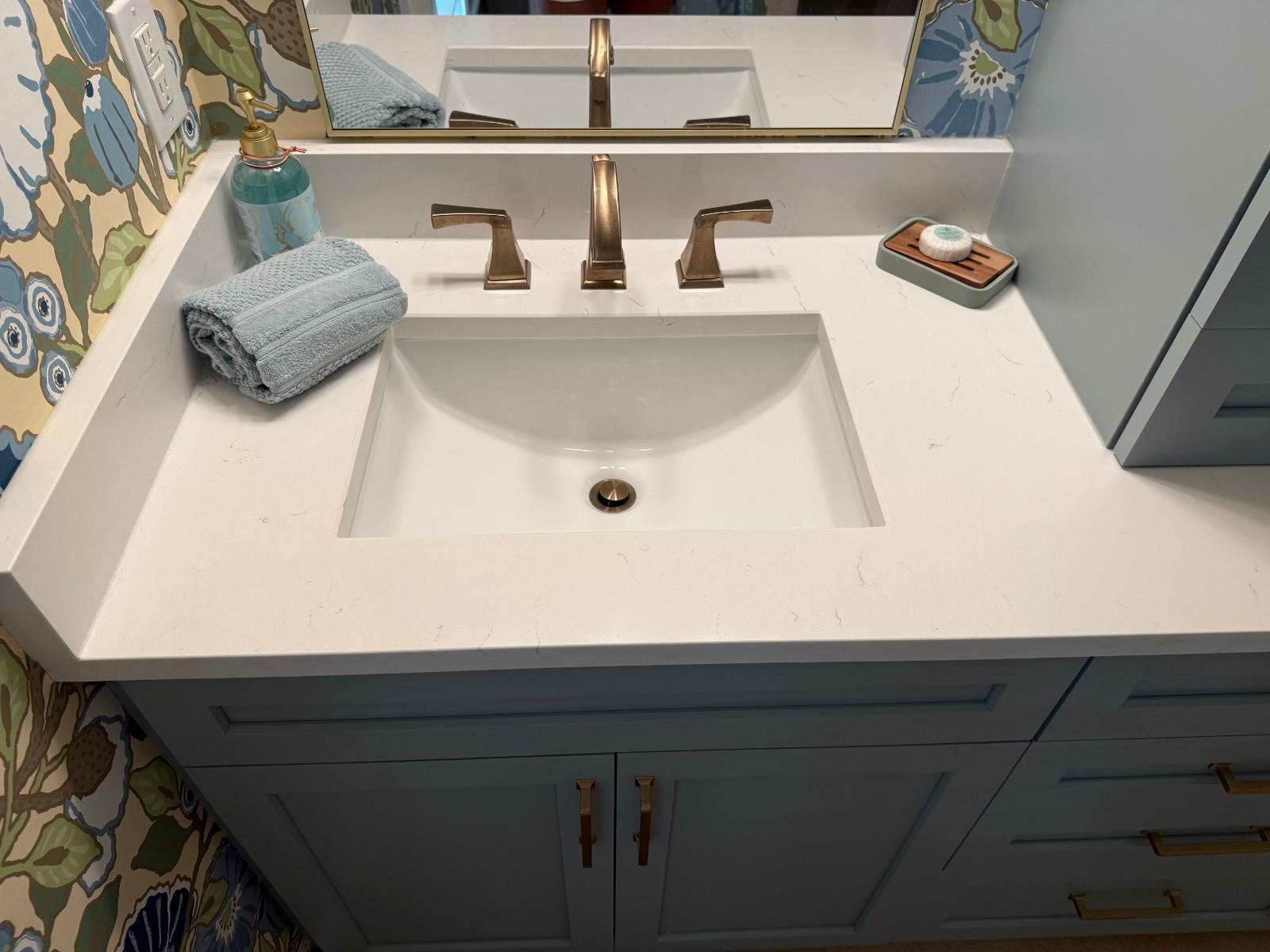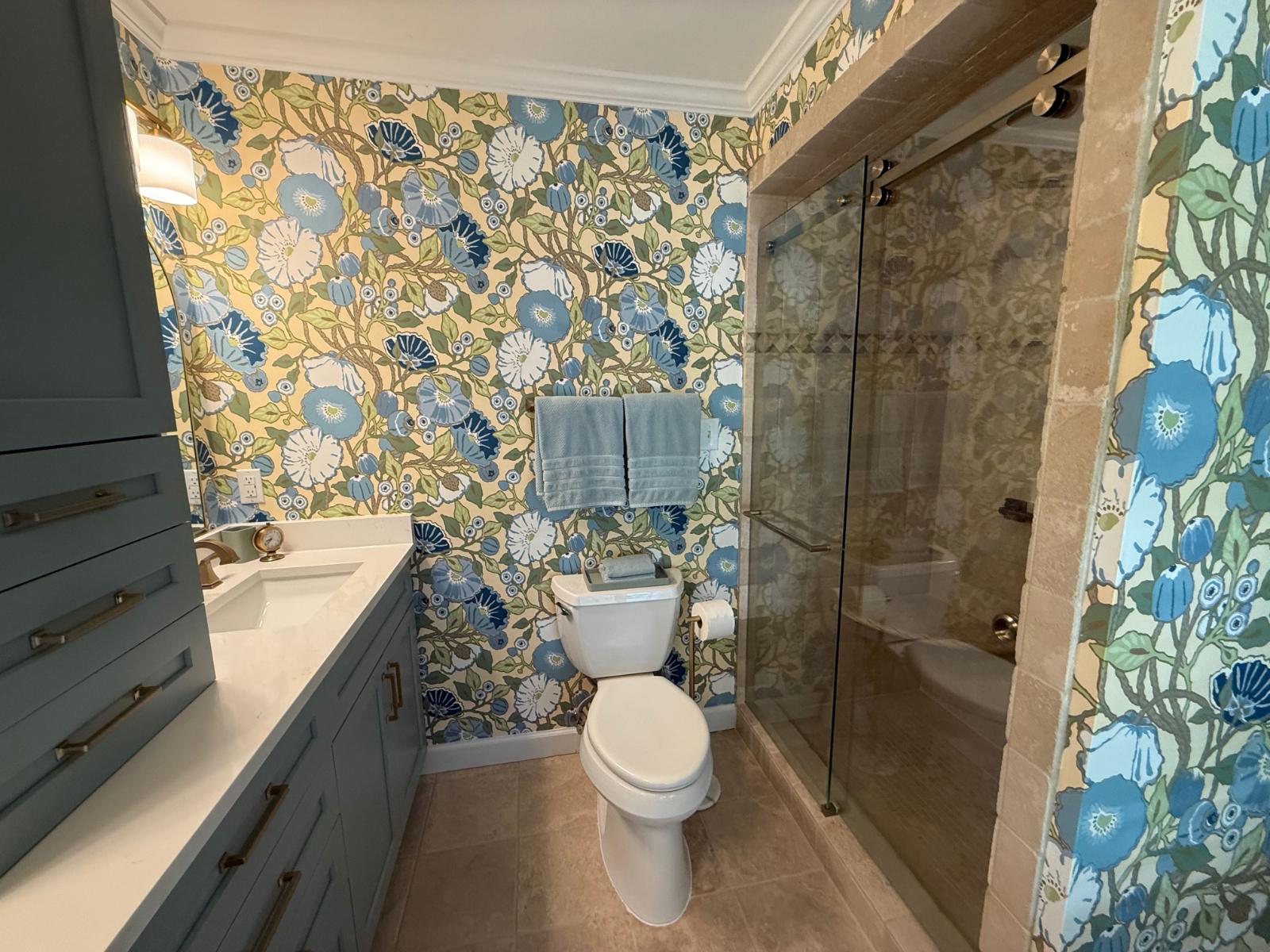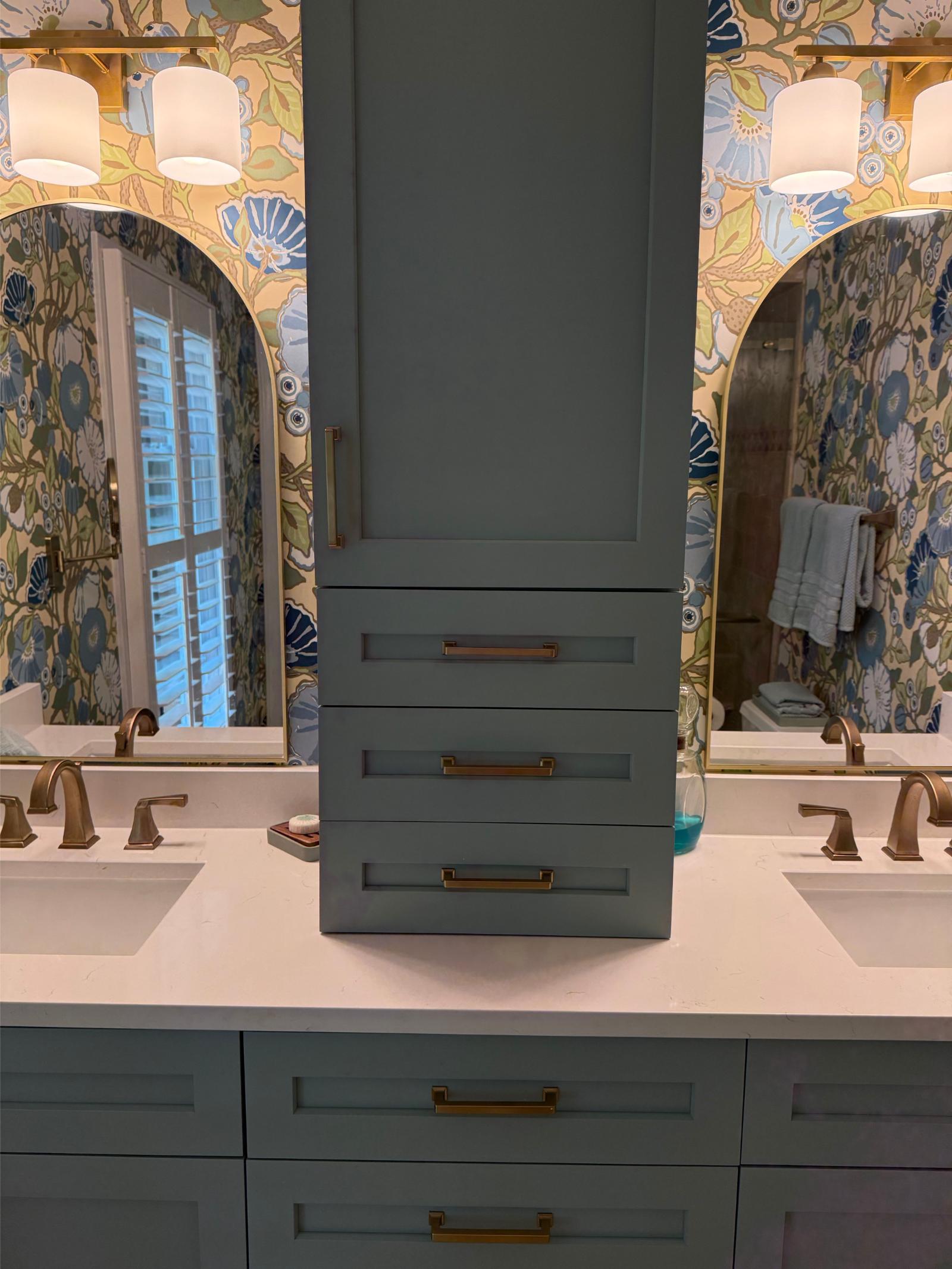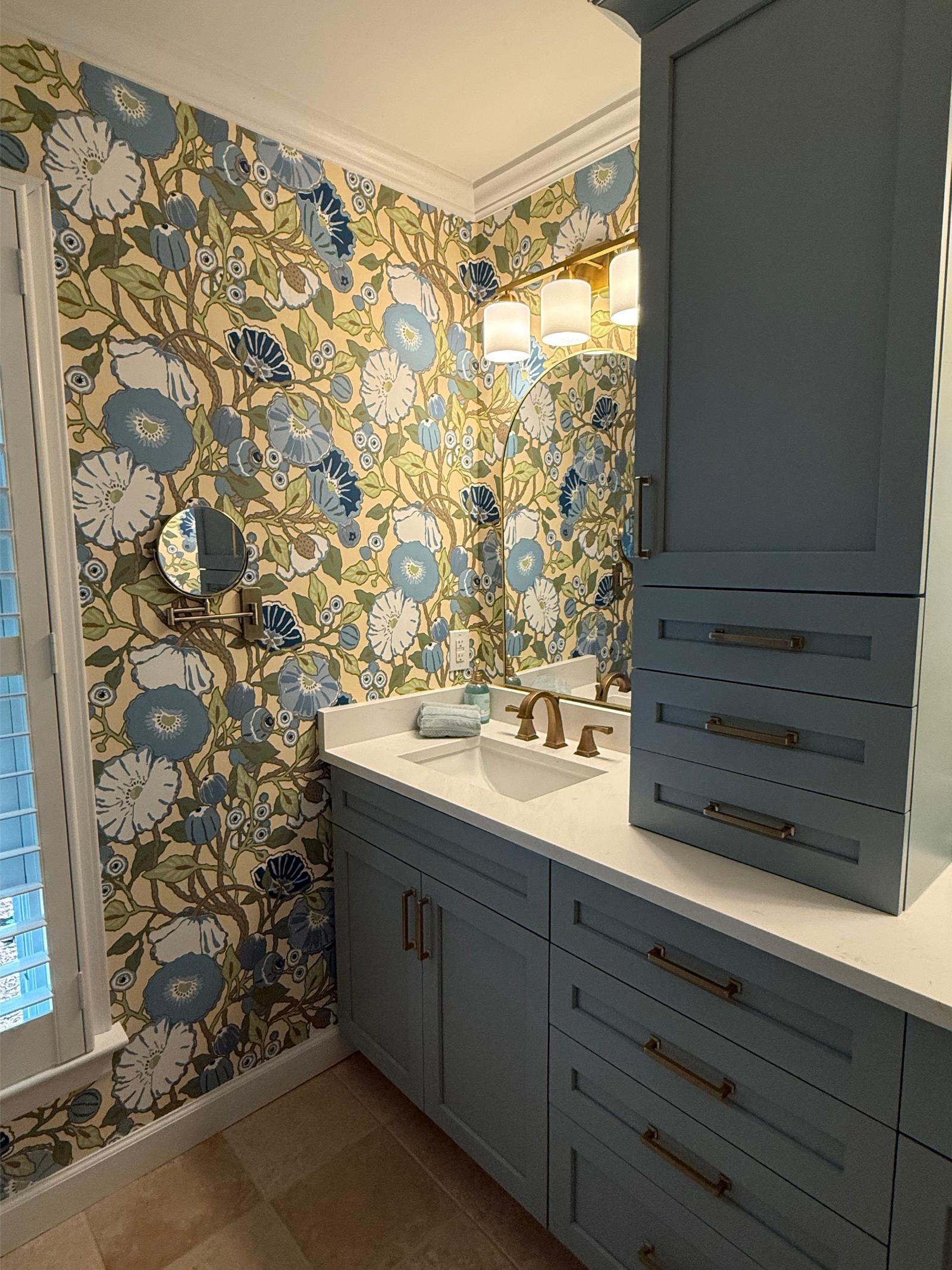 This master bathroom balances bold pattern with refined craftsmanship. Custom cabinetry in a muted blue anchors the space, paired with brass hardware and clean-lined countertops for a timeless feel.