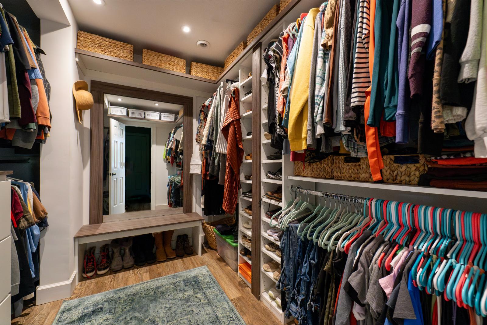 This custom walk-in closet was designed to keep daily routines simple and organized. Built-in shelving, hanging space, and dedicated shoe storage create room for everything, while warm wood tones keep the space feeling comfortable and inviting.