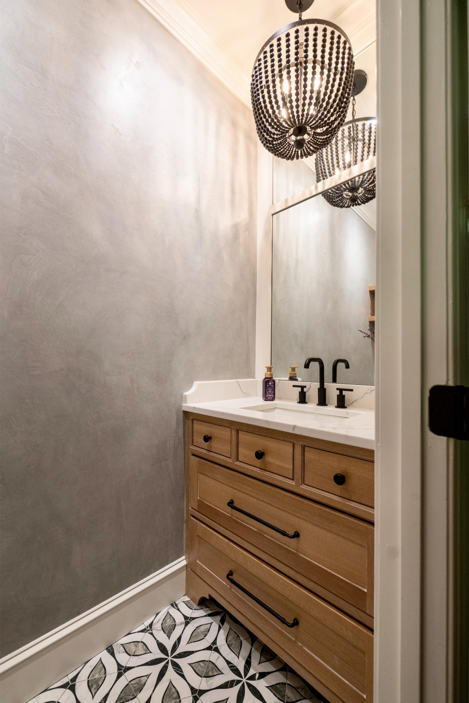 This powder bath is simple, clean, and full of detail. The warm wood vanity adds character, while the white countertop keeps the space bright. Soft gray textured walls and black fixtures give it a modern look without feeling cold.