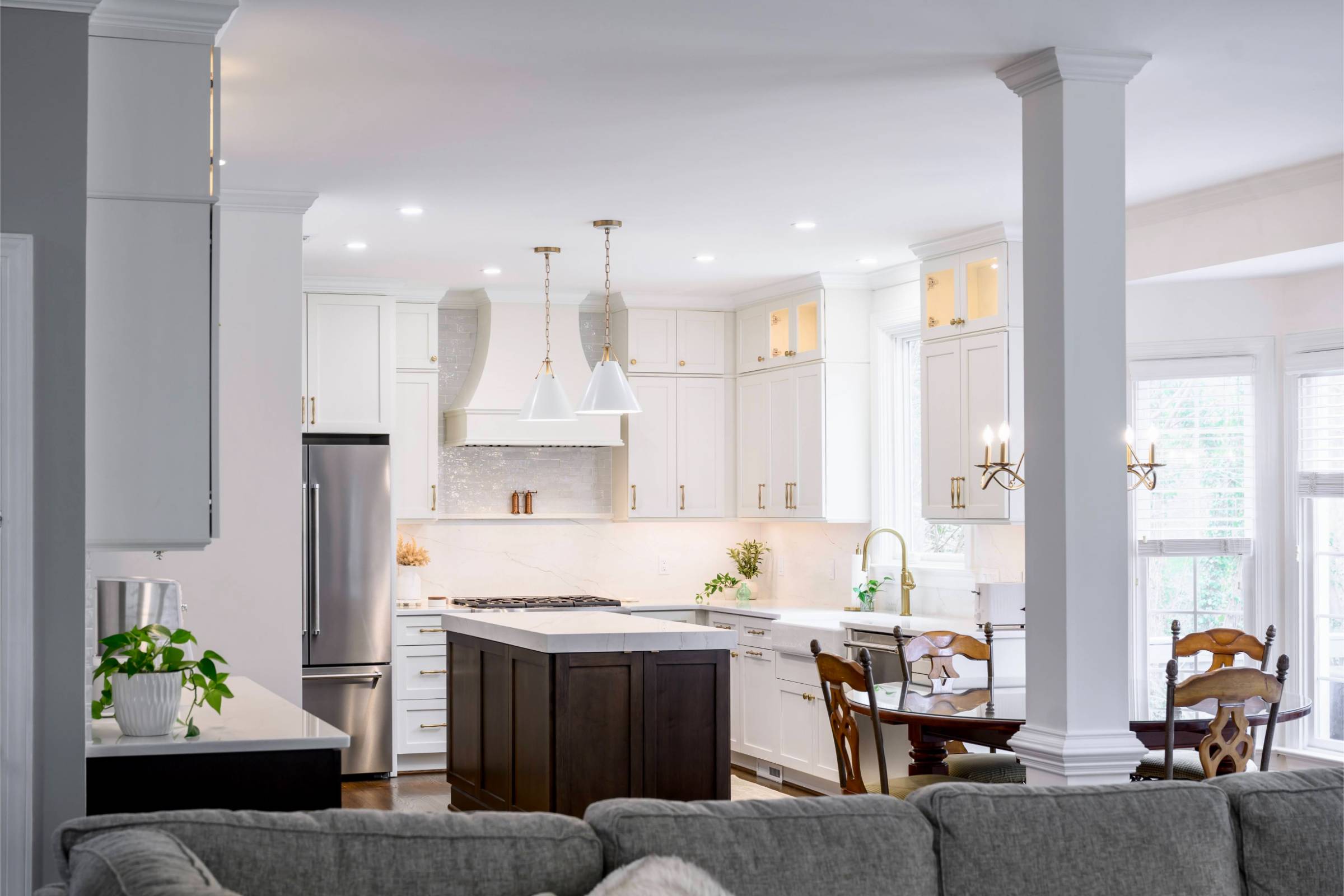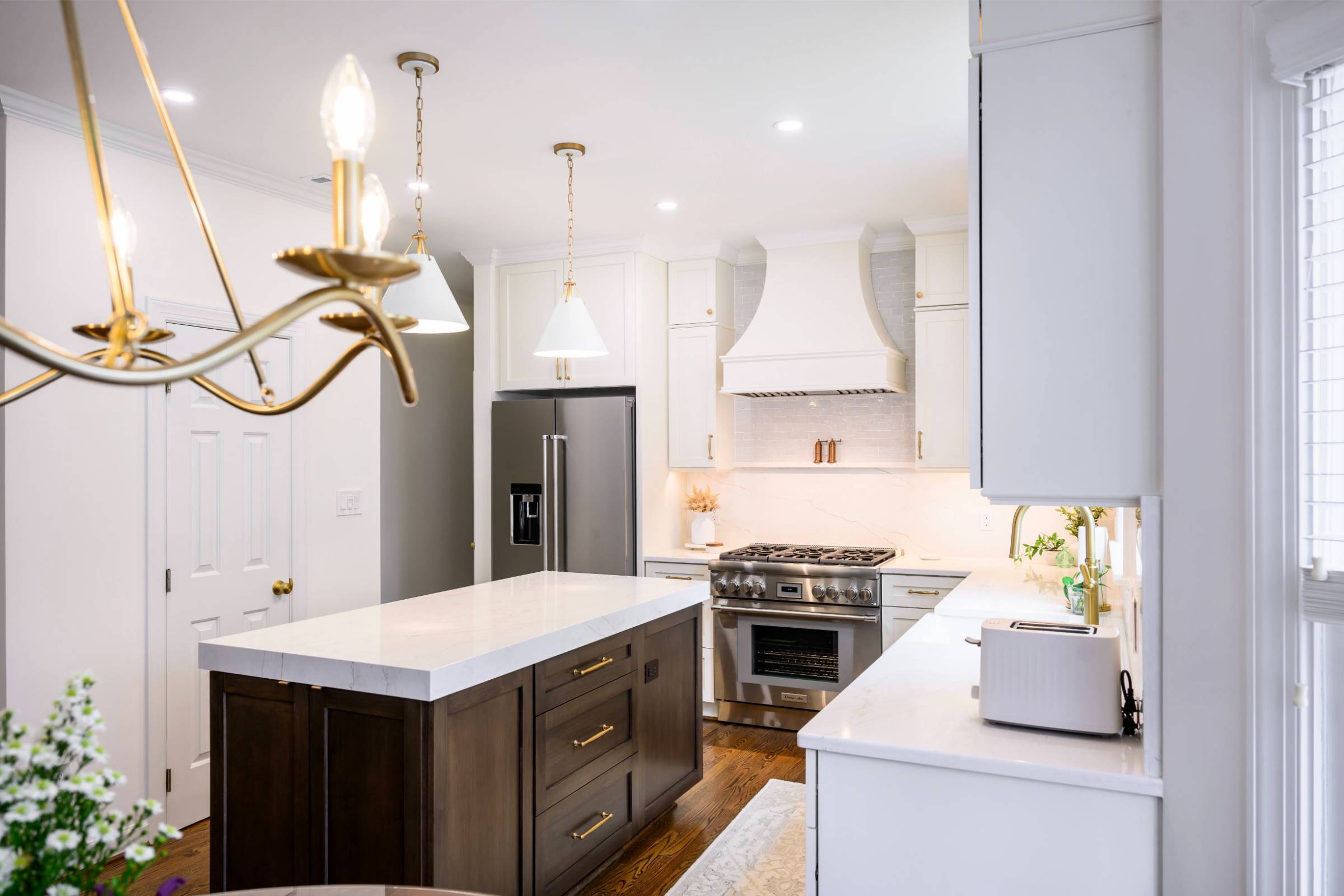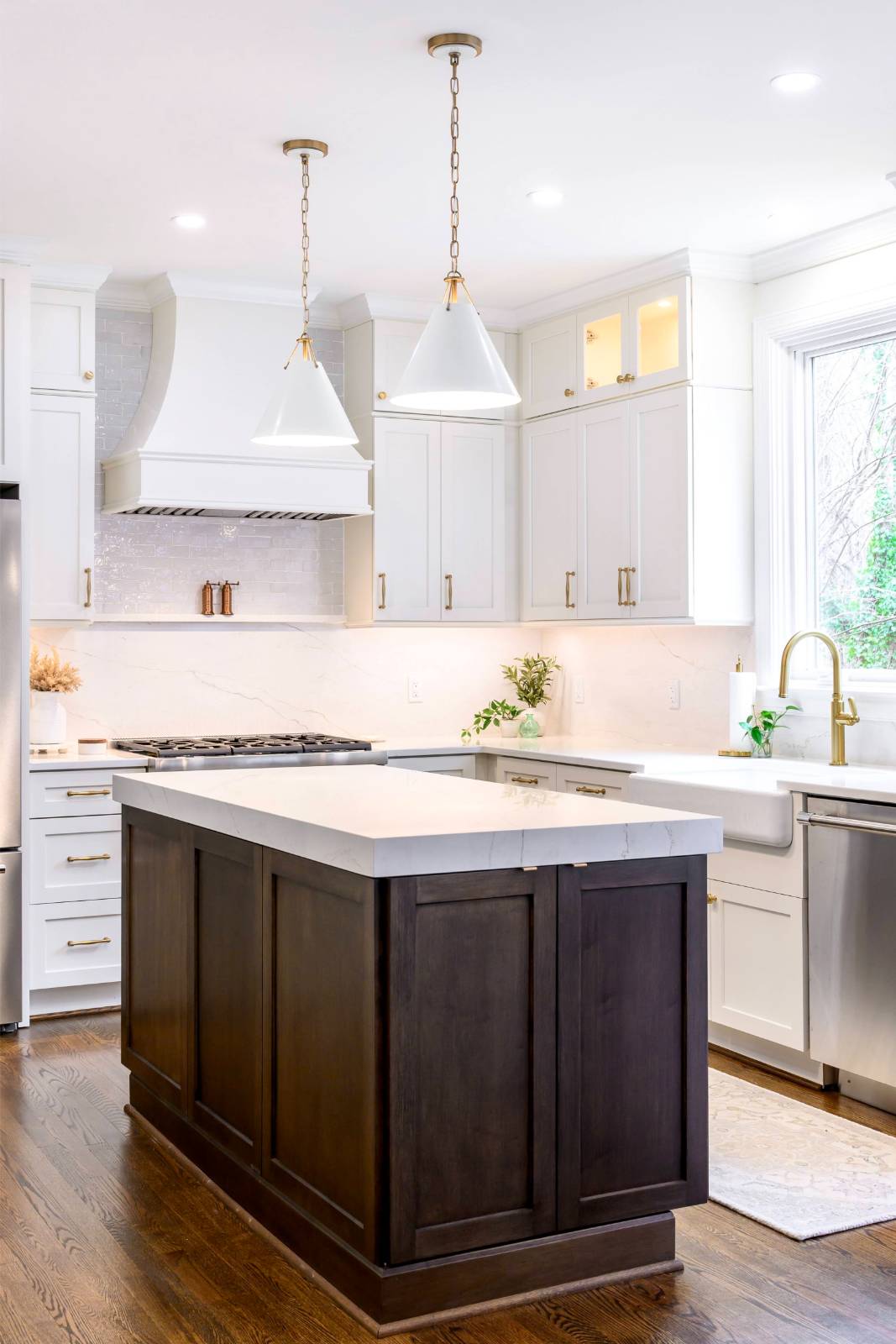 This kitchen transformation is all about warmth meeting brightness. Crisp white cabinets wrap the perimeter while a rich, dark-stained wood island takes center stage — giving the space a beautiful contrast that feels both classic and fresh.