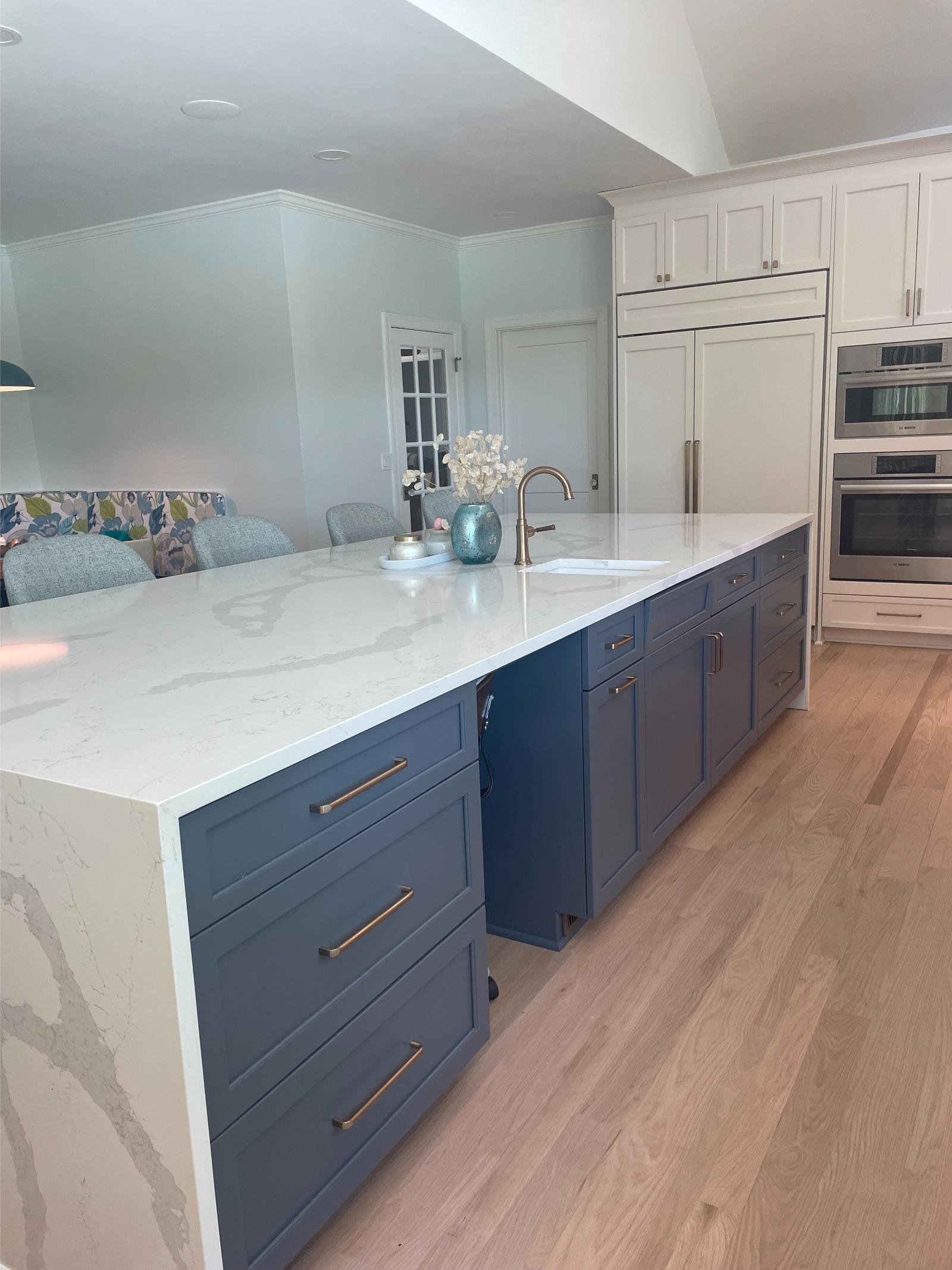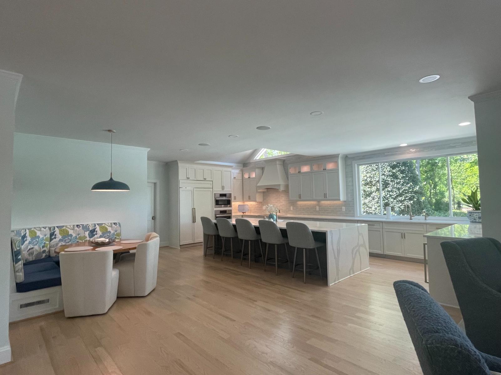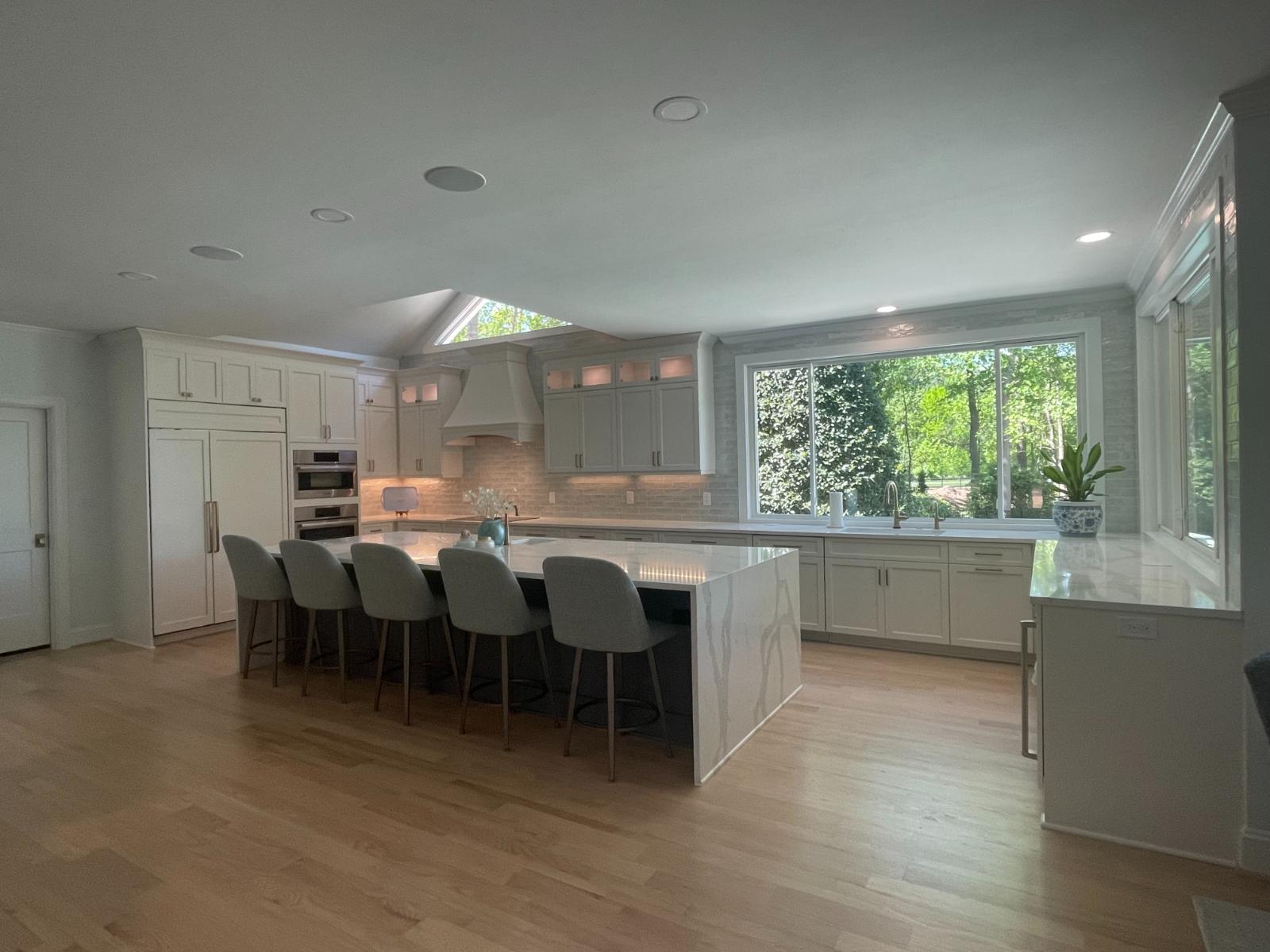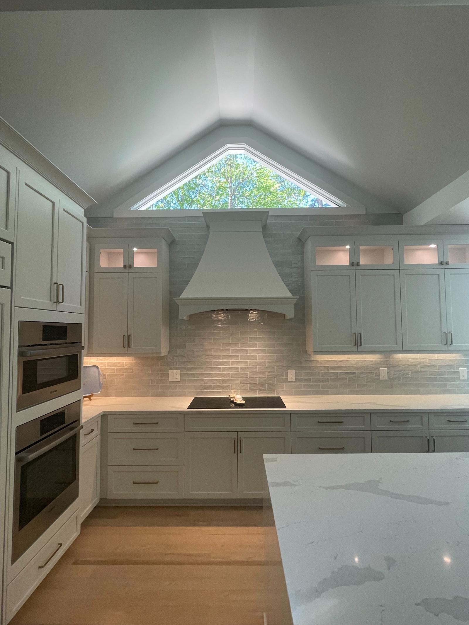Designed to feel open, calm, and effortlessly refined, this kitchen centers around a generous island that anchors the entire space. Soft, custom cabinetry, layered lighting, and a sculpted hood detail create a timeless backdrop, while natural light pours in through oversized windows and a skylight above.