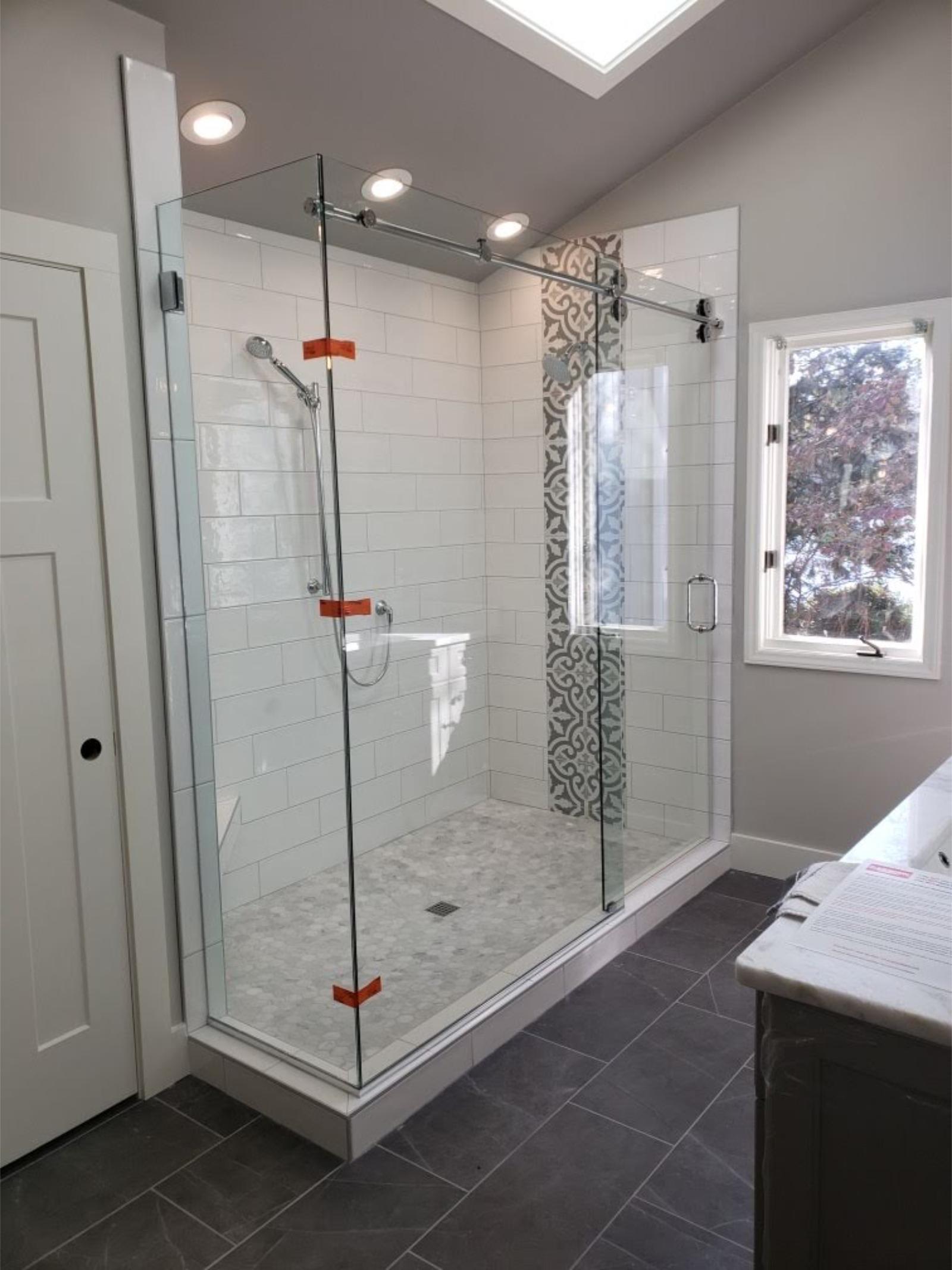This bathroom was designed to feel calm, not trendy. Subtle pattern. Soft tones. Custom storage where it actually matters.