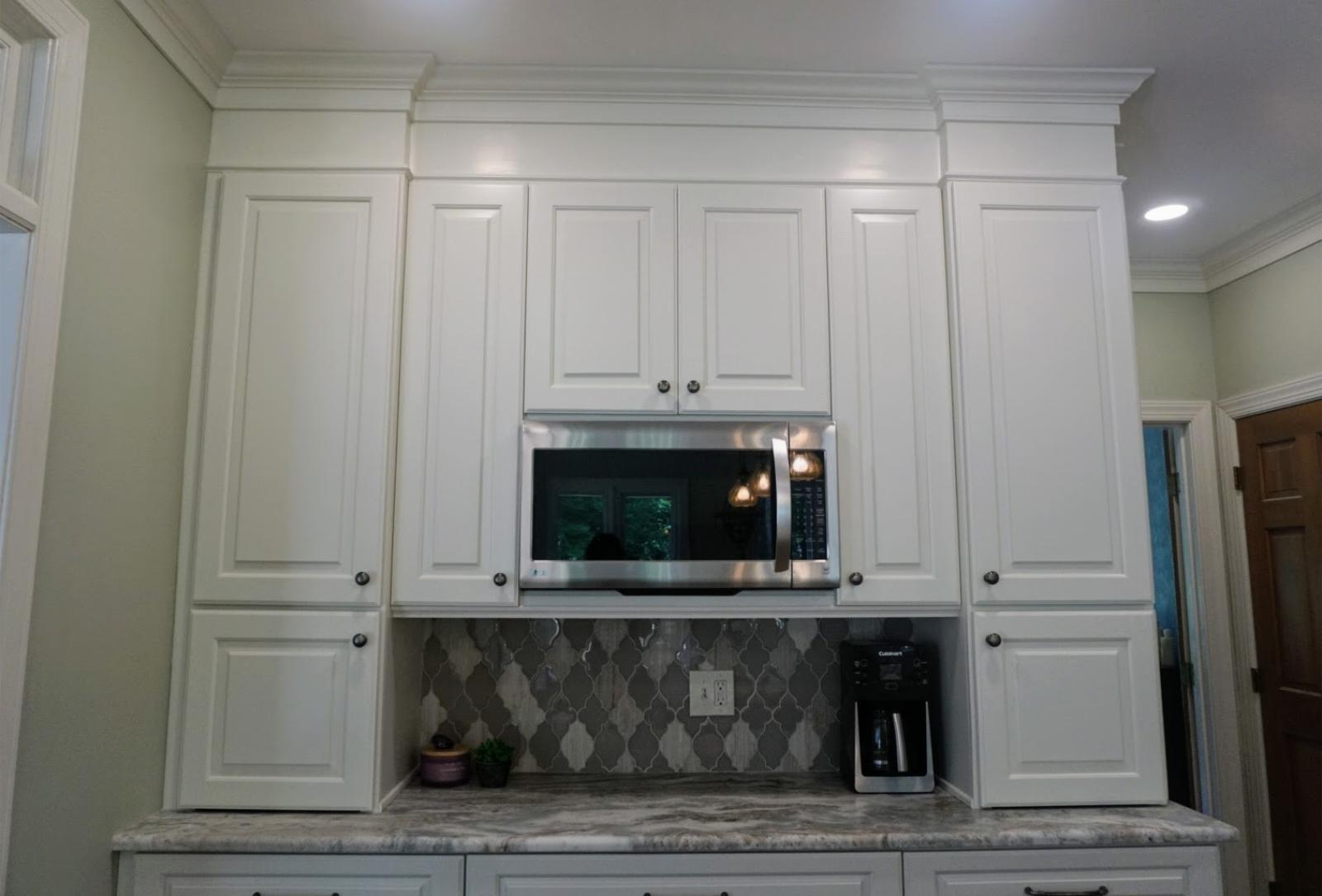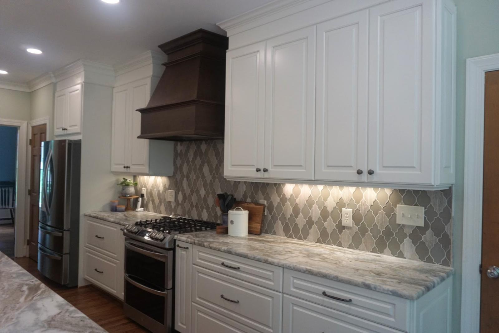 This kitchen blends clean white cabinetry with a warm wood island for a timeless, welcoming feel. A large island creates space for seating and everyday use, while custom details like the wood hood and patterned backsplash add character without overpowering the room. Designed to be both beautiful and practical for daily living.